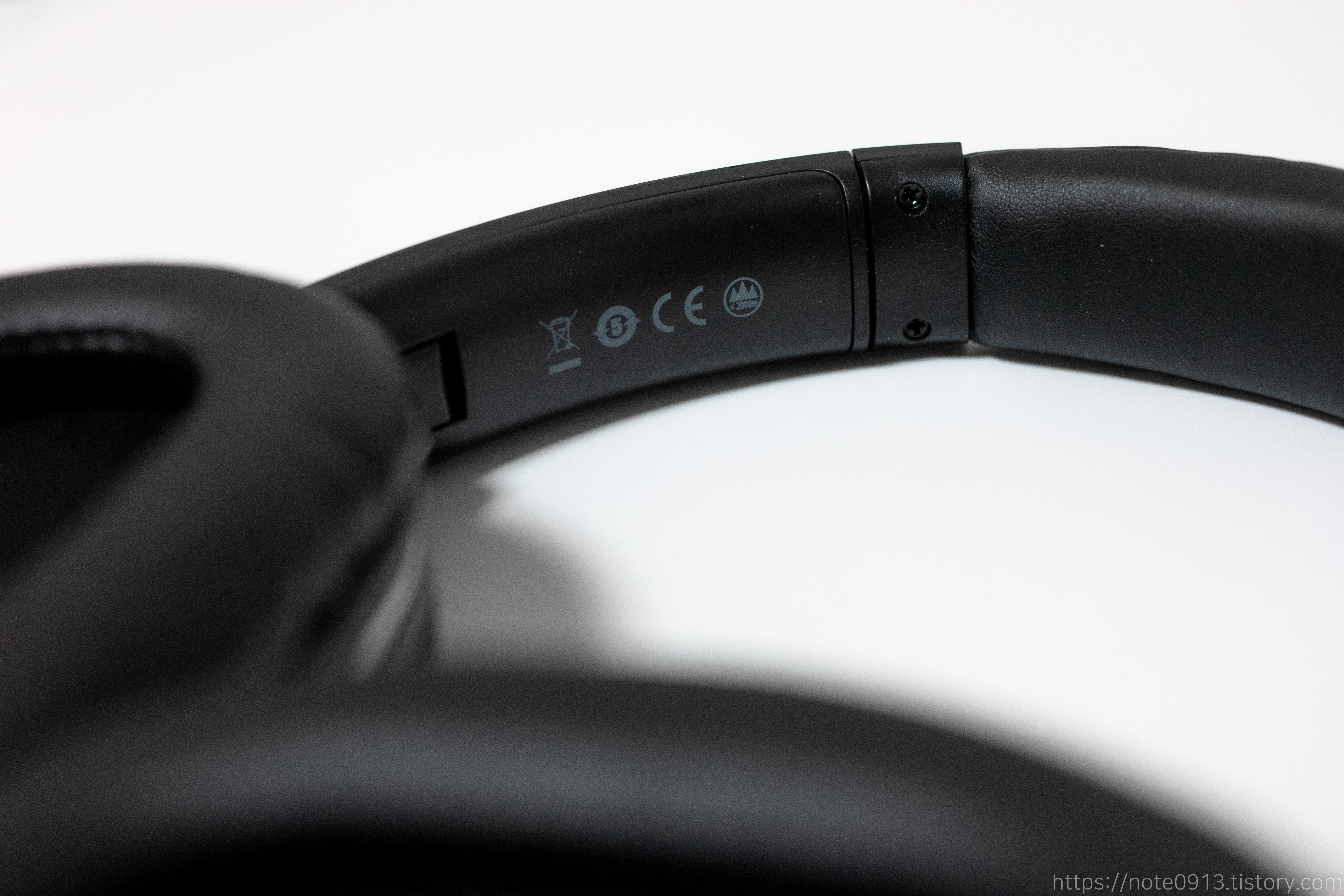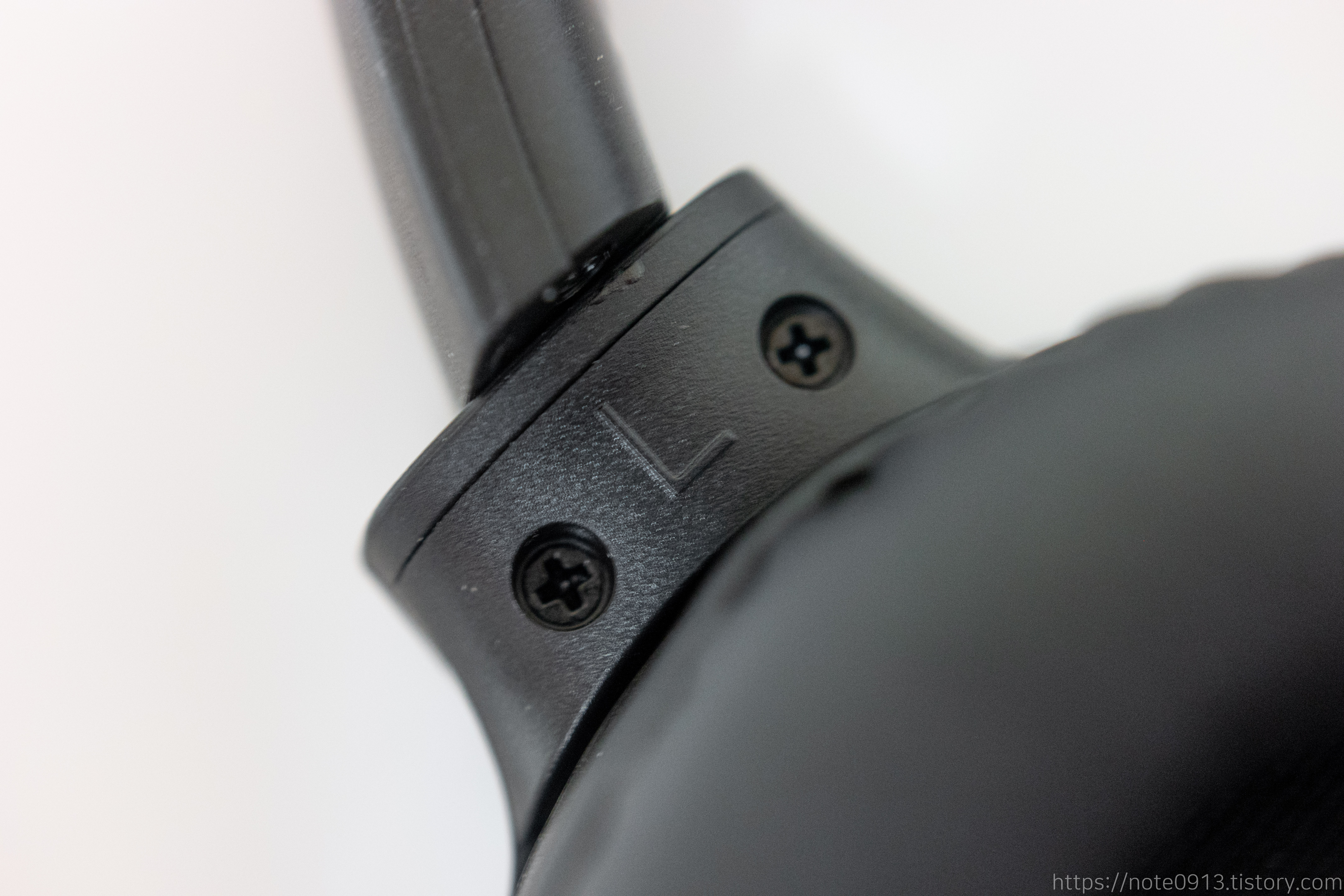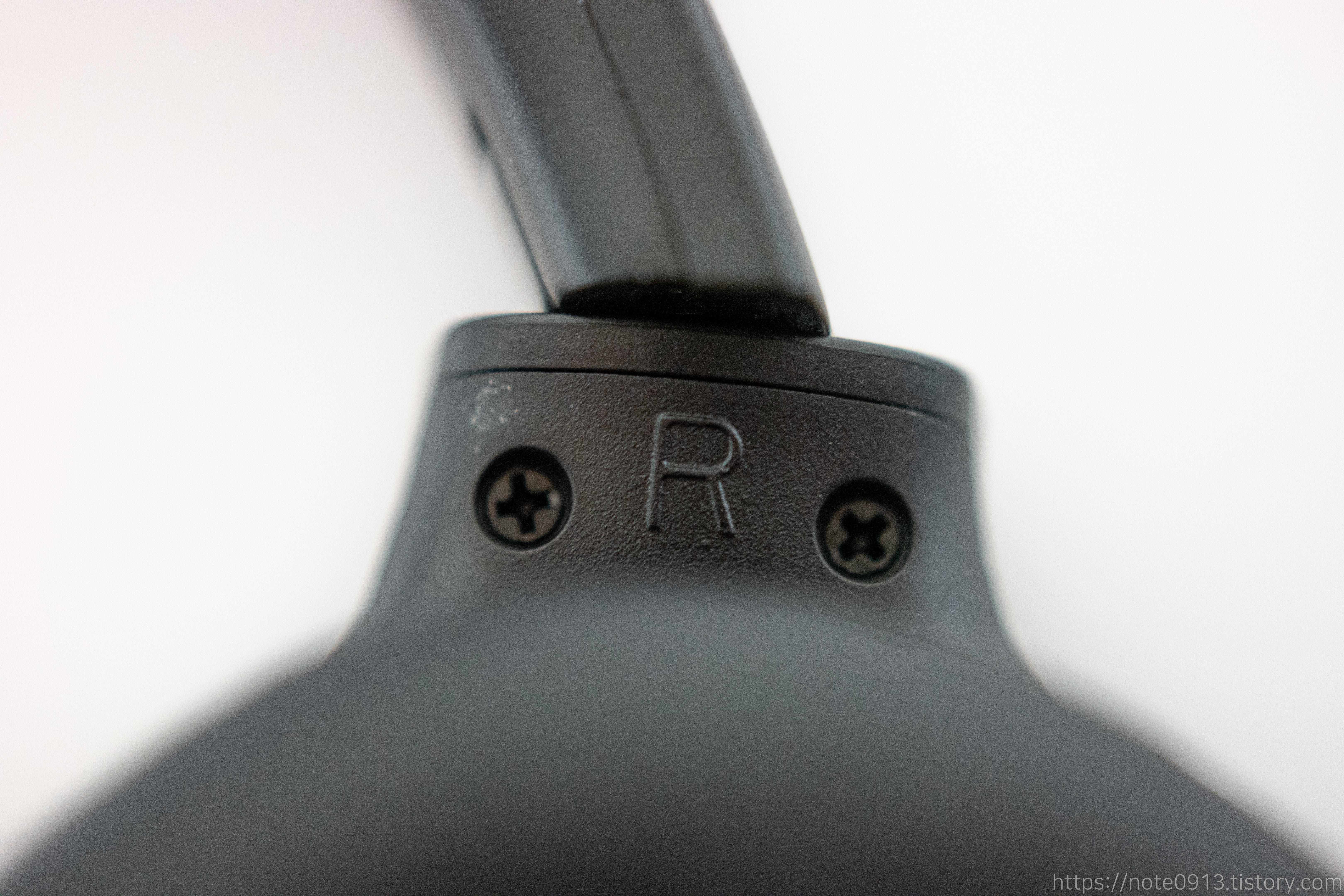 헤드폰 관절부분입니다. L / R 이 적혀있습니다. 앞쪽으로는 15도 정도 회전할 수 있고 뒤쪽으로는 90도까지 회전이 가능해서 보관할 때 용이하고 착용할 때도 좀 더 편할 것 같습니다.