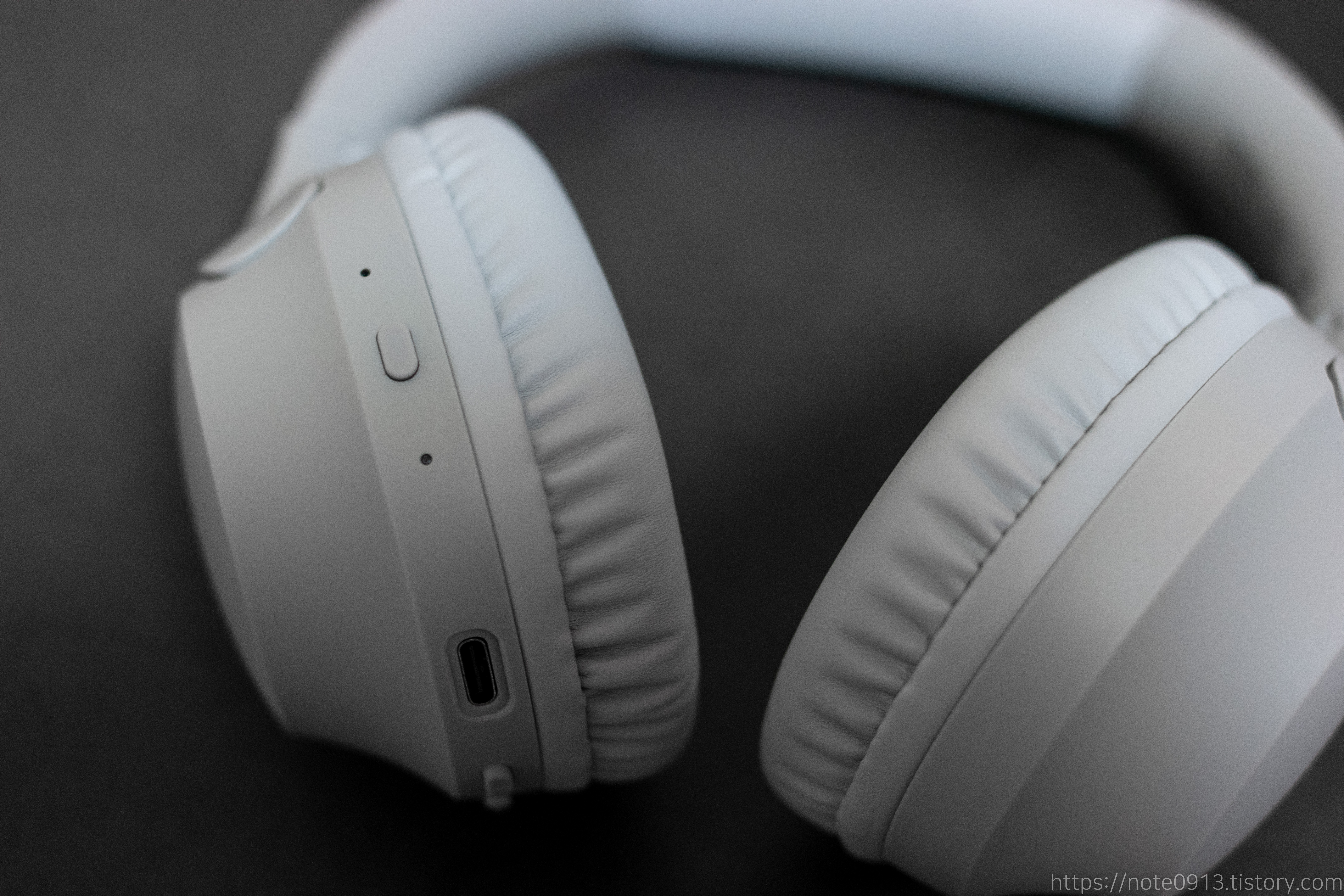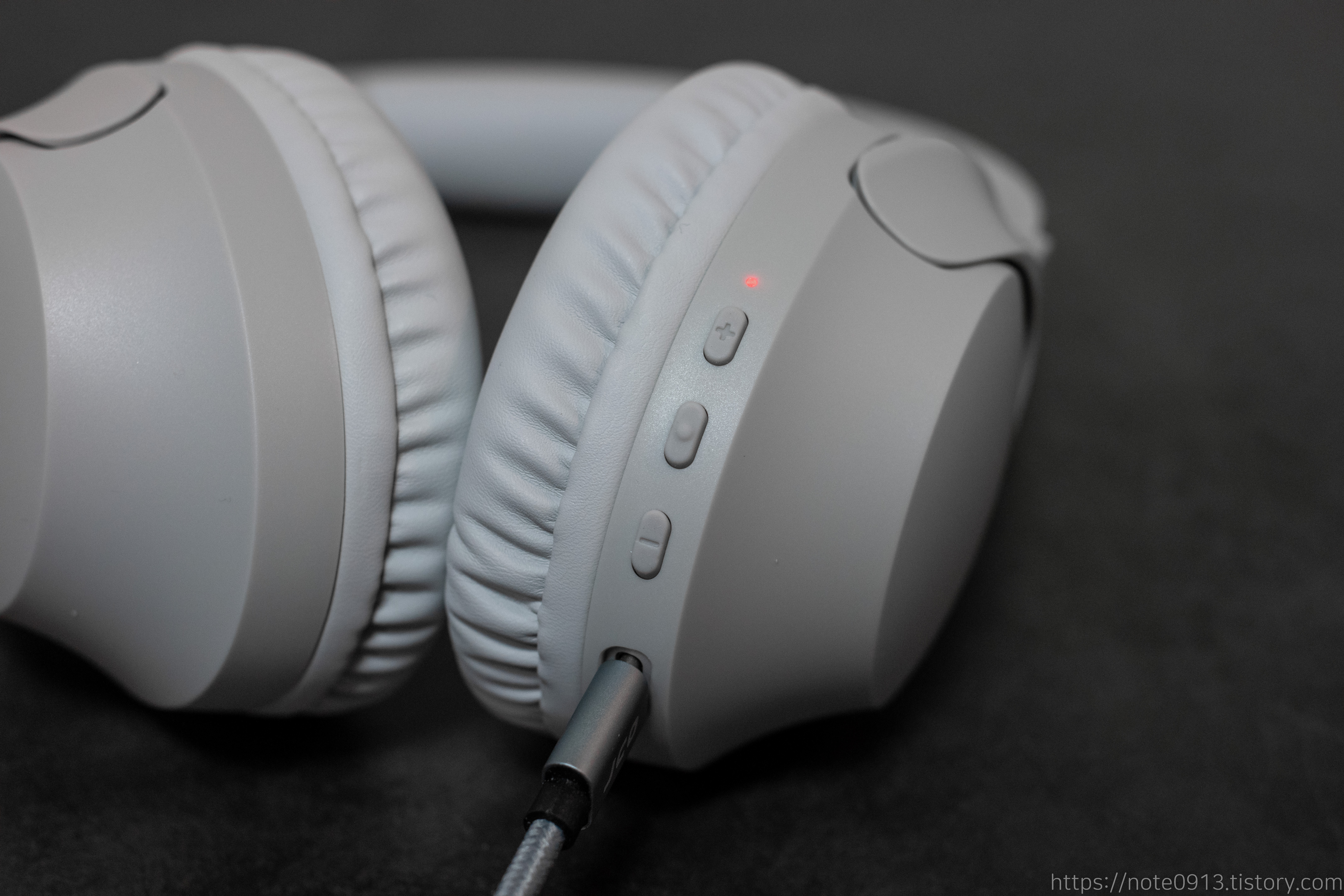 버튼부분입니다. 버튼은 오른쪽 유닛에 있어서 버튼을 조작하려면 오른손으로 조작해야 합니다. 상태표시 LED, 볼륨 + / 다음곡 버튼, 다기능 버튼(MFB, 재생/일시정지/전화받기/거절/보이스 어시스턴트), 볼륨 - / 이전곡 버튼이 있으며 충전단자는 C타입으로 되어있습니다.