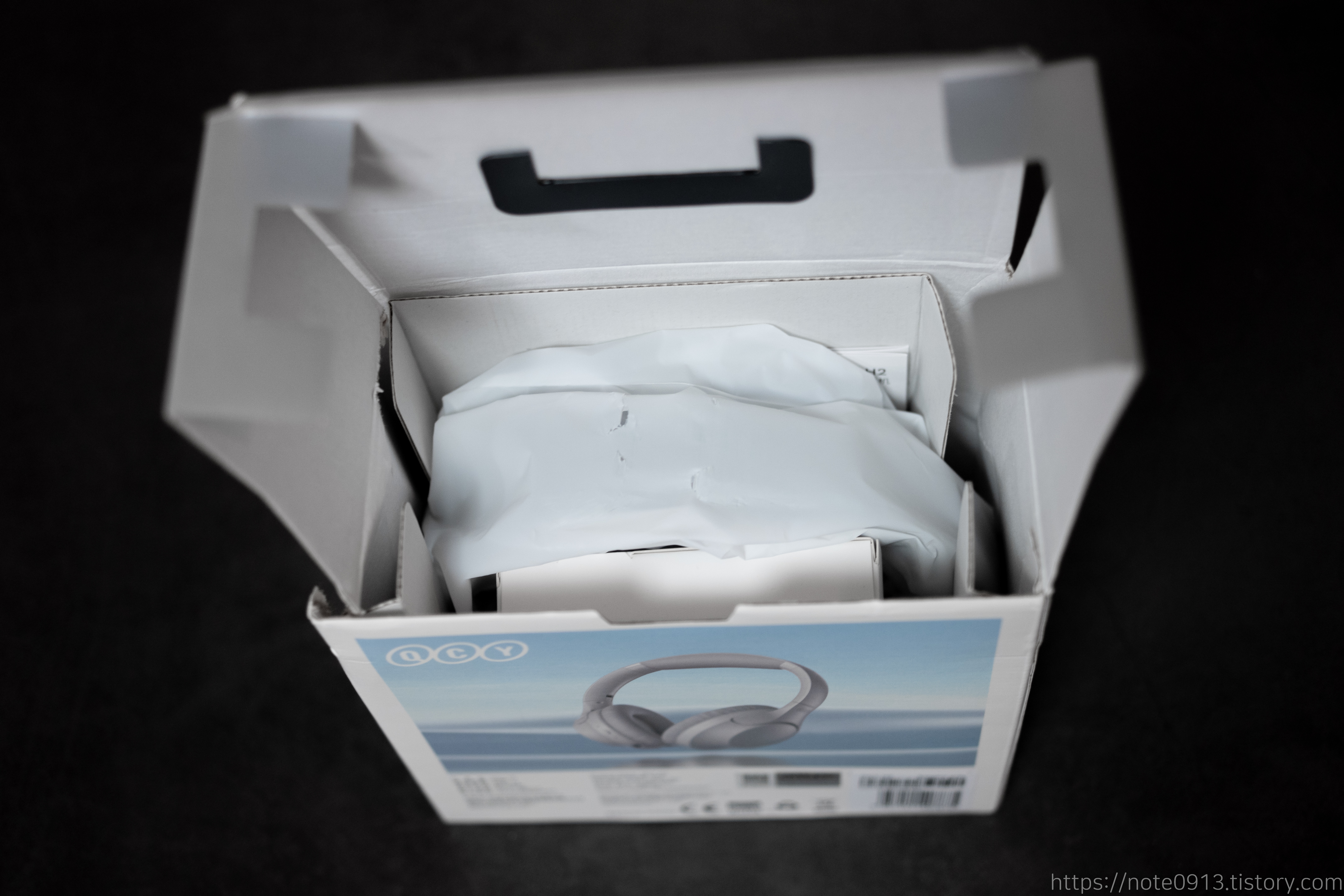 박스를 열면 위와 같이 비닐에 덮인 헤드폰이 보입니다. 원가절감을 위해서인지 박스 구성은 좋지않습니다.