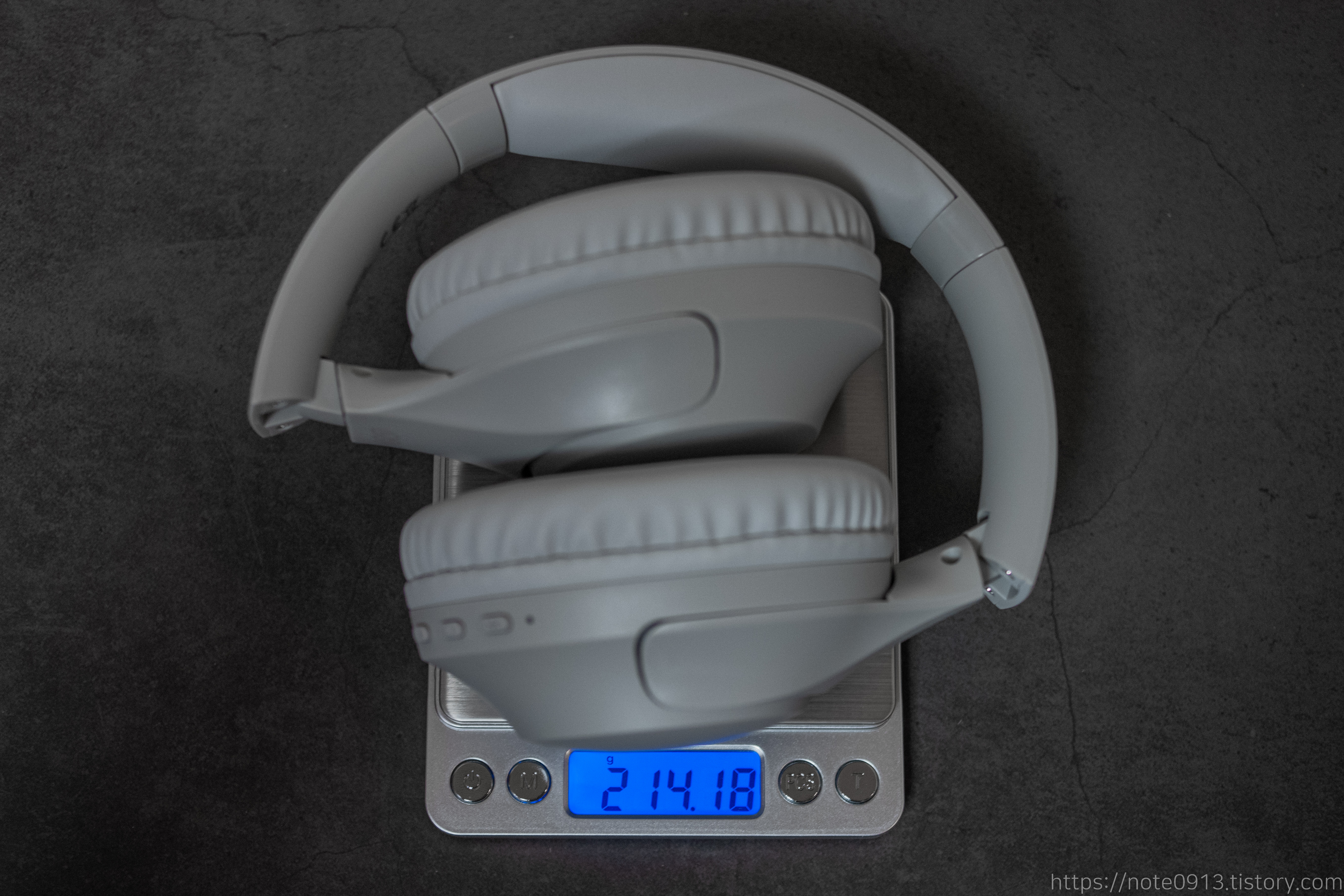 저울로 무게를 측정해보니 QCY H2 헤드폰의 무게는 214.18g 으로 측정됩니다.