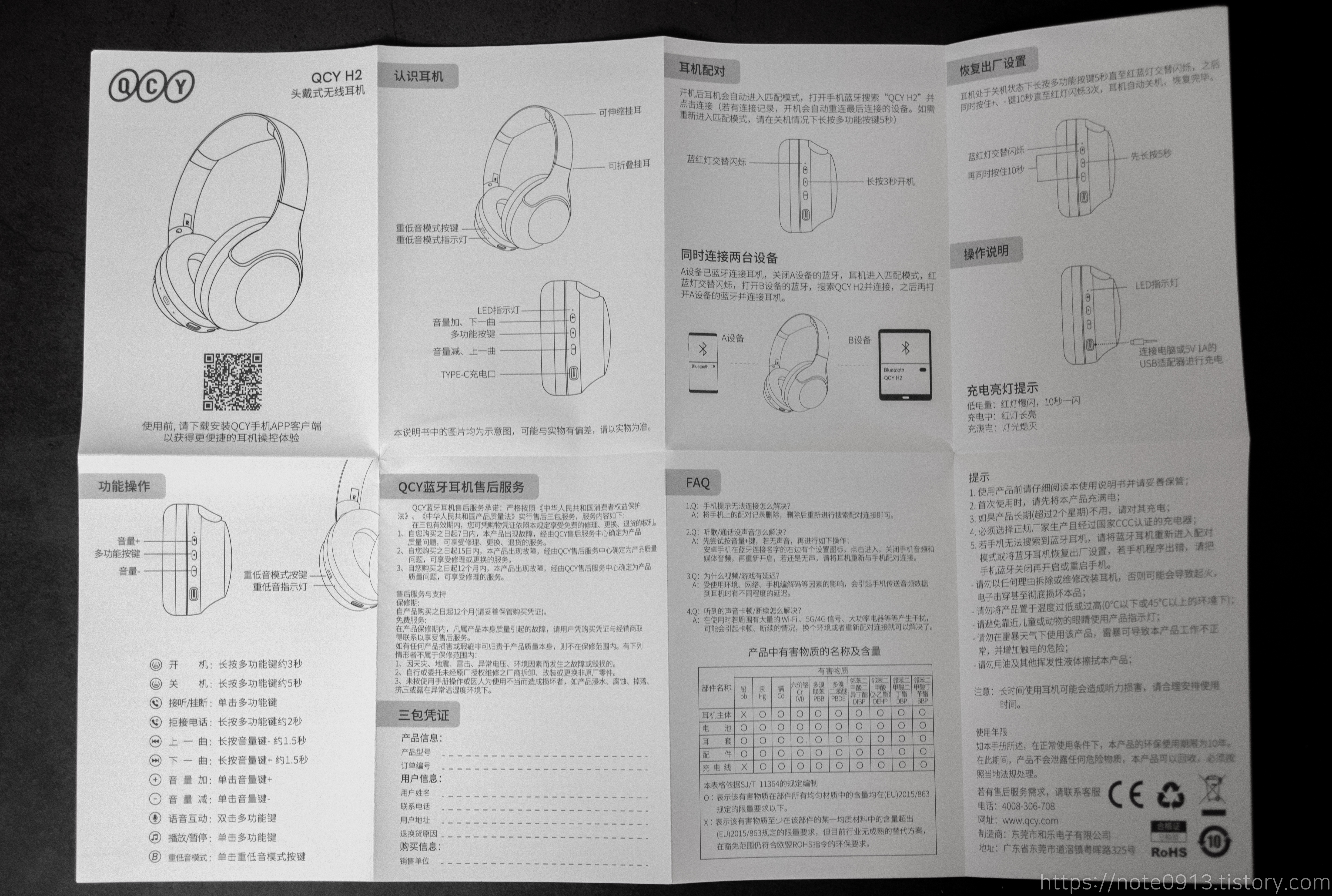 QCY H2 헤드폰 설명서입니다. 헤드폰이라서 그런지 설명서도 큼직합니다.