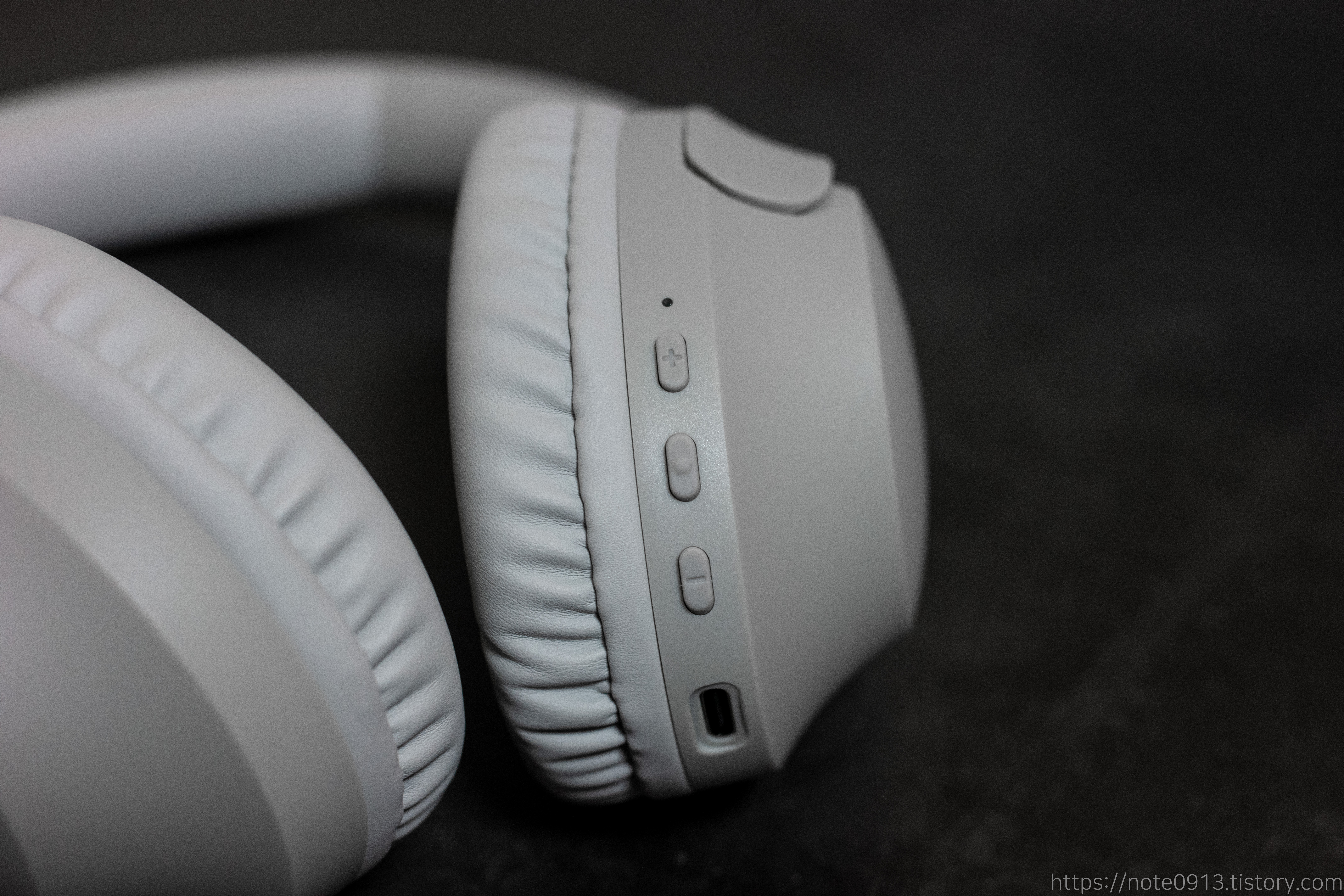 버튼부분입니다. 버튼은 오른쪽 유닛에 있어서 버튼을 조작하려면 오른손으로 조작해야 합니다. 상태표시 LED, 볼륨 + / 다음곡 버튼, 다기능 버튼(MFB, 재생/일시정지/전화받기/거절/보이스 어시스턴트), 볼륨 - / 이전곡 버튼이 있으며 충전단자는 C타입으로 되어있습니다.