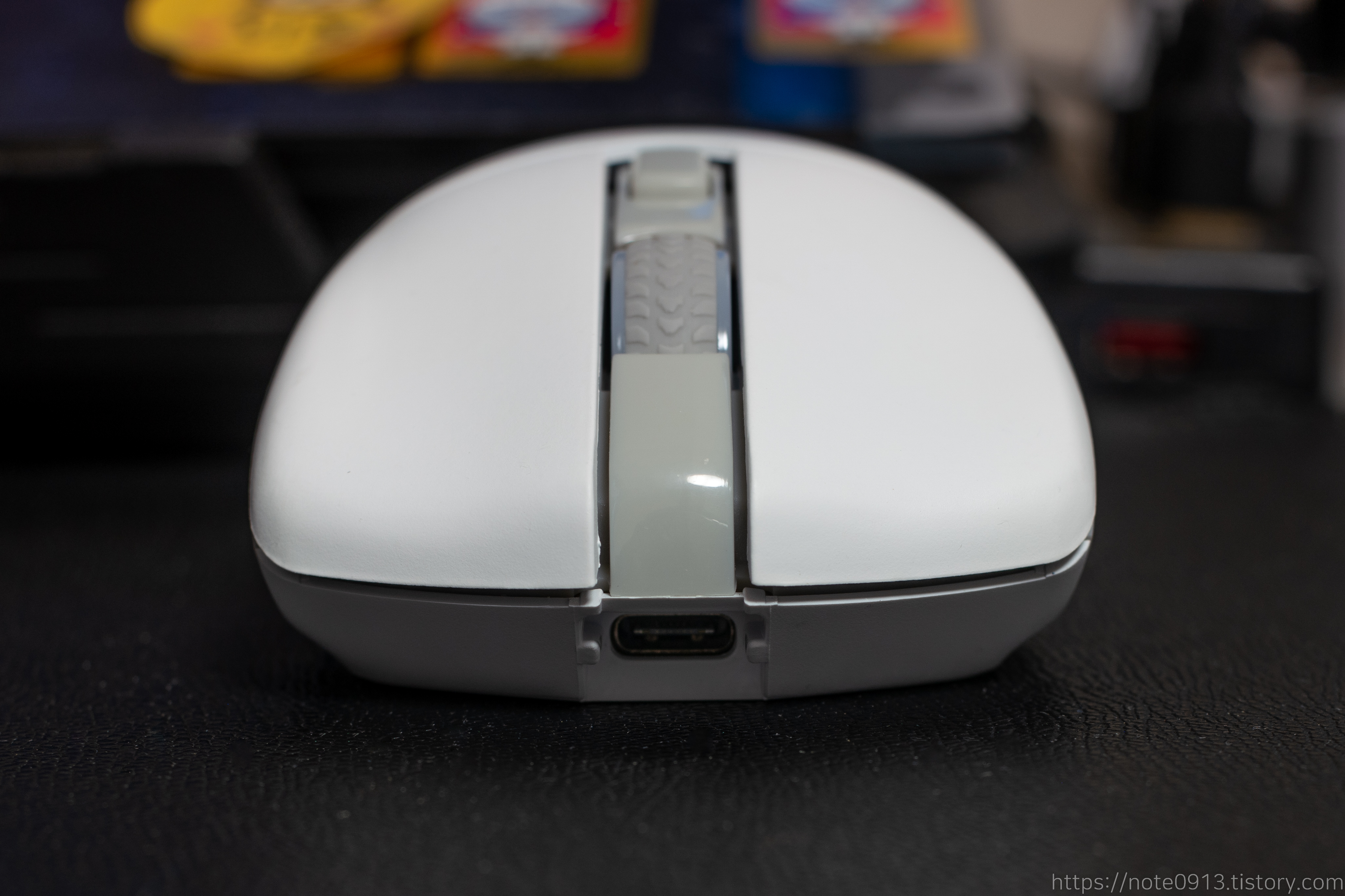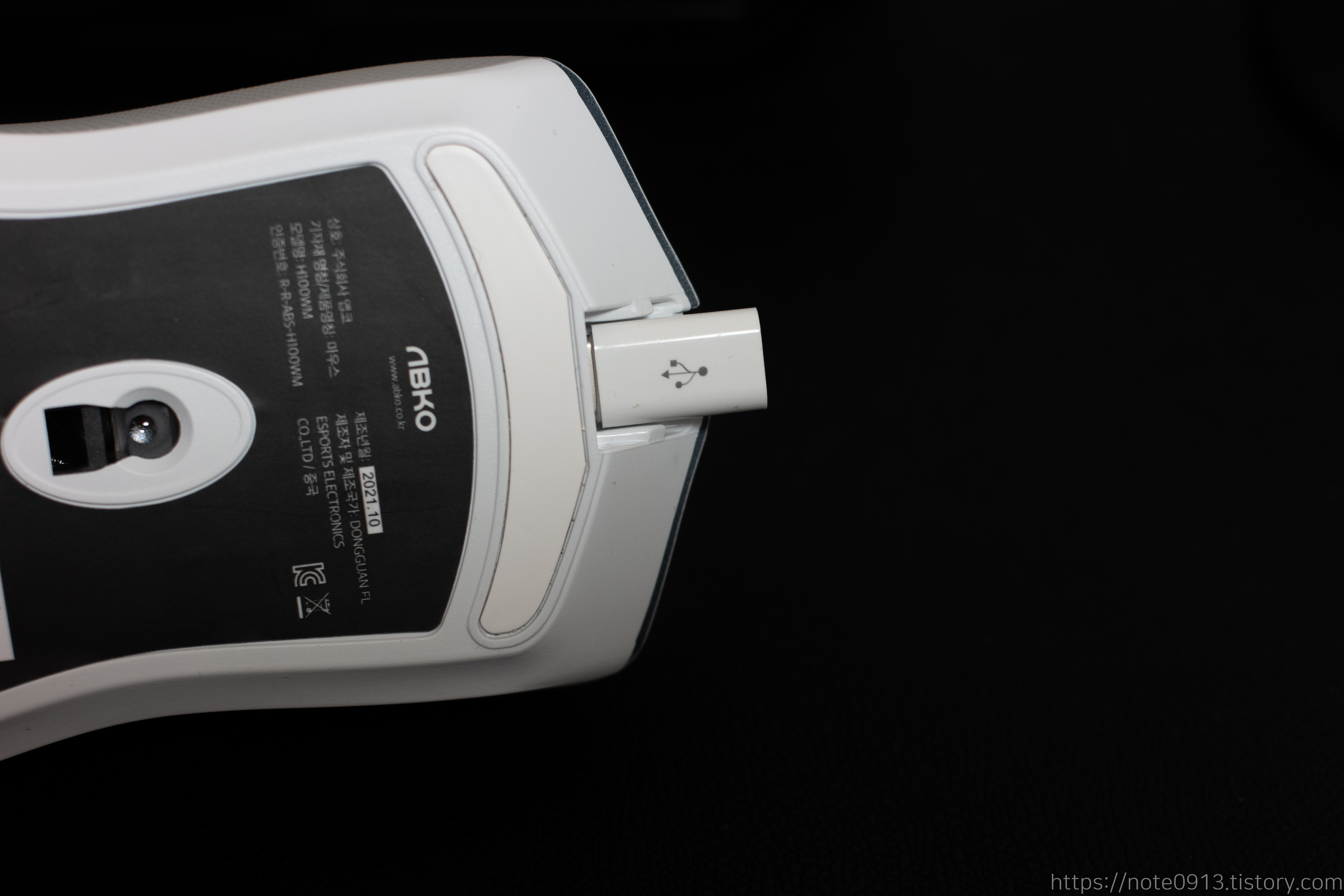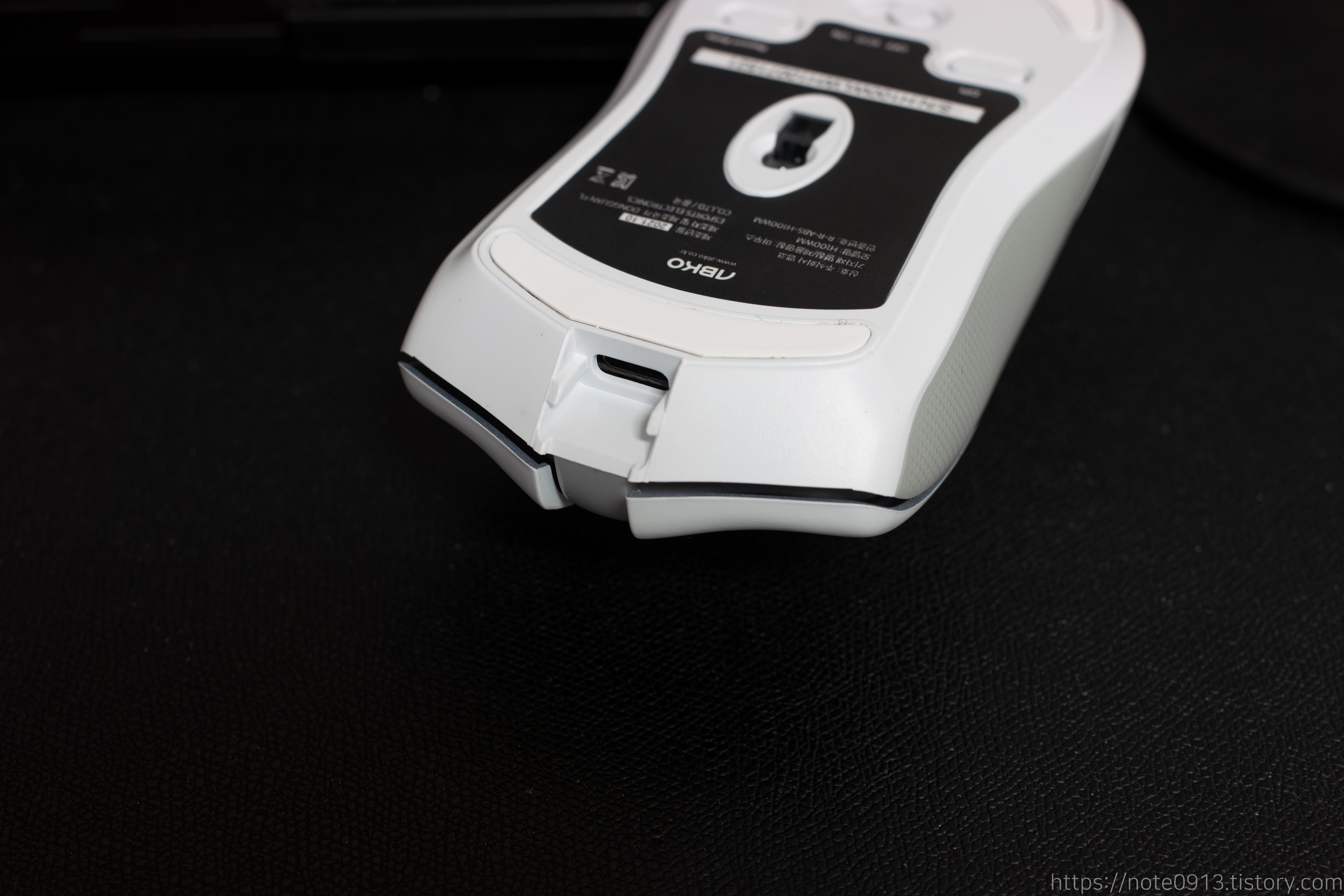 배터리가 없으면 케이블을 이용해 유선으로 사용가능하지만 기본 제공되는 케이블로만 사용이 가능합니다. 왜냐하면 C타입 주변에 돌출된 부분이 있어서 일반적인 C타입 케이블을 연결하기 어려워 보입니다. 아무래도 마우스를 움직이면서 C타입 결합부의 흔들림이나 접촉불량을 막기위해 돌출부분을 만들어 놓은 것 같은데 이런 점은 좋으나 좀 더 넓게 만들어서 일반적인 C타입도 연결할 수 있었으면 좋았을텐데 아쉽습니다.