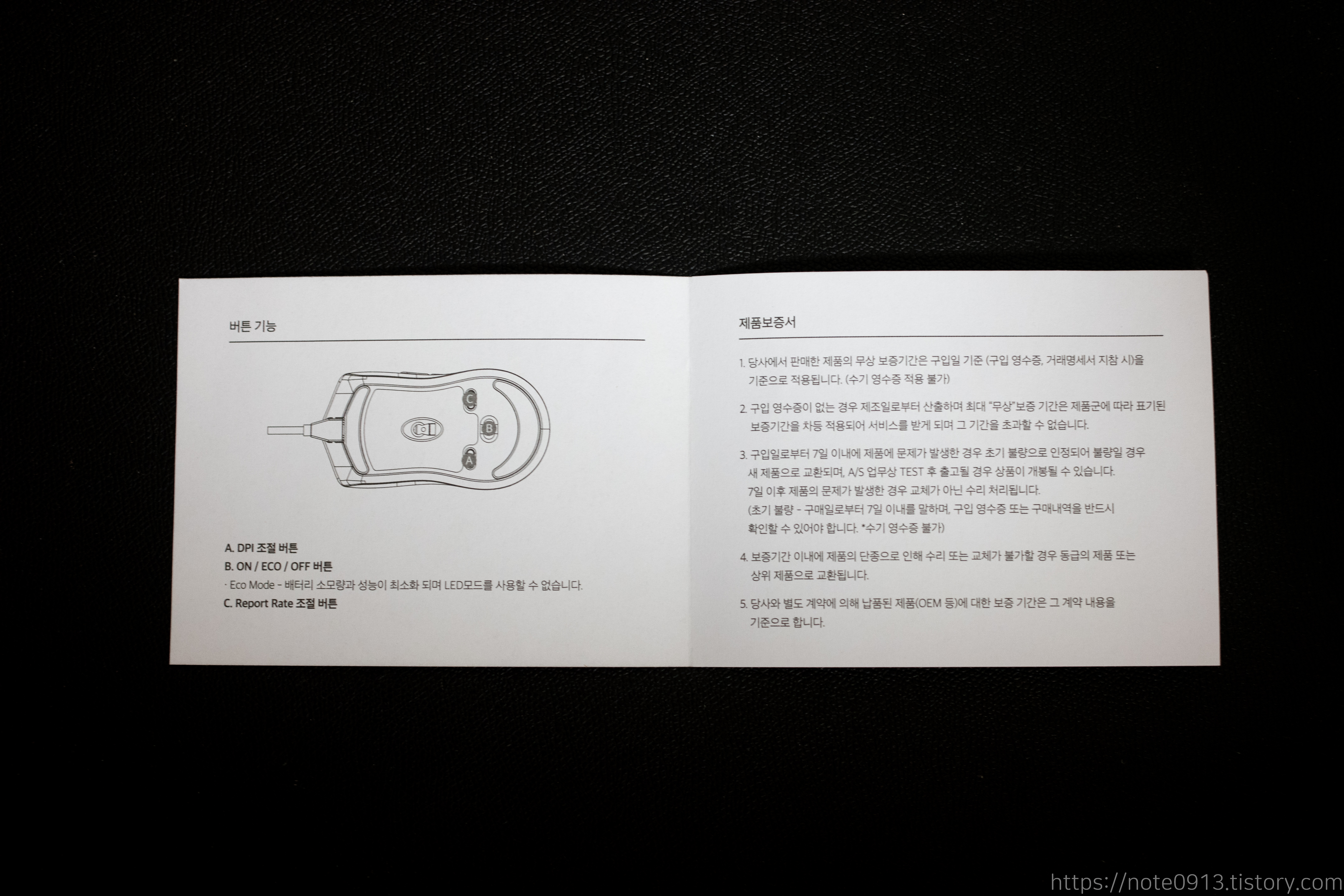 뒷면에는 마우스 측면사진과 특징 및 스펙이 적혀있습니다.
