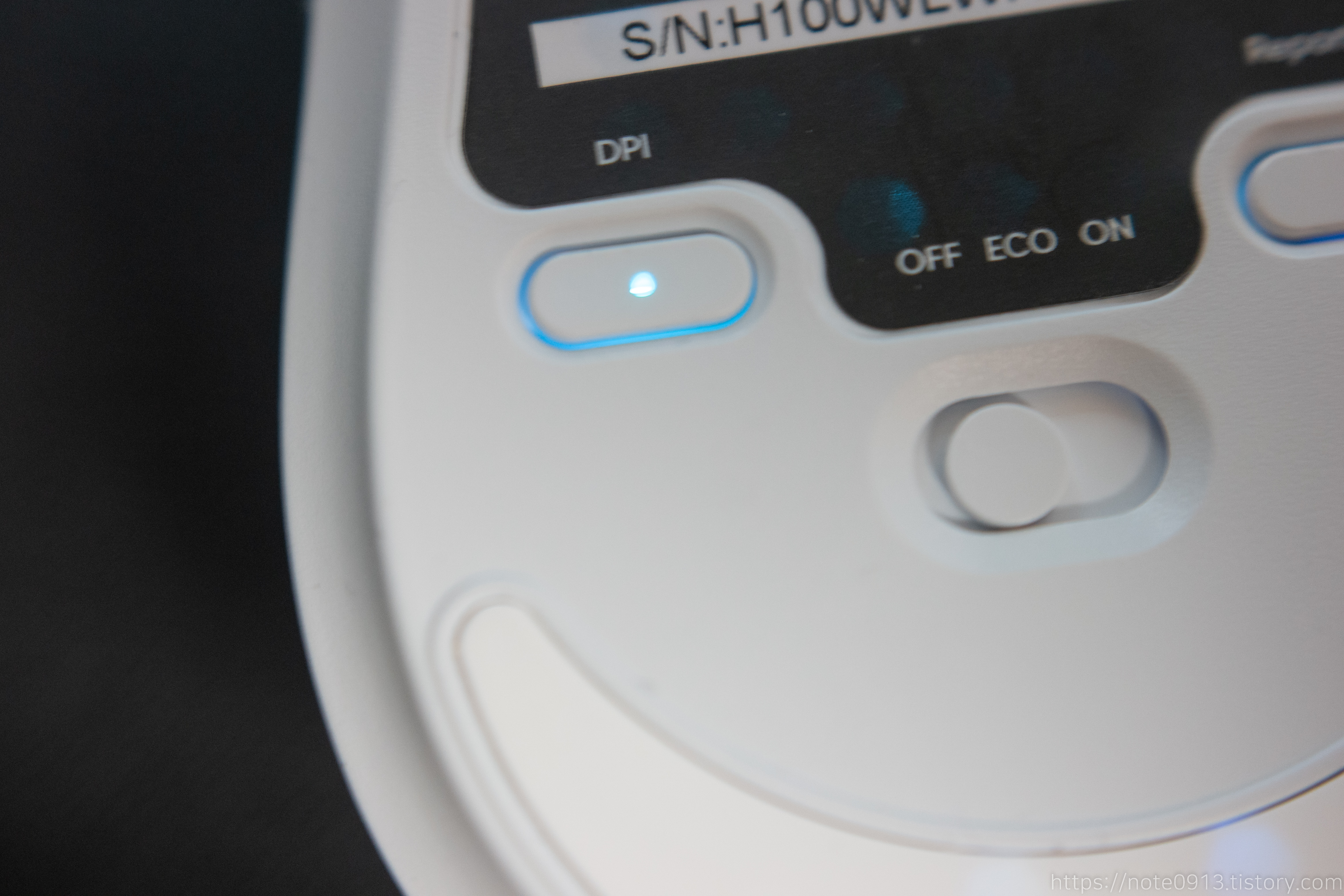 휠 아래에 있는 버튼을 보면 DPI 변경 버튼처럼 생겼는데 실은 LED 변경 버튼이고 DPI 변경은 마우스 아래쪽 버튼을 통해 변경할 수 있습니다. 다만 제공되는 프로그램을 통해 LED 변경 버튼을 DPI 버튼으로 변경할 수 있습니다.