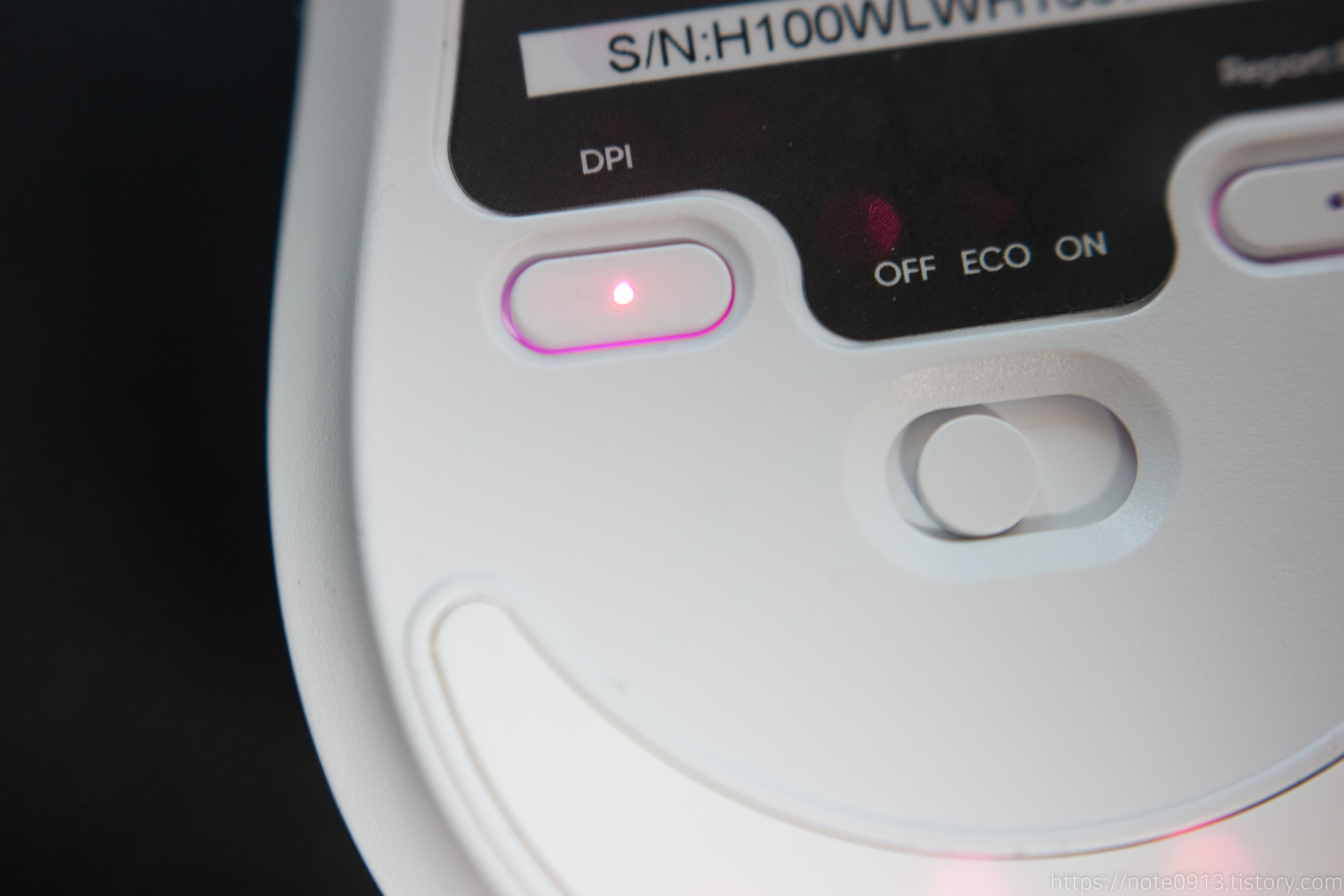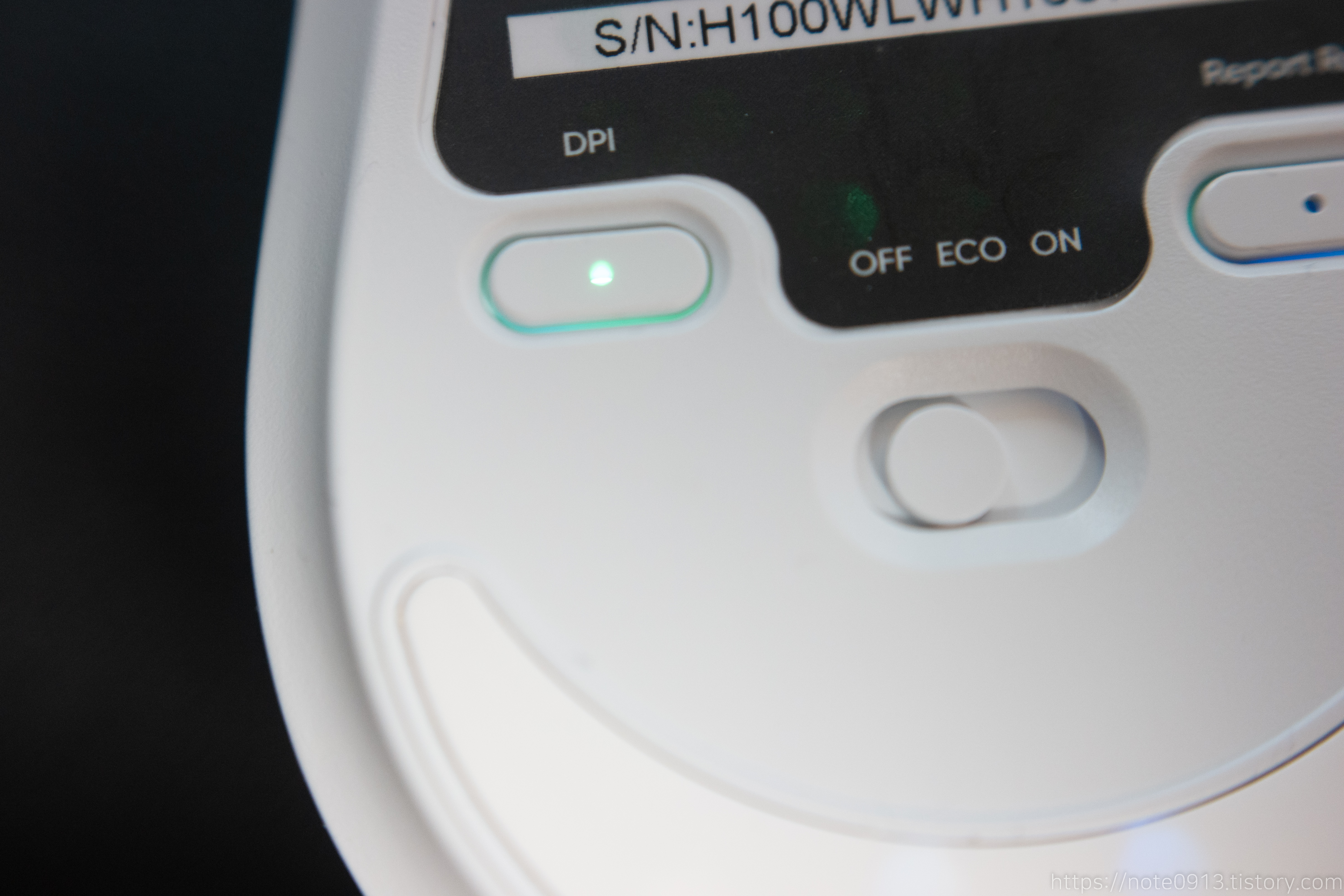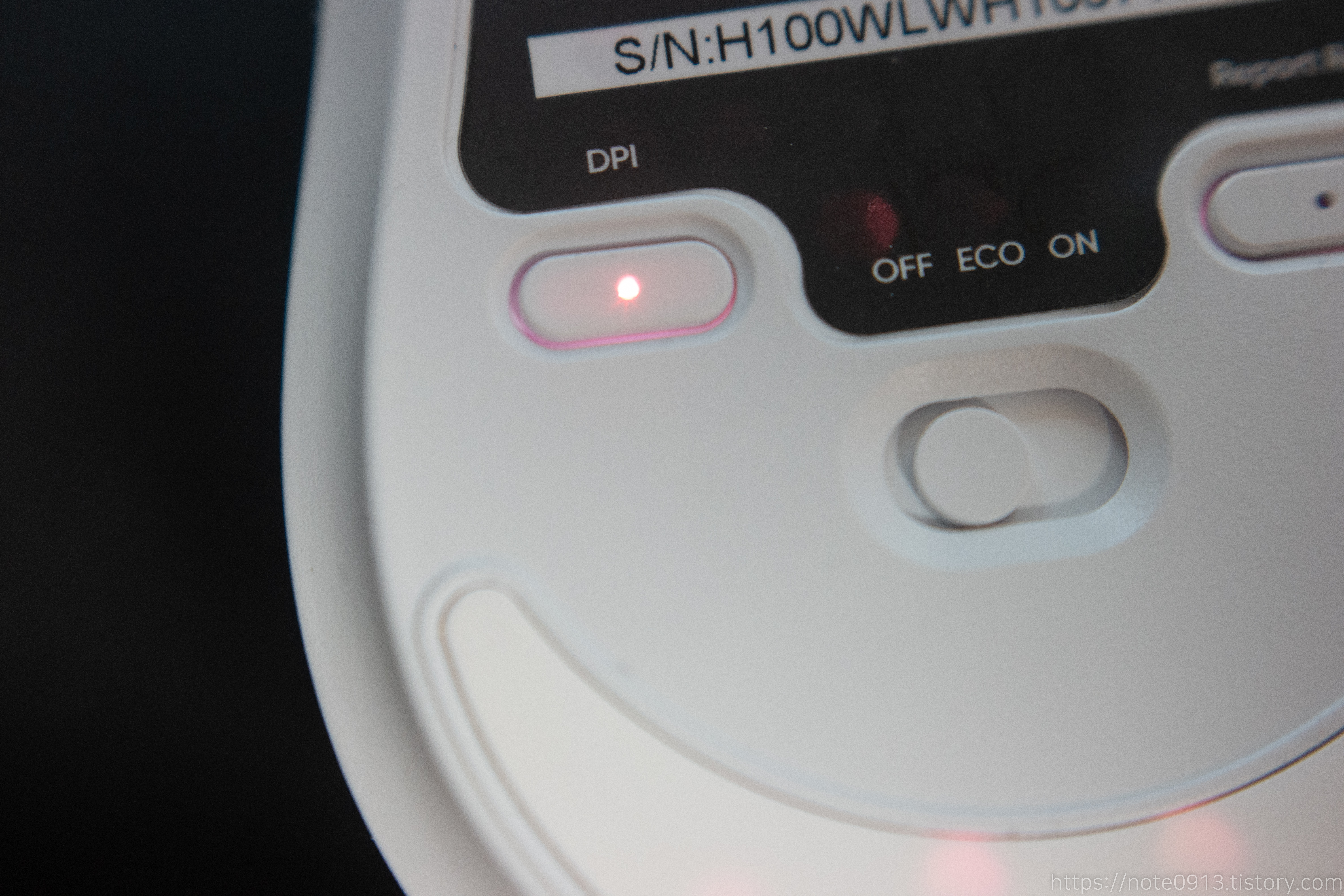 전원 스위치의 경우 ECO 모드와 ON이 있으며 ECO 상태일 때는 폴링레이트는 250Hz로 고정되고 LED가 꺼진 상태로 유지됩니다.