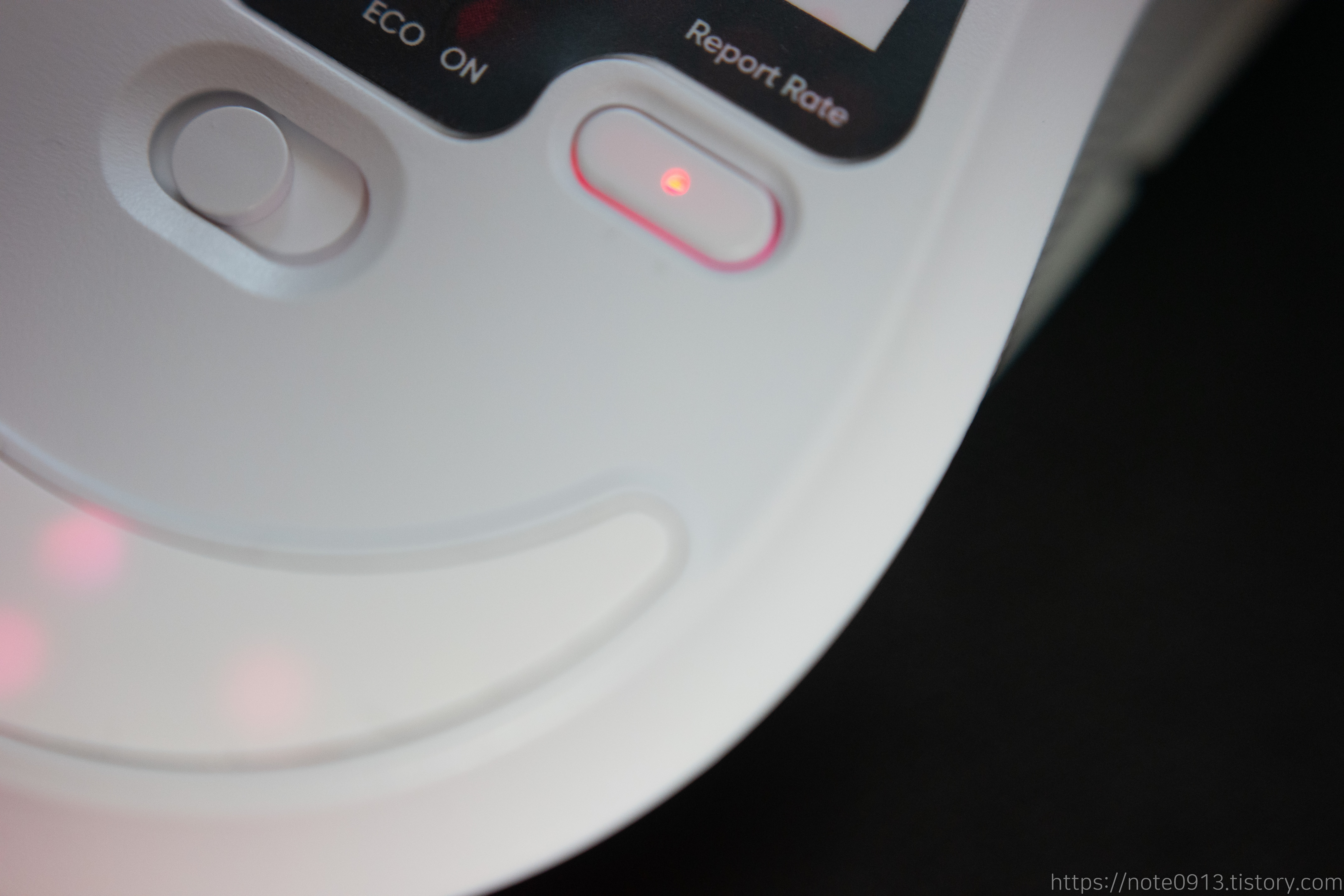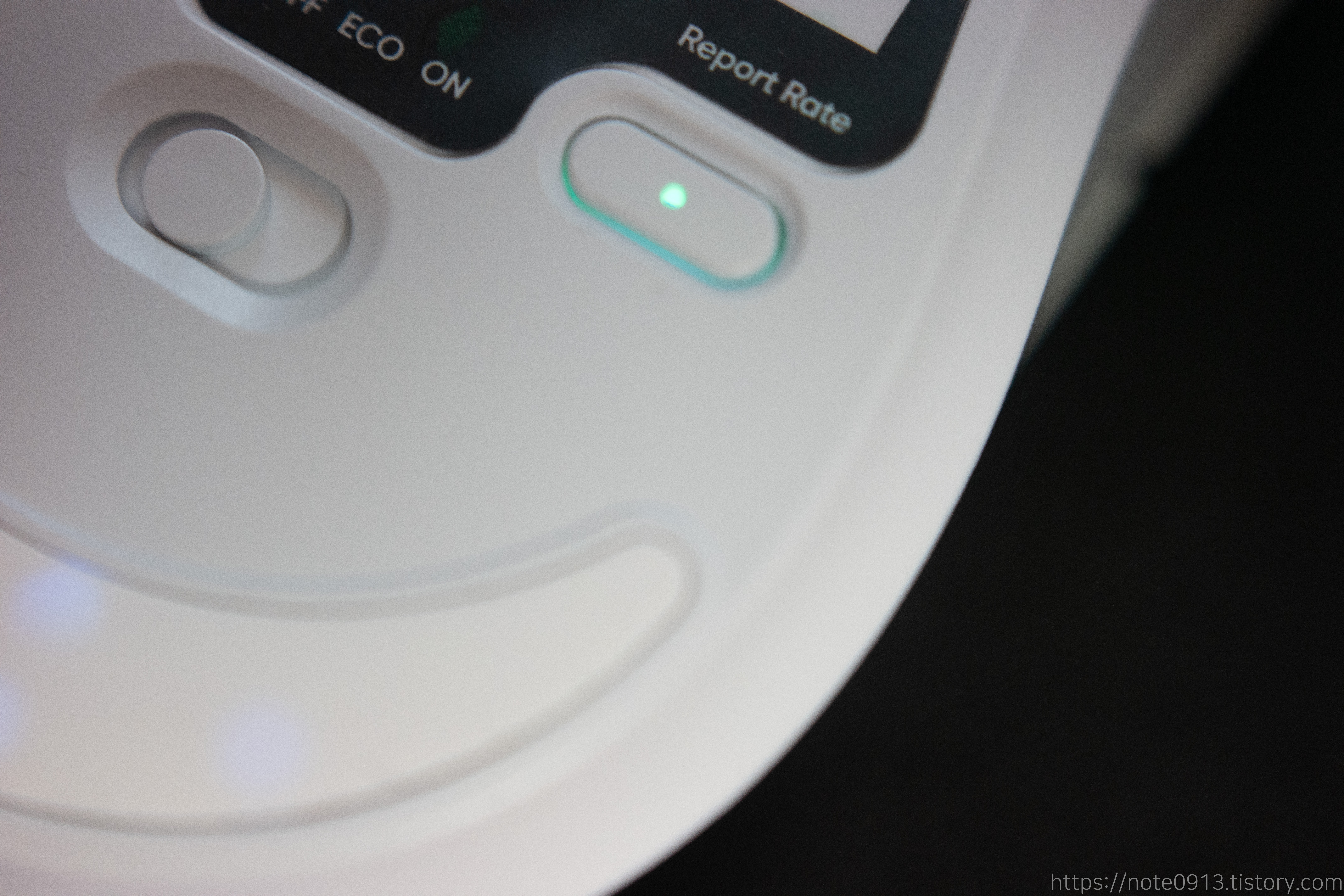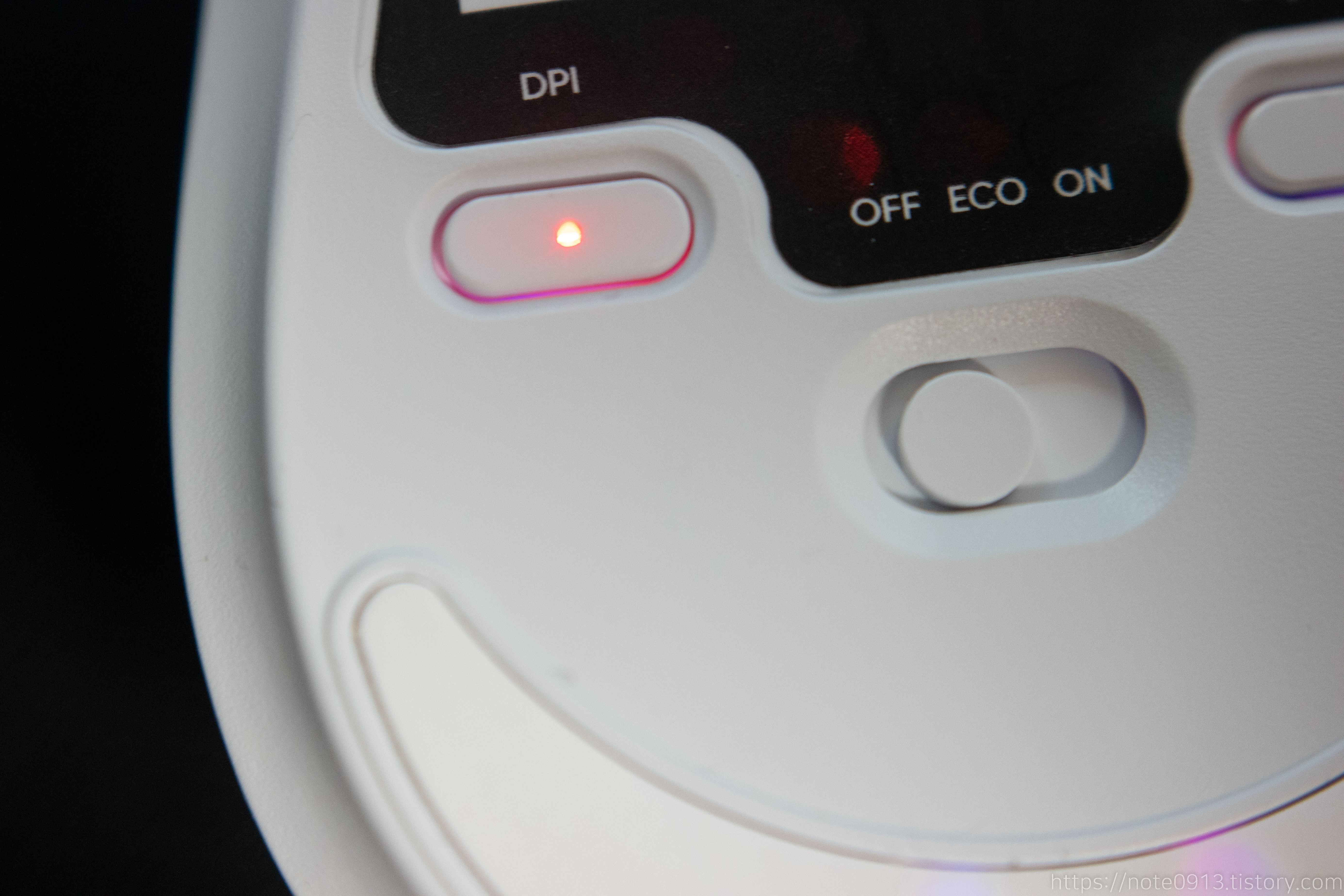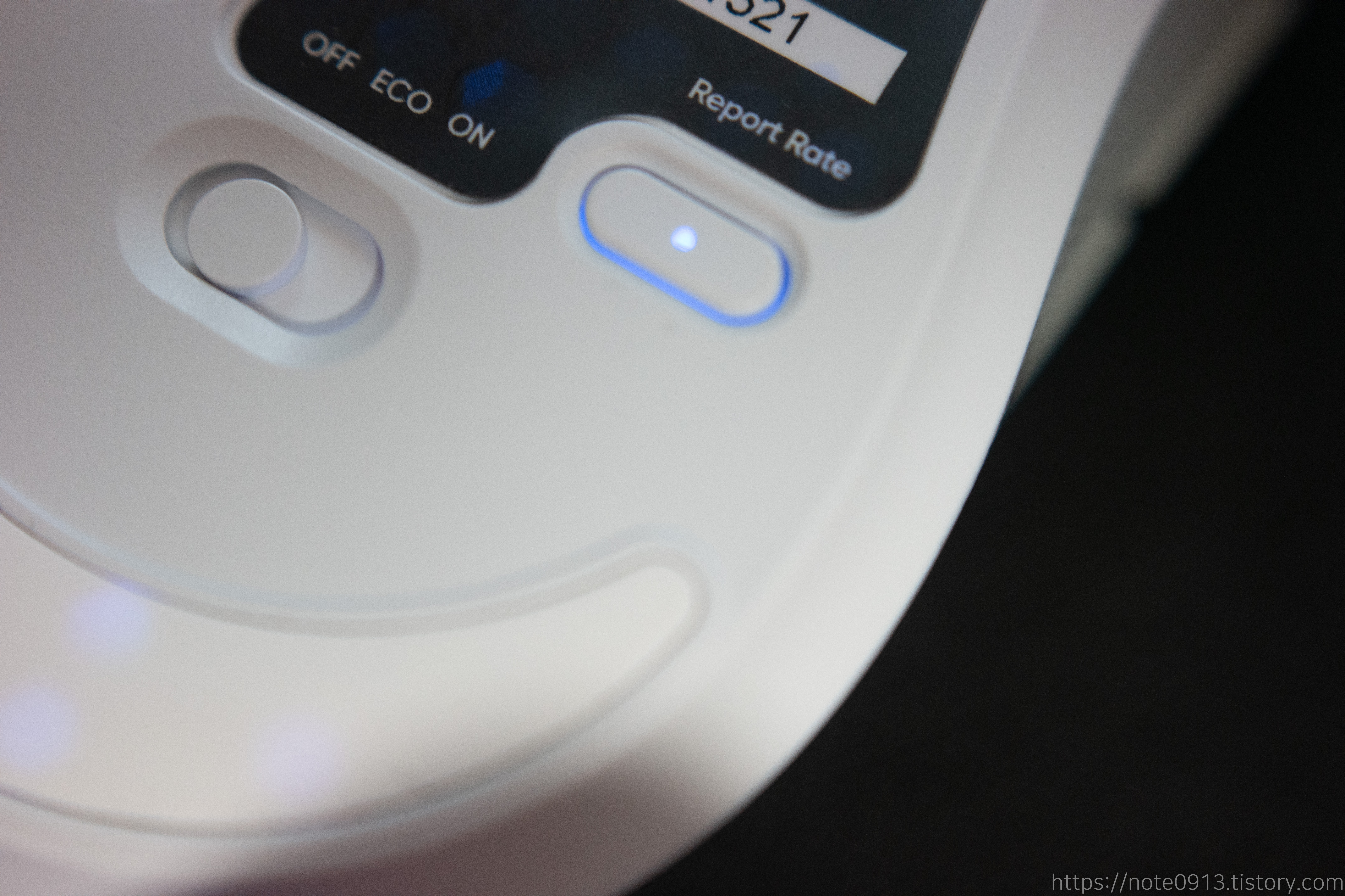 전원 스위치의 경우 ECO 모드와 ON이 있으며 ECO 상태일 때는 폴링레이트는 250Hz로 고정되고 LED가 꺼진 상태로 유지됩니다.