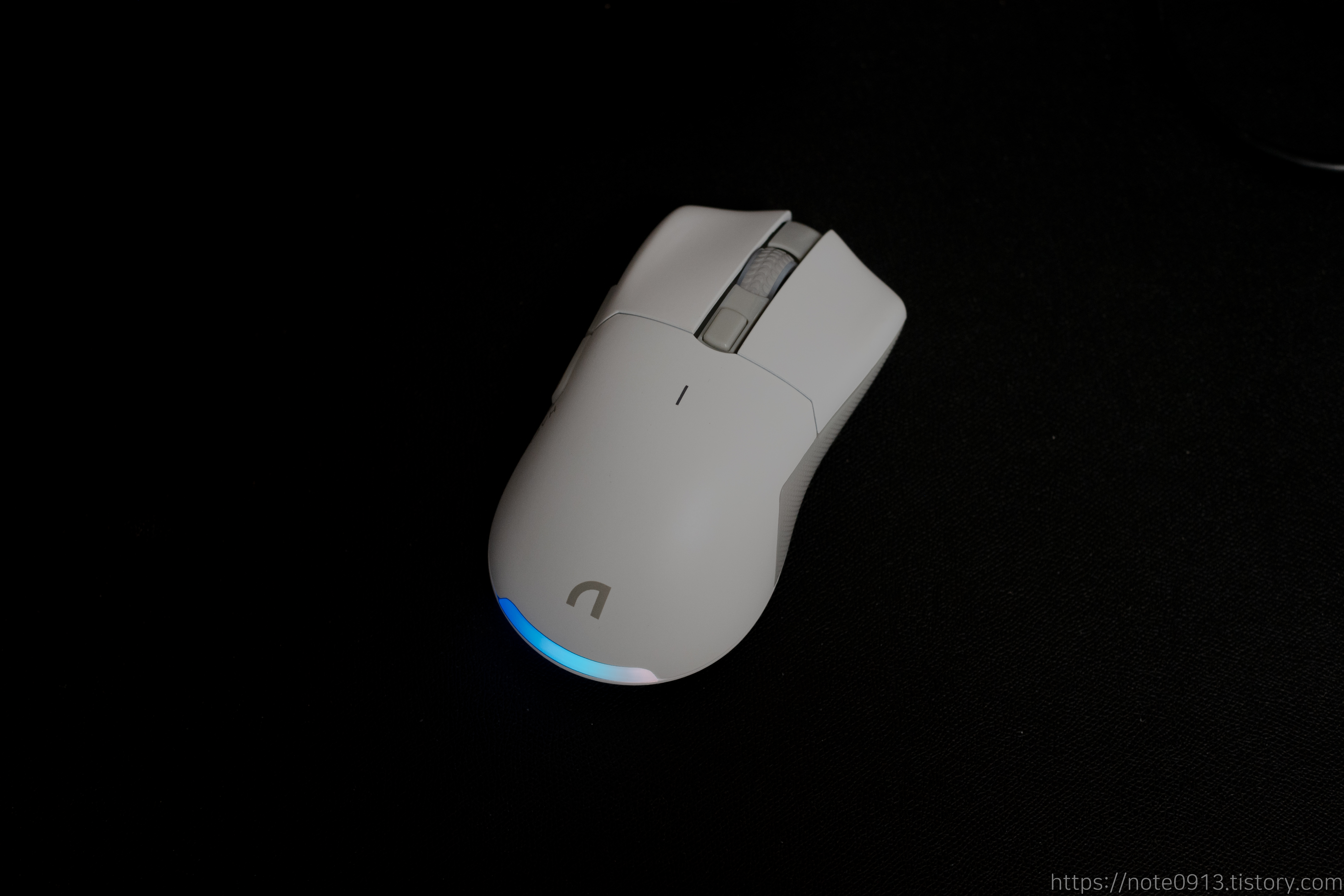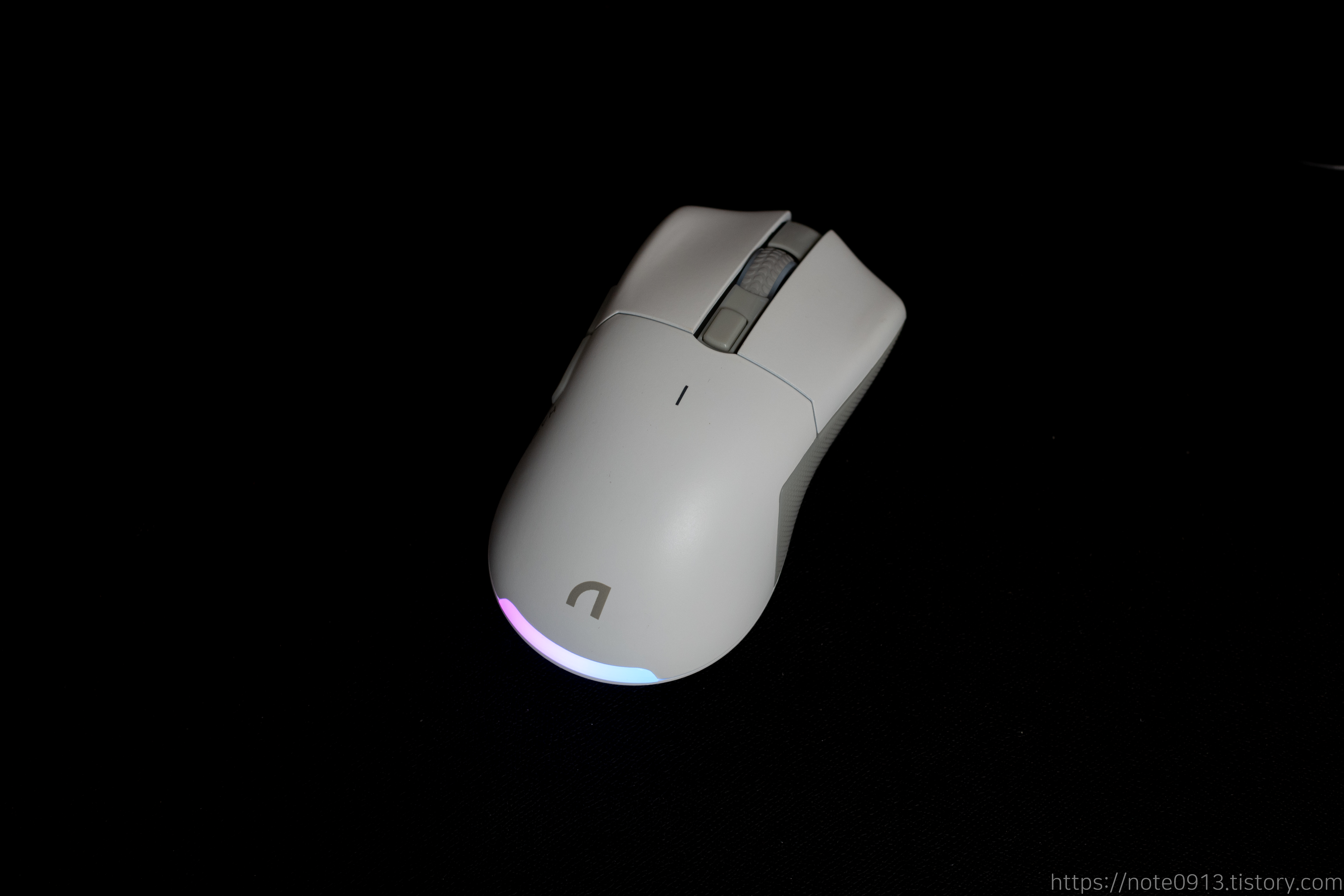 마우스 뒷면에 슬라이드 스위치를 이용해 전원을 키면 저렇게 마우스에 RGB LED가 들어옵니다. 휠 아래에 있는 버튼으로 LED 모드를 변경할 수 있고 끌 수도 있습니다.
