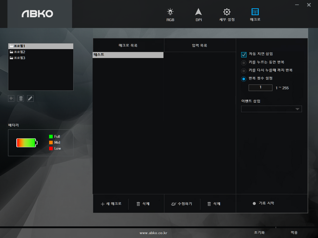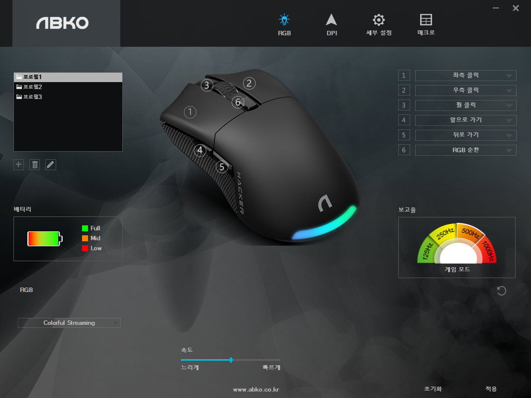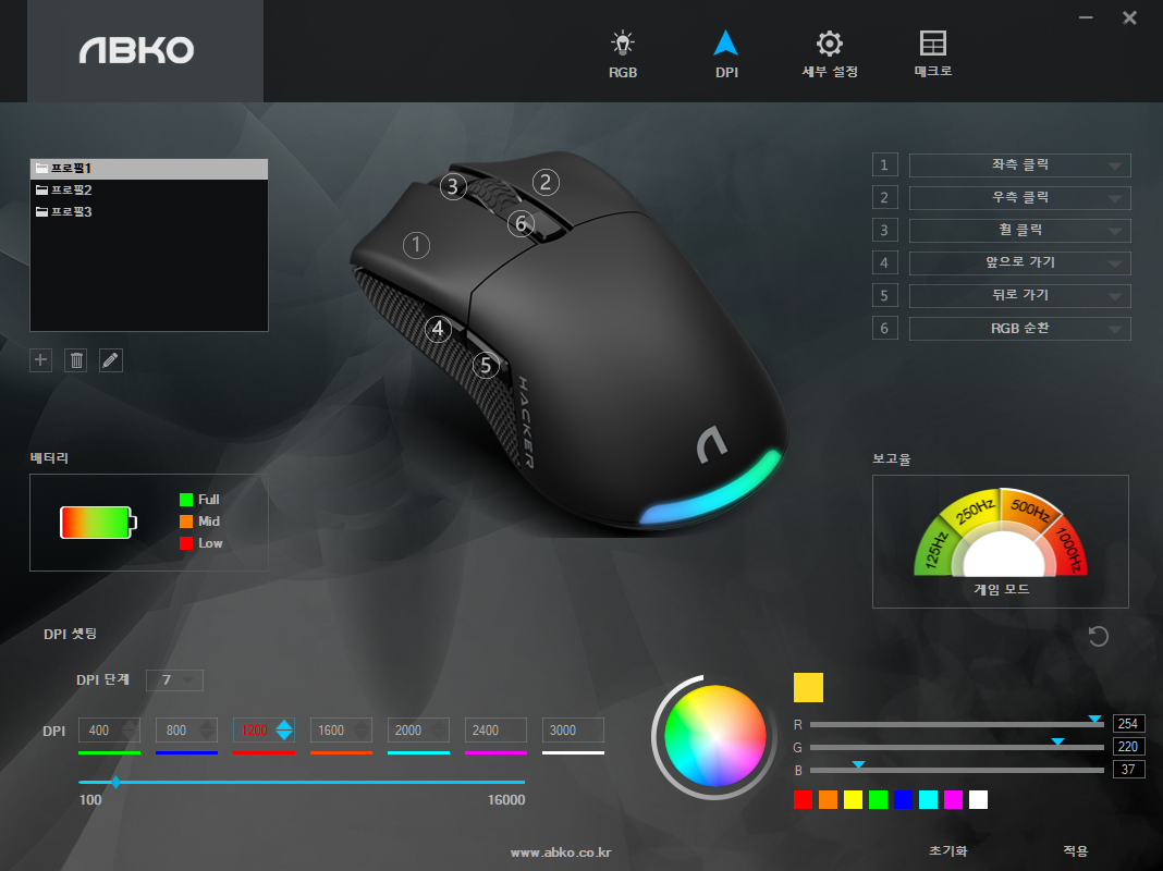 프로그램에서는 RGB 조명 설정, DPI 설정, 기타 세부 설정, 매크로 등의 설정이 가능합니다.