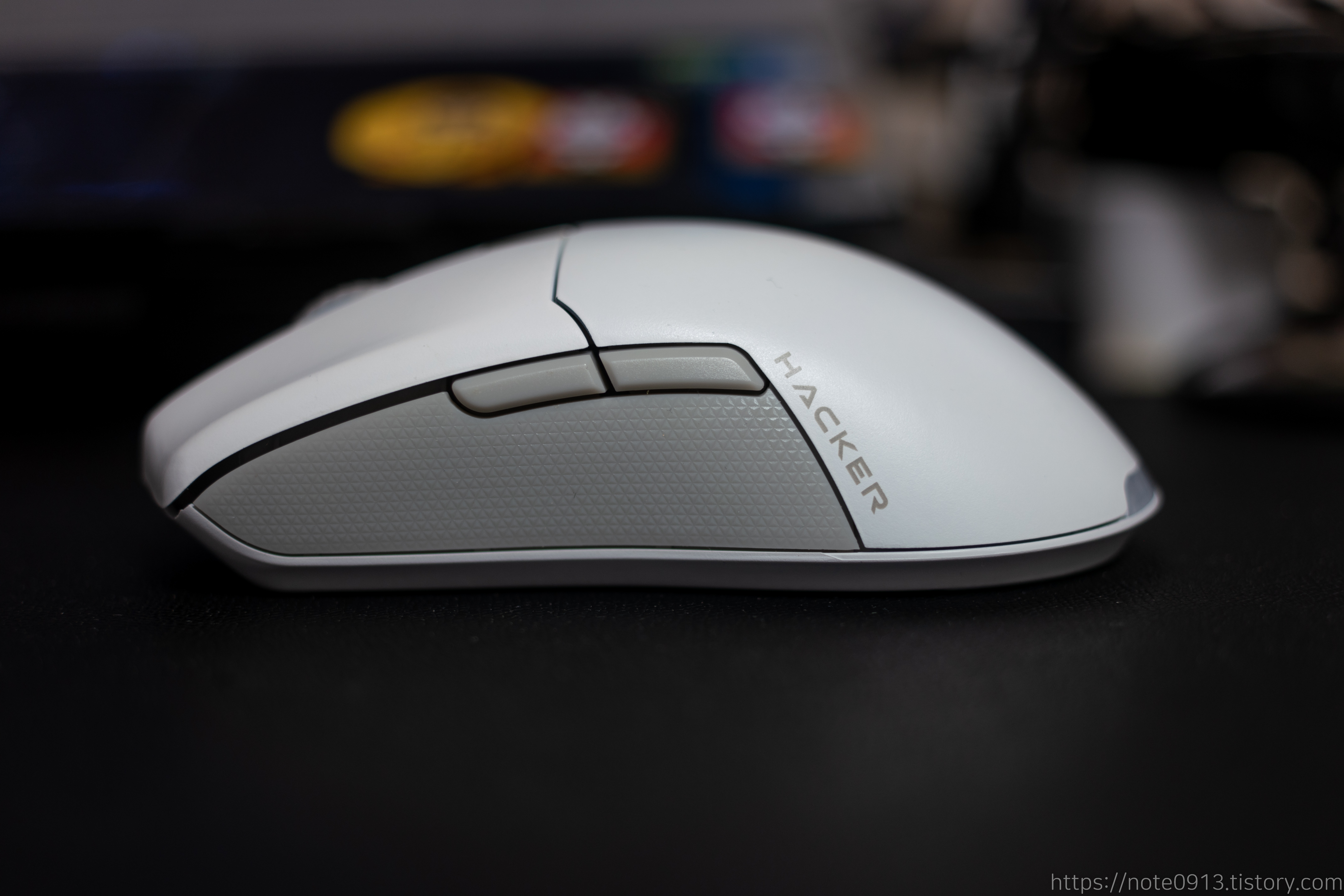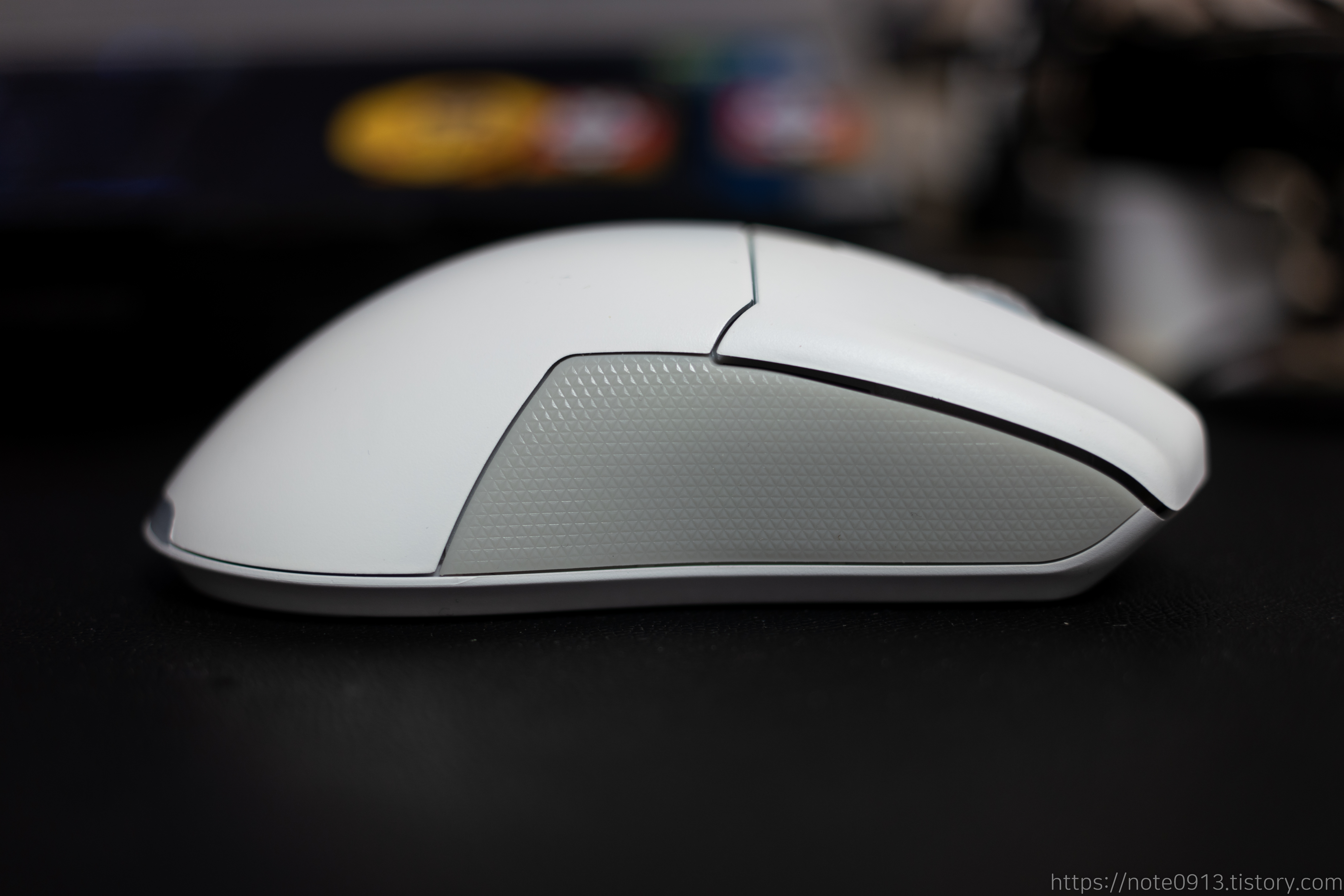 마우스 측면 부분입니다. 좌측에는 사이드 버튼 2개가 있고 옆면에 회색부분이 돌기패턴으로 되어있어서 잡았을 때 잘 미끄러지지 않습니다.