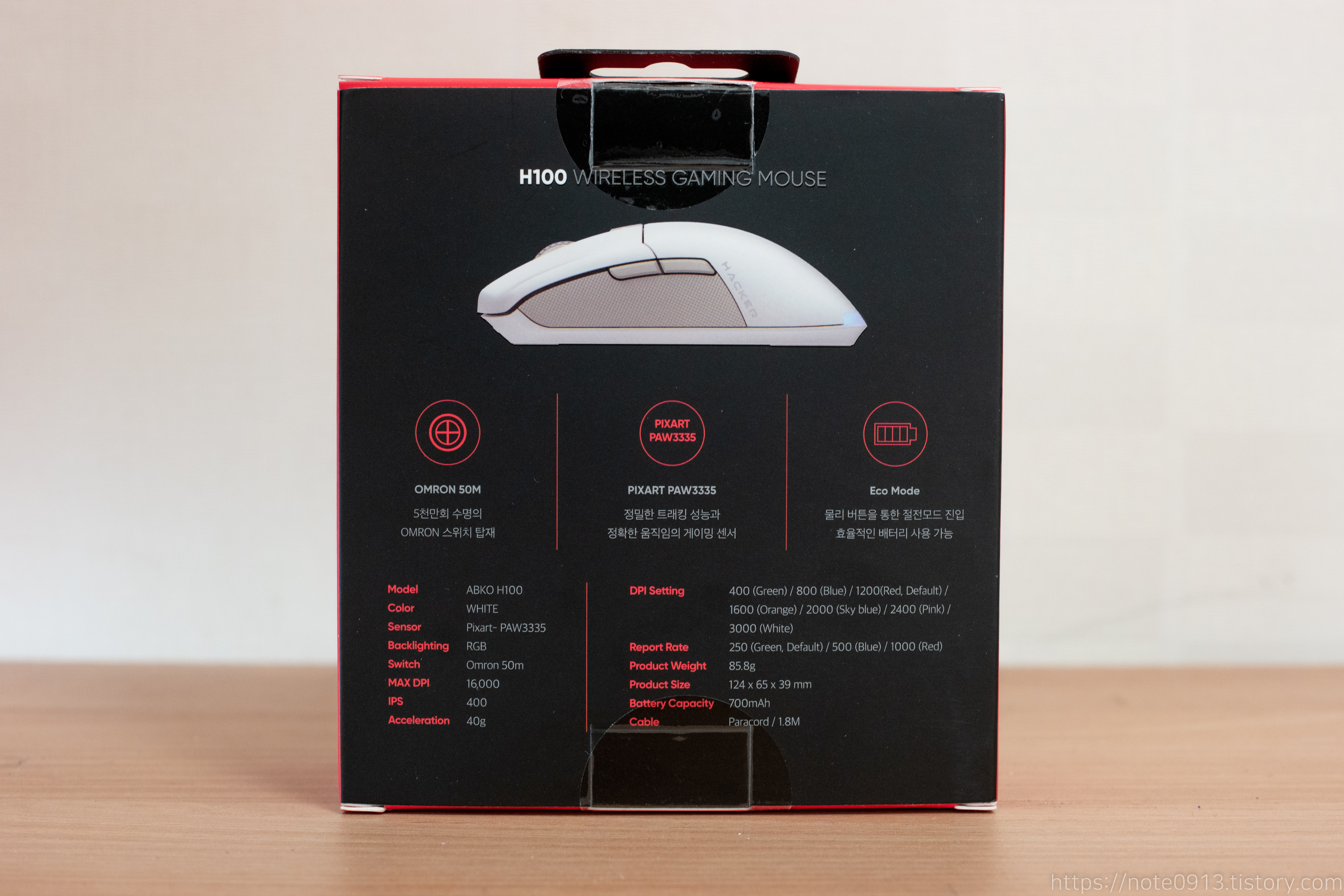 현재 로지텍의 G102 마우스를 사용하고 있습니다. 그런데 마우스를 사용하면서 선이 걸리적 거려서 무선 마우스를 사용하고 싶어서 검색을 해봤습니다. 다나와에서 유무선 겸용 게이밍 마우스 중에서 낮은 가격 순으로 정렬하니 앱코의 H100 마우스가 가장 먼저 나타났습니다. 구매하기전에 리뷰도 찾아보기 힘들고 크게 알려지지 않은것같고 앱코라는 브랜드도 호불호가 많이갈려 구입하기 꺼려졌는데 그래도 가격도 저렴하고 디자인도 나쁘지 않아서 구입해보았습니다.