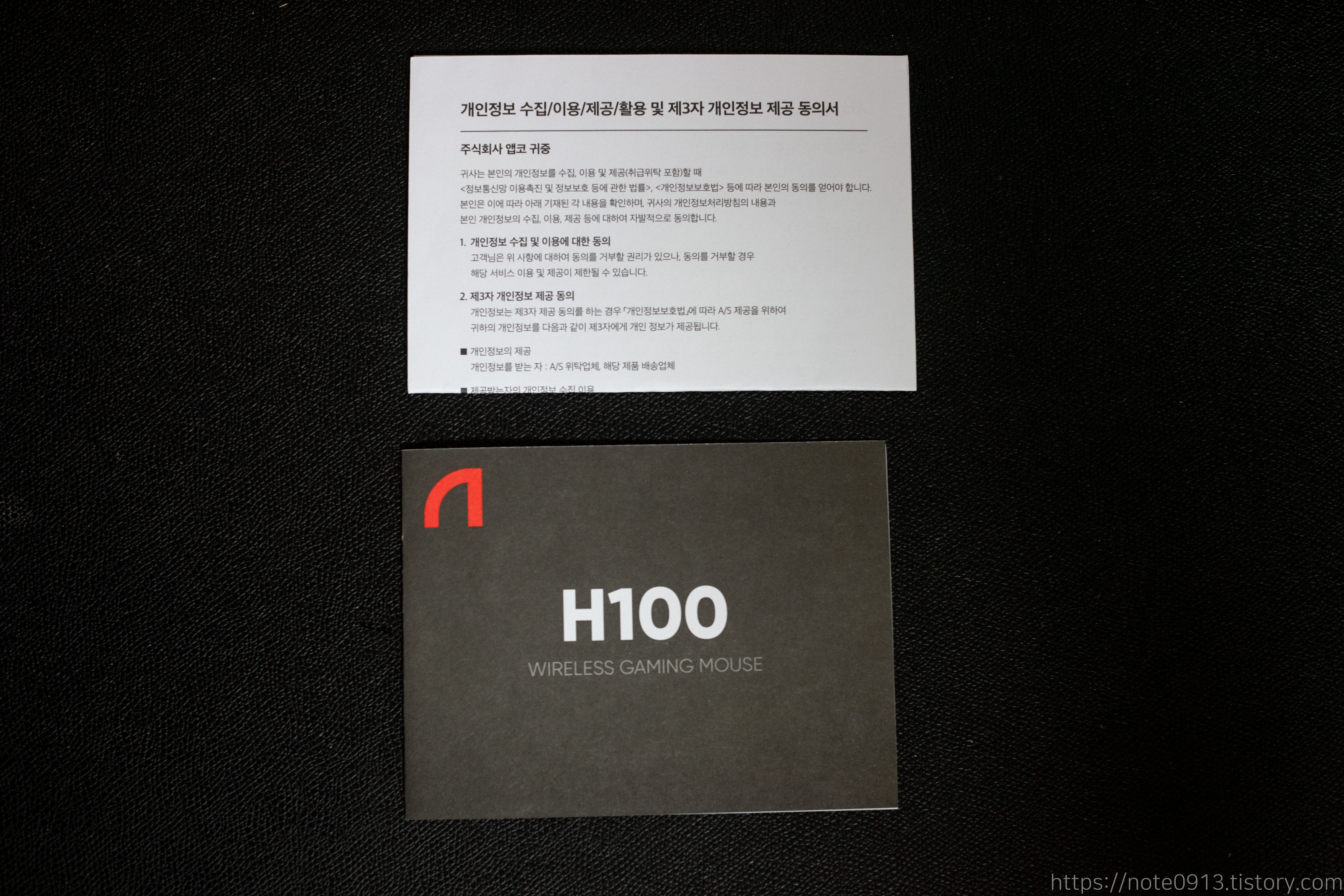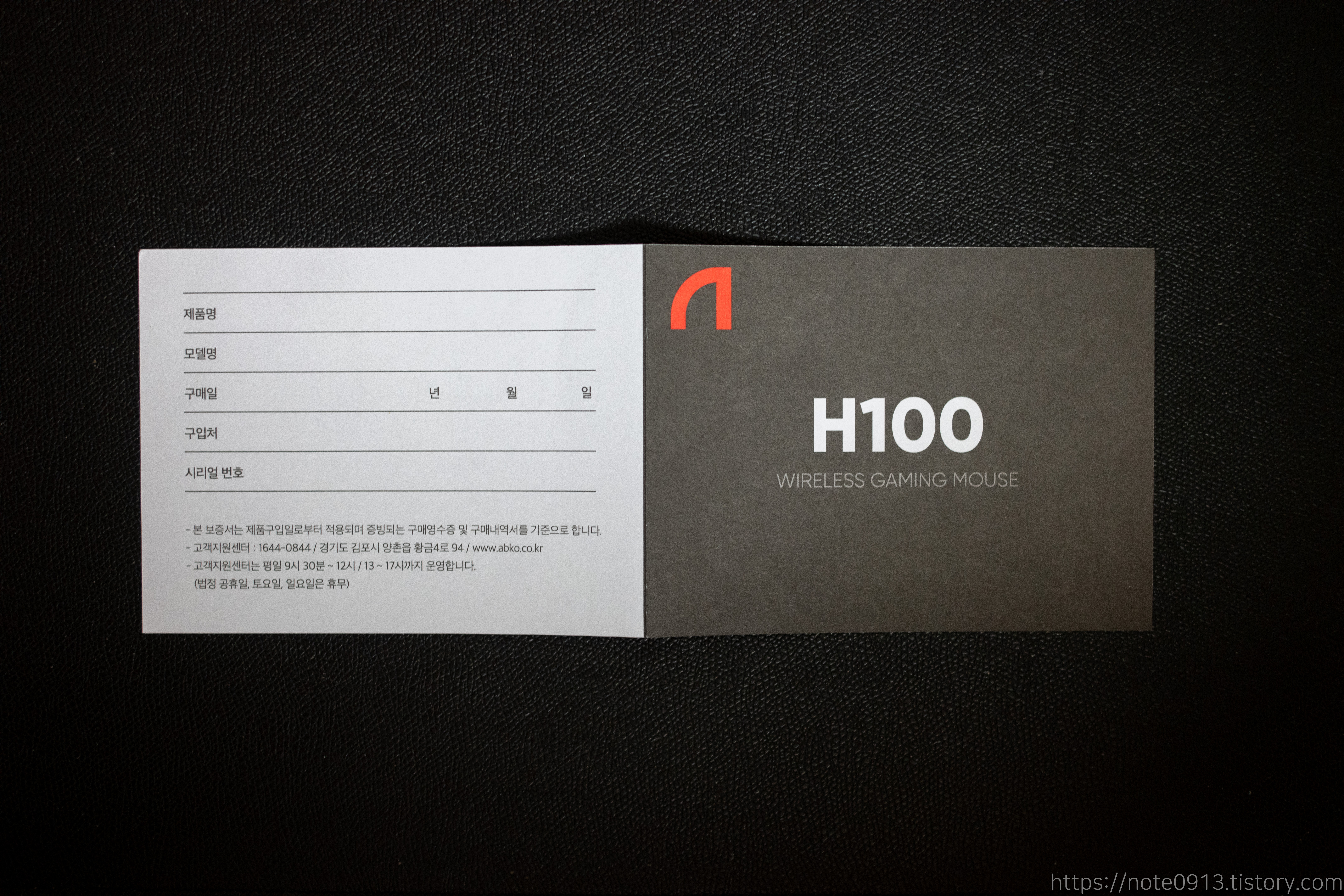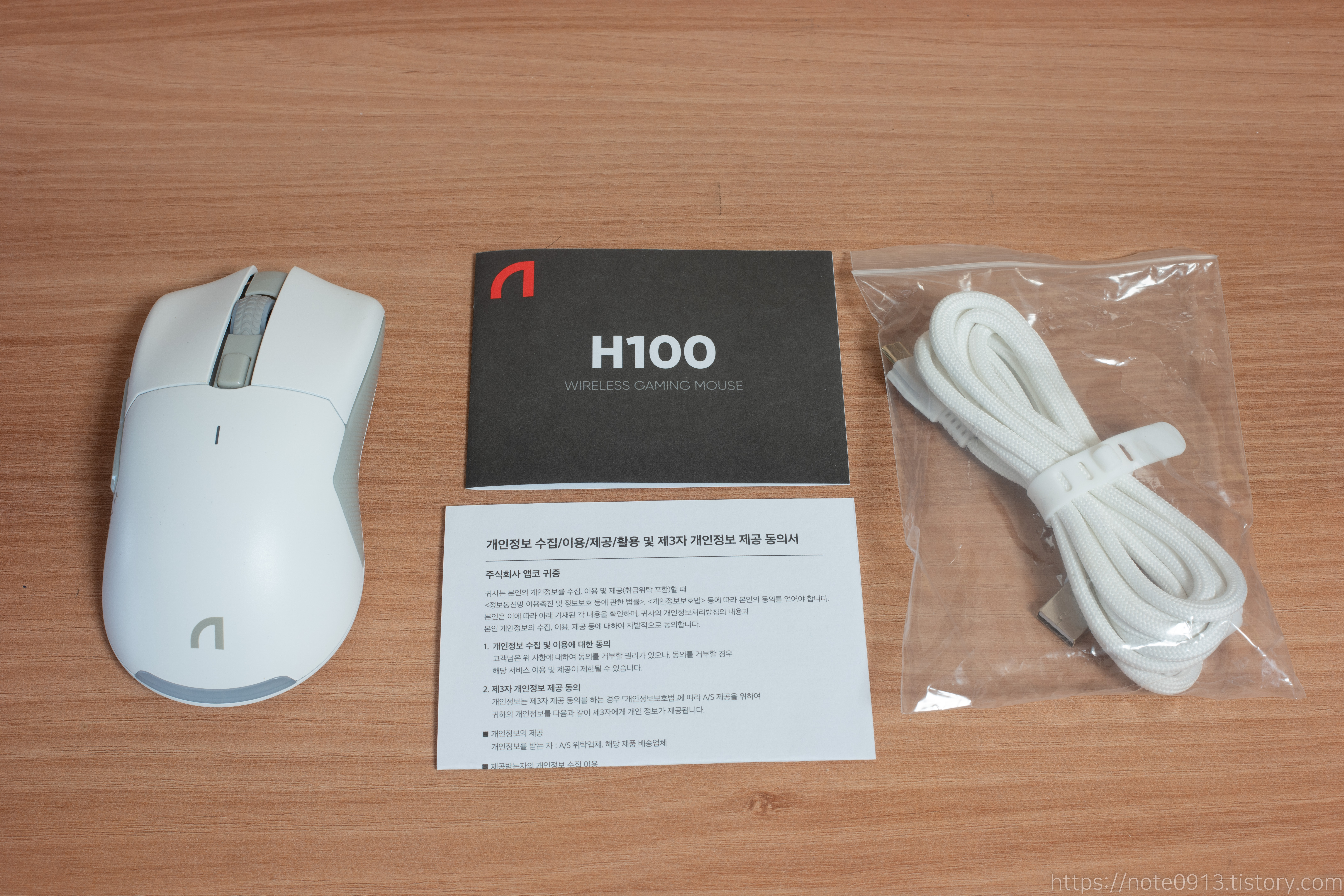 구성품은 H100 마우스와 USB A to C 케이블, USB 수신기, 보증서, AS 신청서로 구성되어 있습니다.