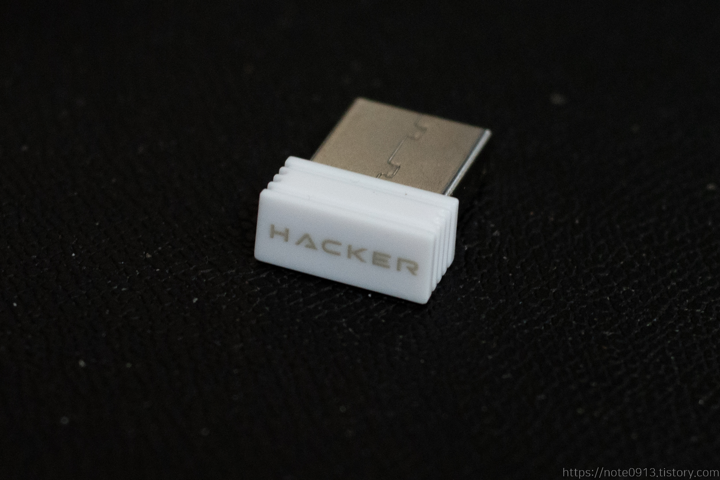 USB 타입의 수신기입니다. 앞에 앱코의 게이밍기어 브랜드인 HACKER 라는 글자가 있습니다. H100 마우스의 무선방식은 2.4GHz 주파수로 통신하는 방식입니다. 공유기 주파수와 같습니다. 때문에 공유기 주변에 수신기가 있거나 주변에 전자렌지와 같은 기기가 있으면 통신이 불안정해질수도 있습니다.