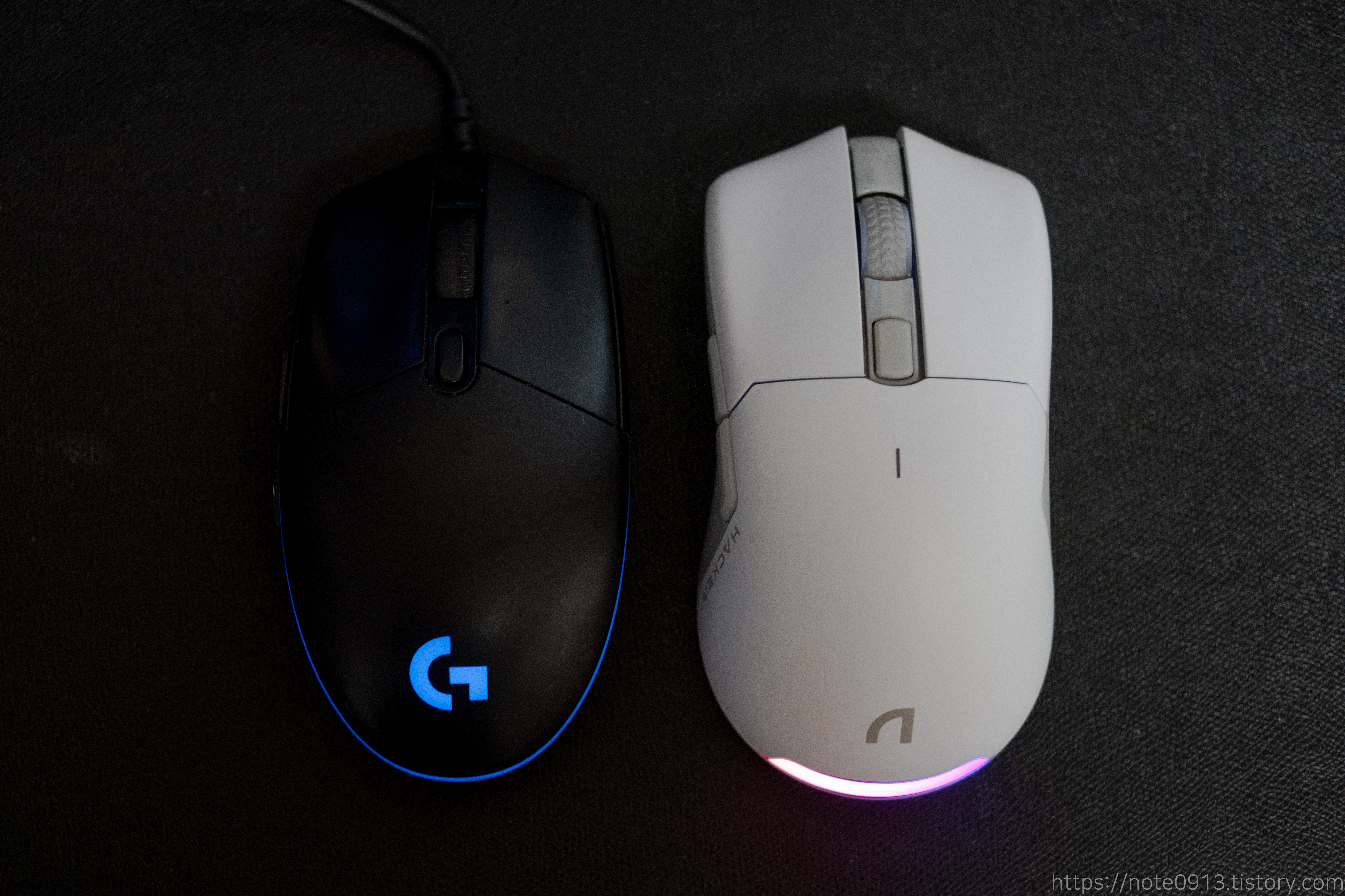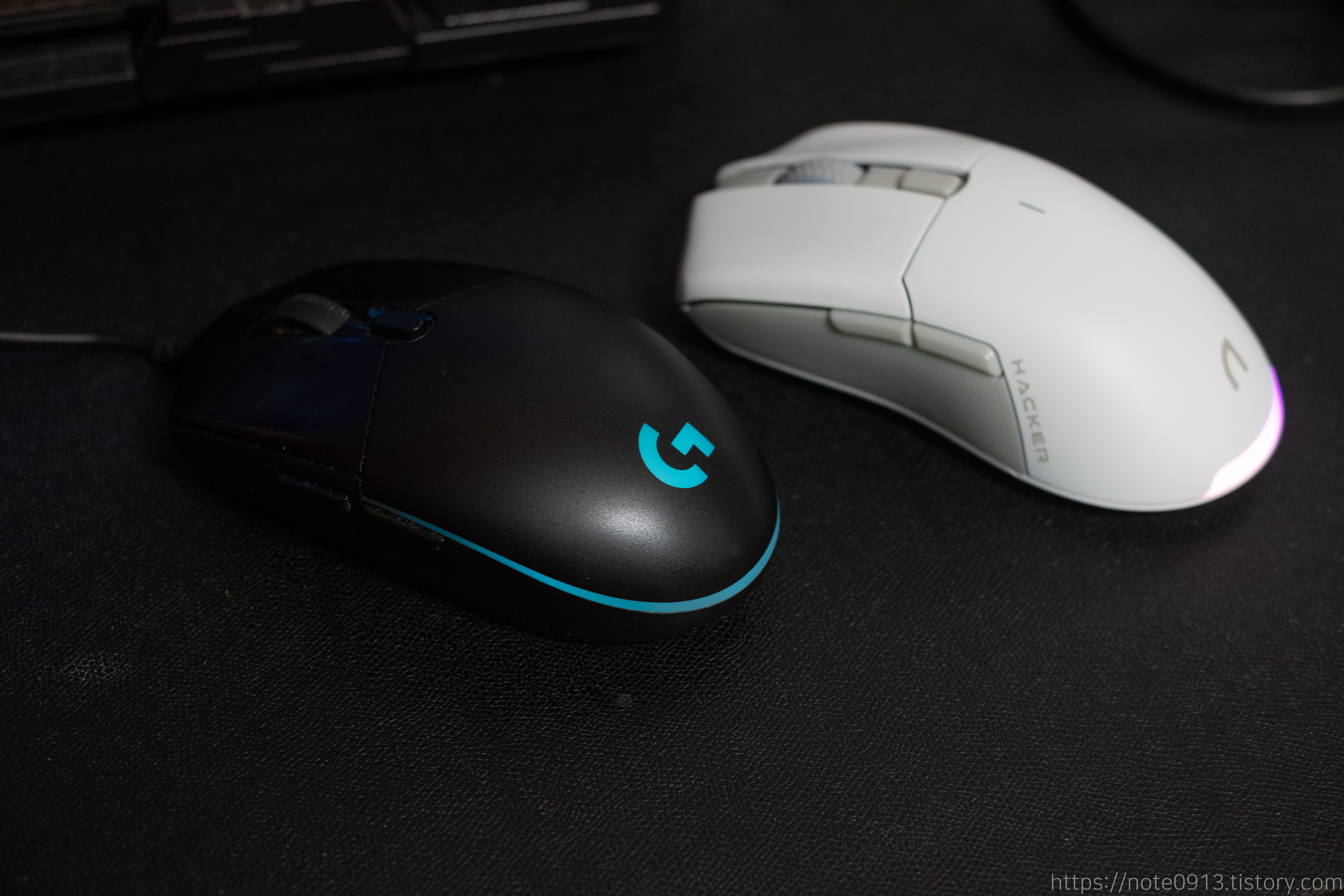 로지텍의 G102 마우스와 앱코 H100 마우스의 비교사진입니다. H100이 조금 더 크고 실제로 H100 마우스를 잡다가 G102 마우스를 잡으면 작다는게 느껴집니다.