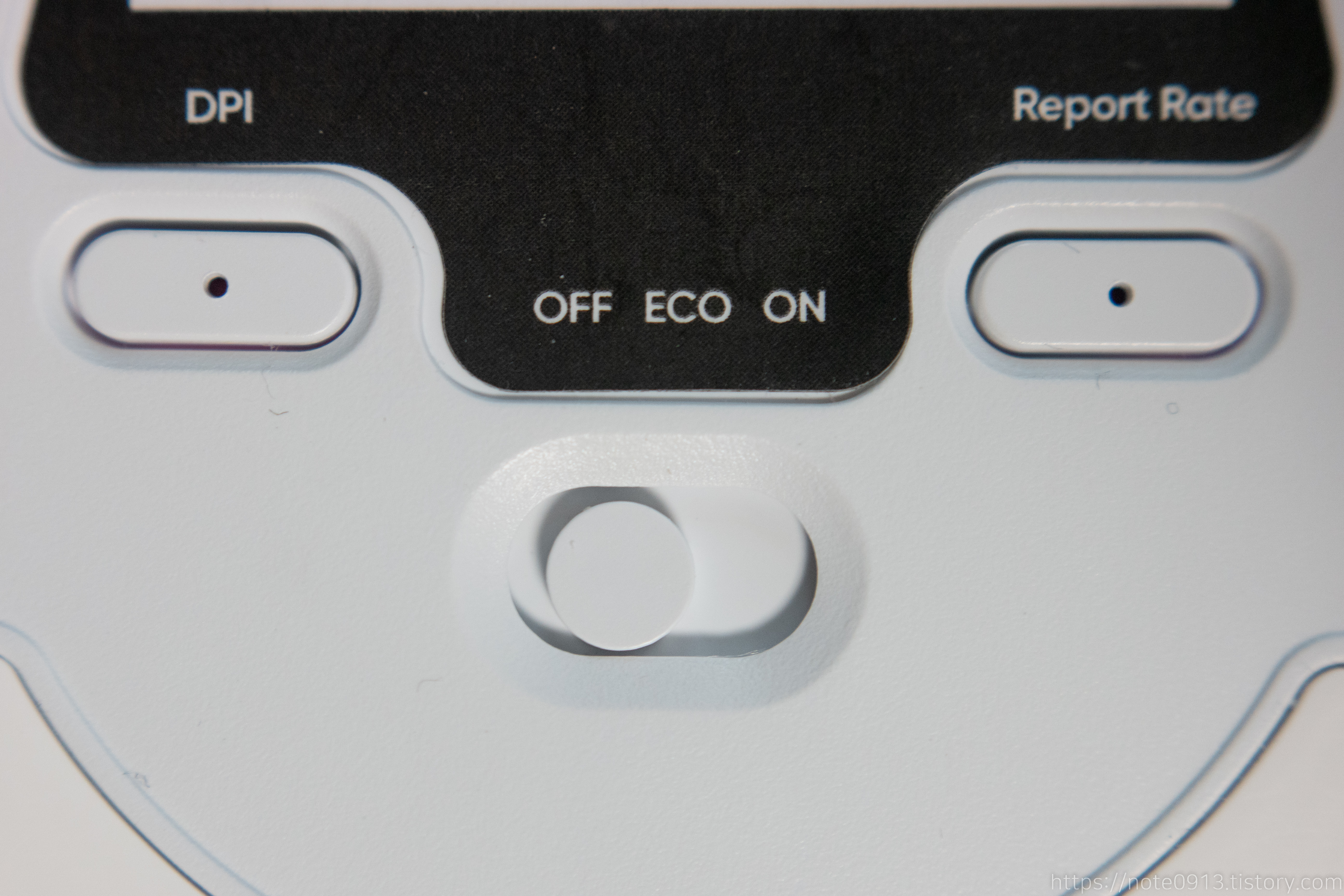뒷면은 ON/OFF 스위치랑 DPI 버튼, Report Rate(폴링레이트) 버튼이 있습니다.