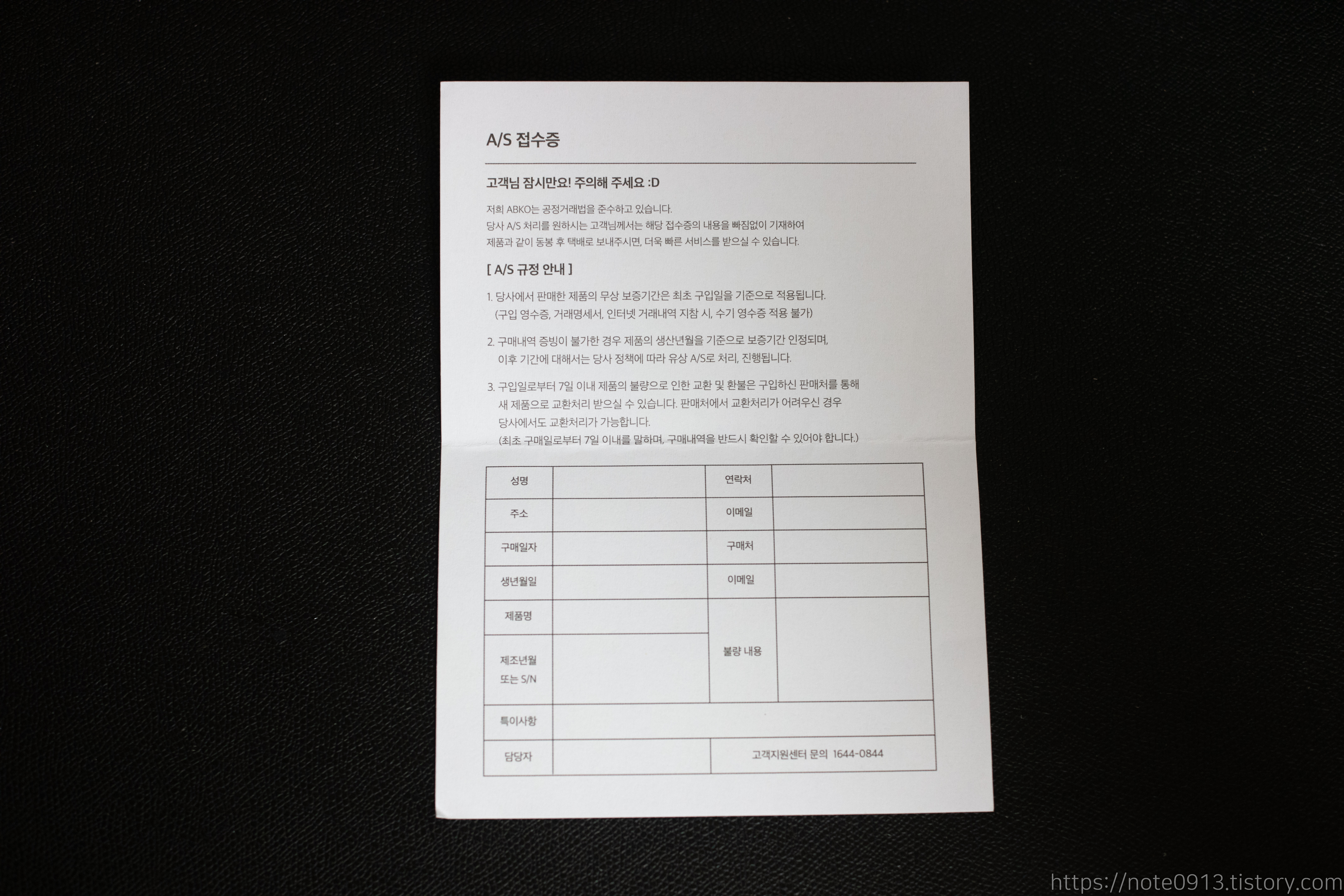 AS 접수증이 있는게 신기했습니다. 고장이나 불량이 잘나서 미리 넣어둔건지 모르겠네요.