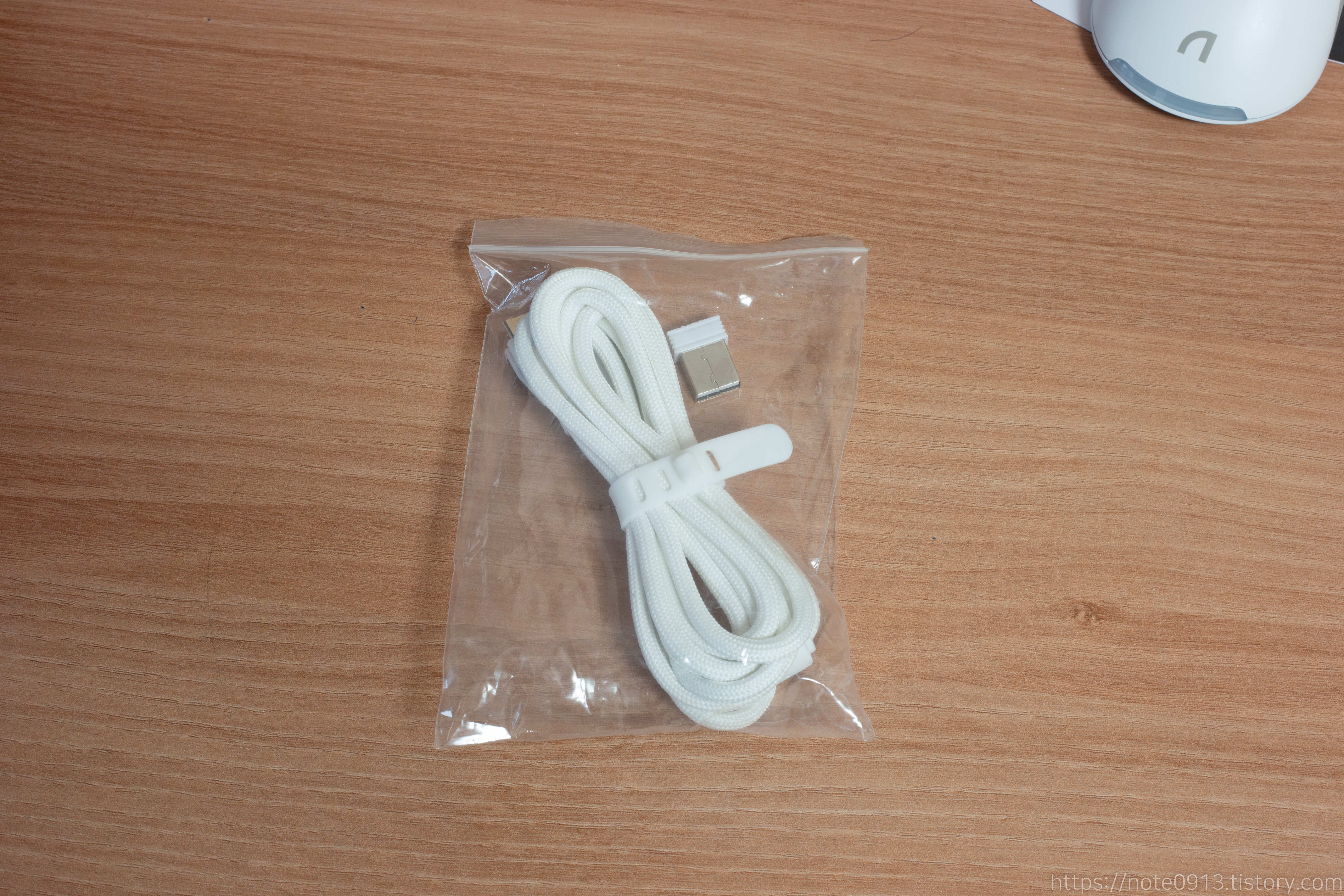 케이블은 USB A to C 케이블이고 둘 다 흰색 색상입니다.
