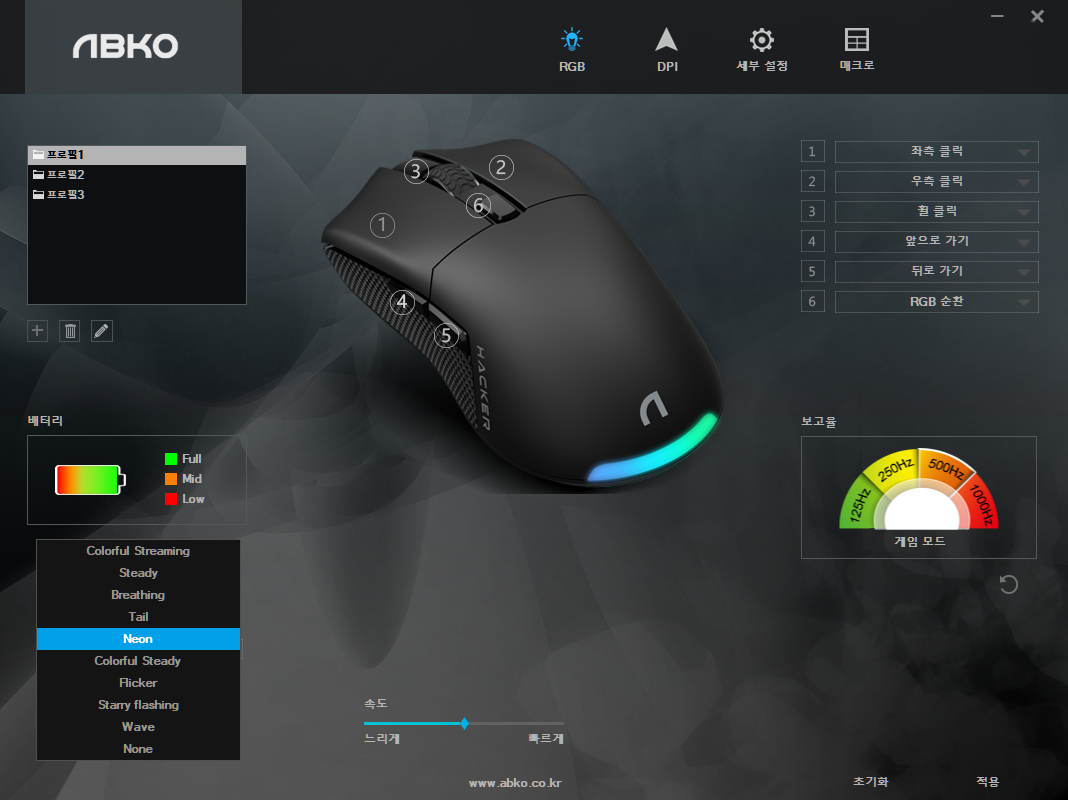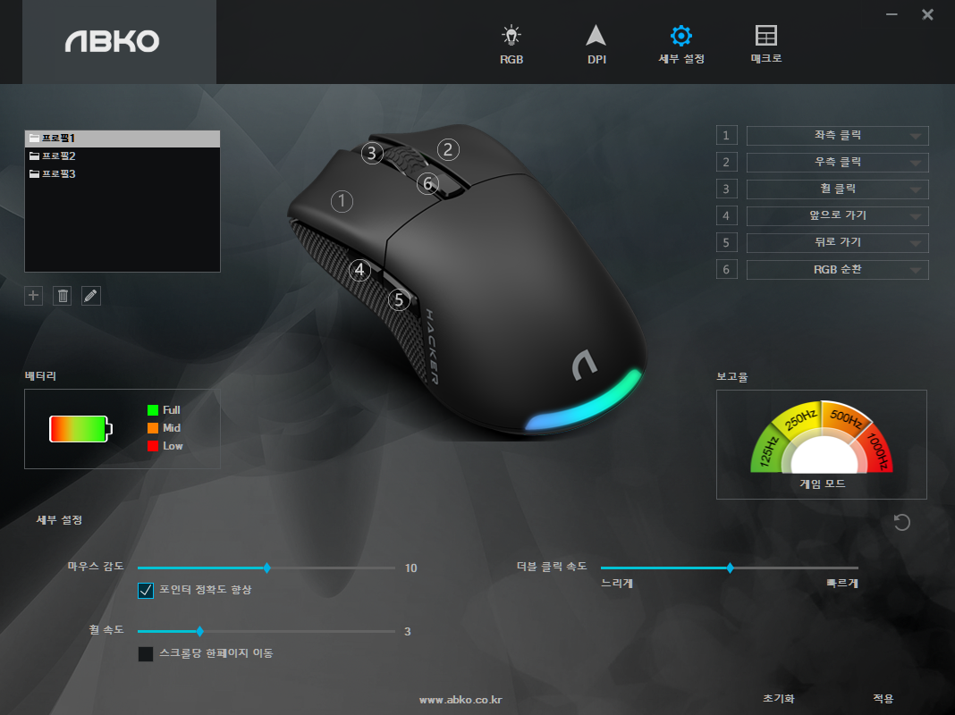 기본적으로 각 마우스 버튼의 동작방식을 변경할 수 있고 각 프로필마다 원하는 설정이 저장이 가능하고 프로그램에서 배터리의 충전 상태, 충전 중인지를 확인할 수 있으며 보고율(폴링레이트)를 설정할 수 있습니다.