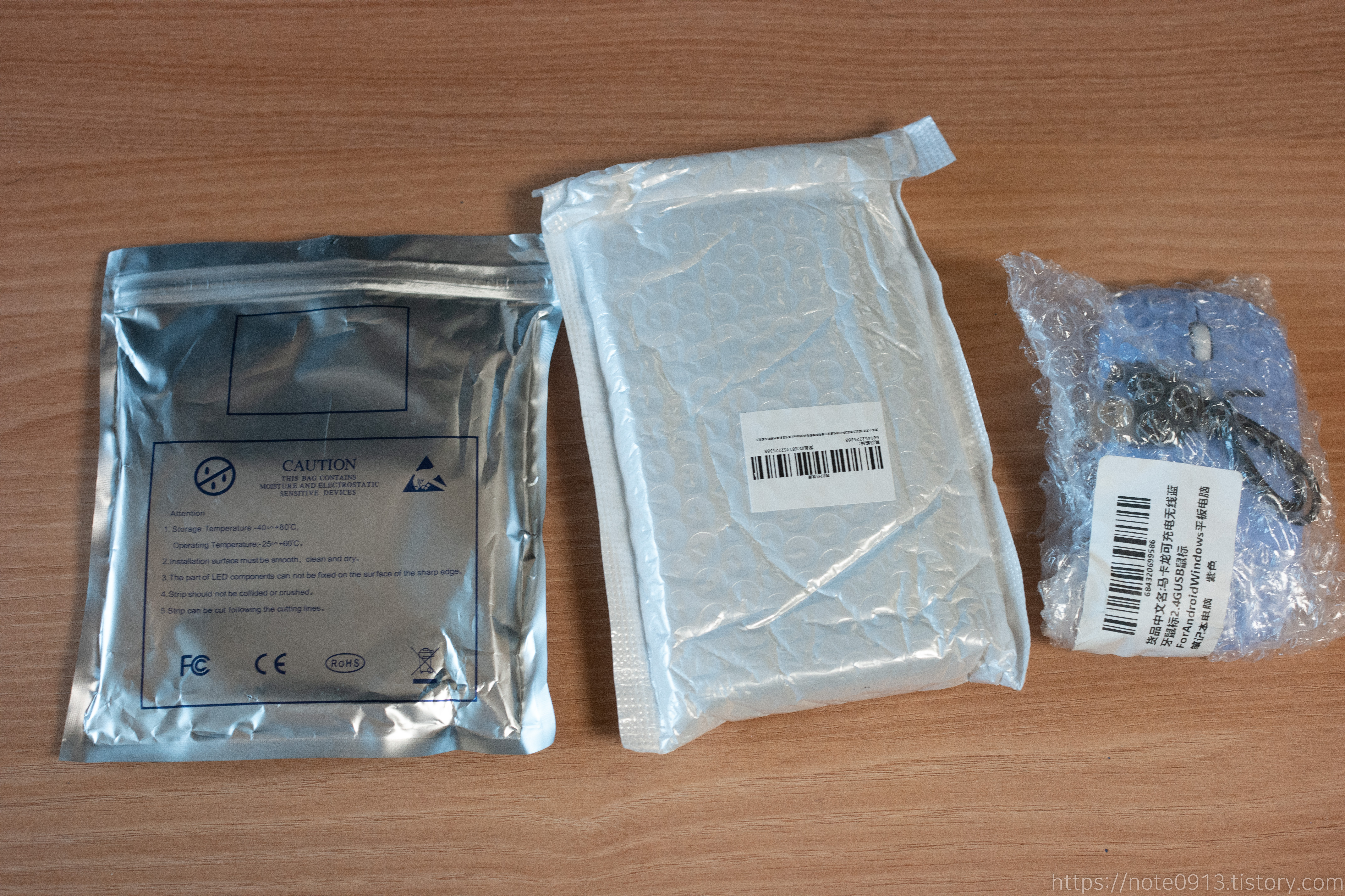왼쪽부터 LED 스트립, 드라이버 세트, 무선 마우스입니다.