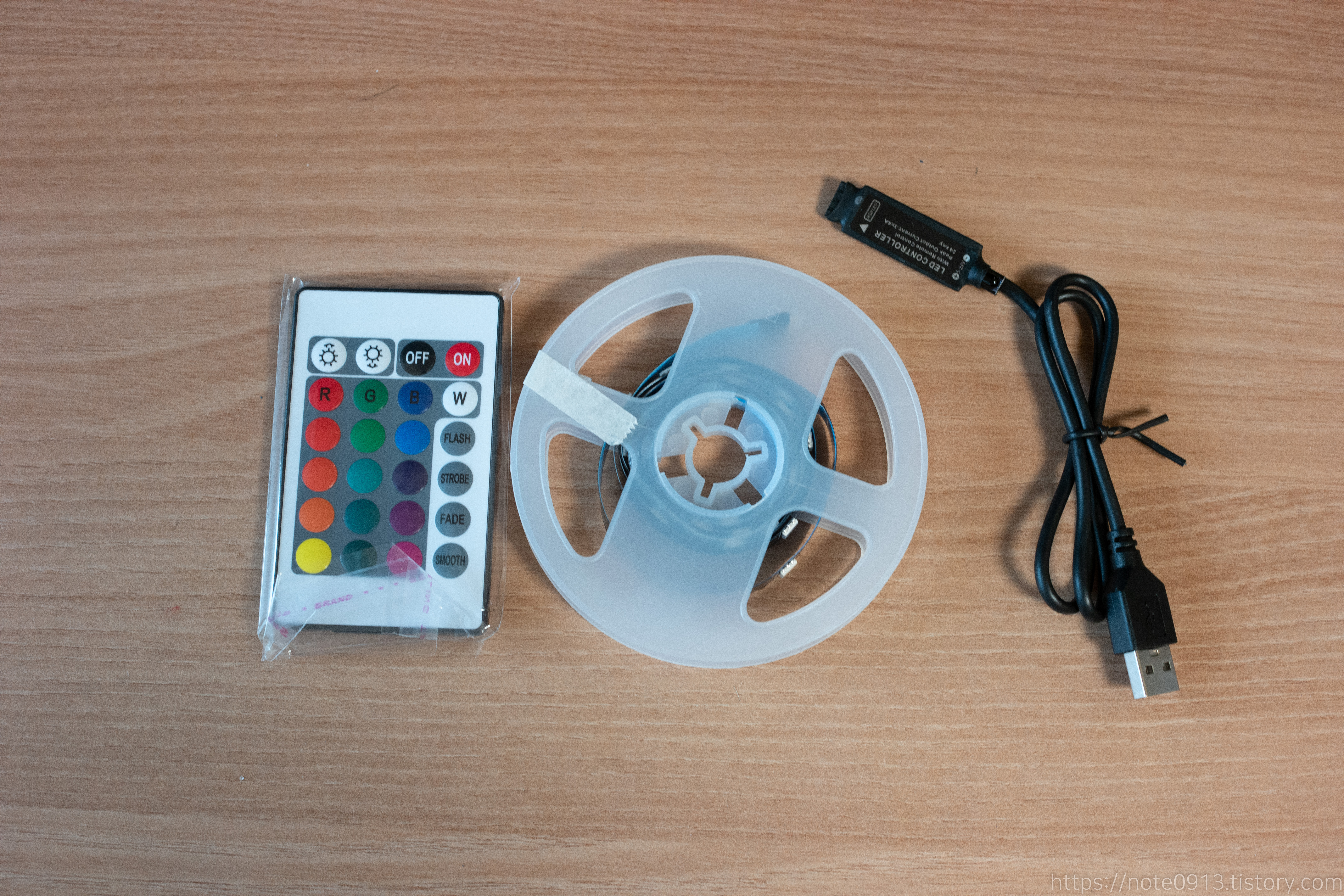 구성품은 리모컨, LED 스트립, USB 연결 케이블이 들어있습니다.