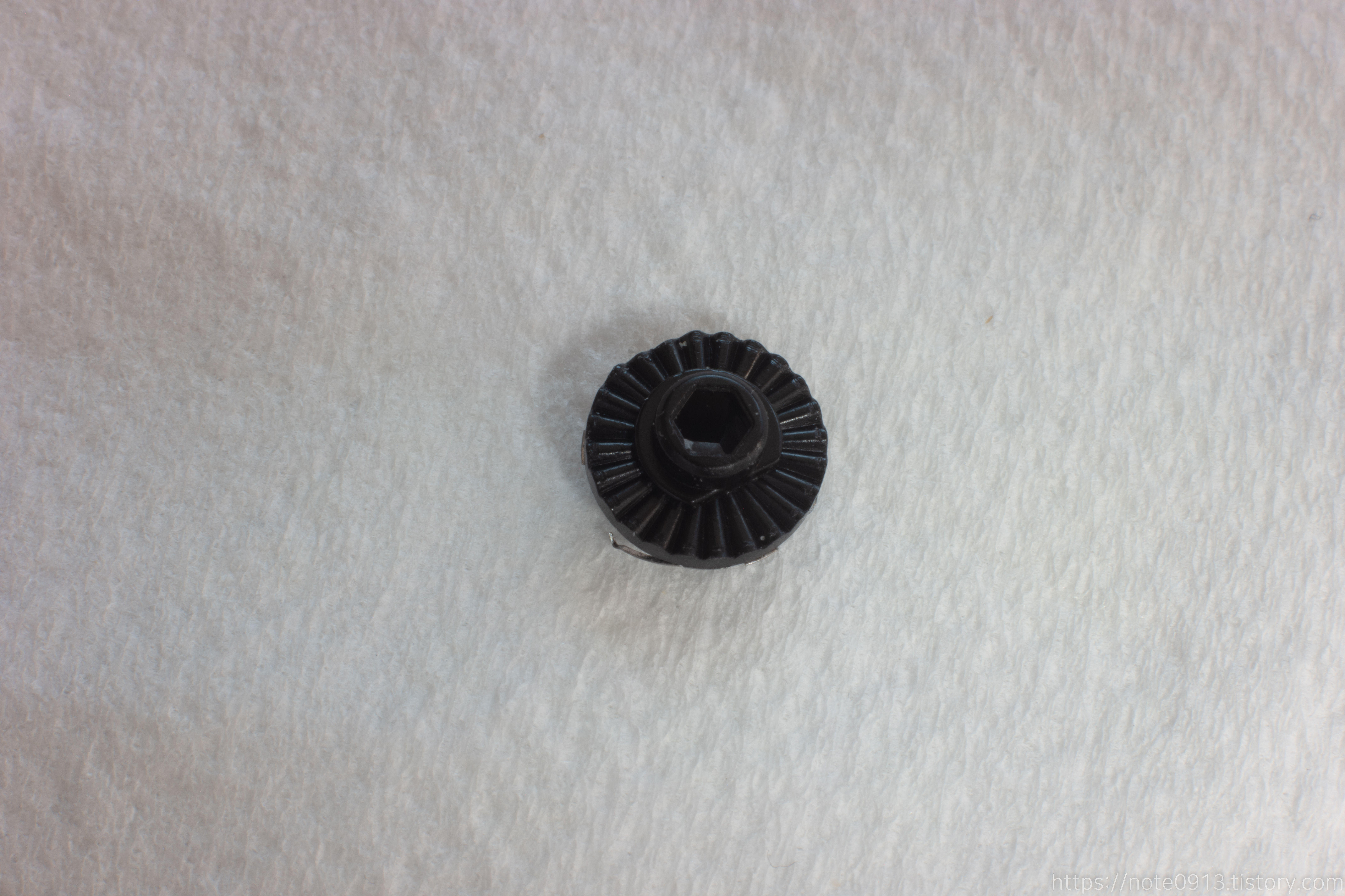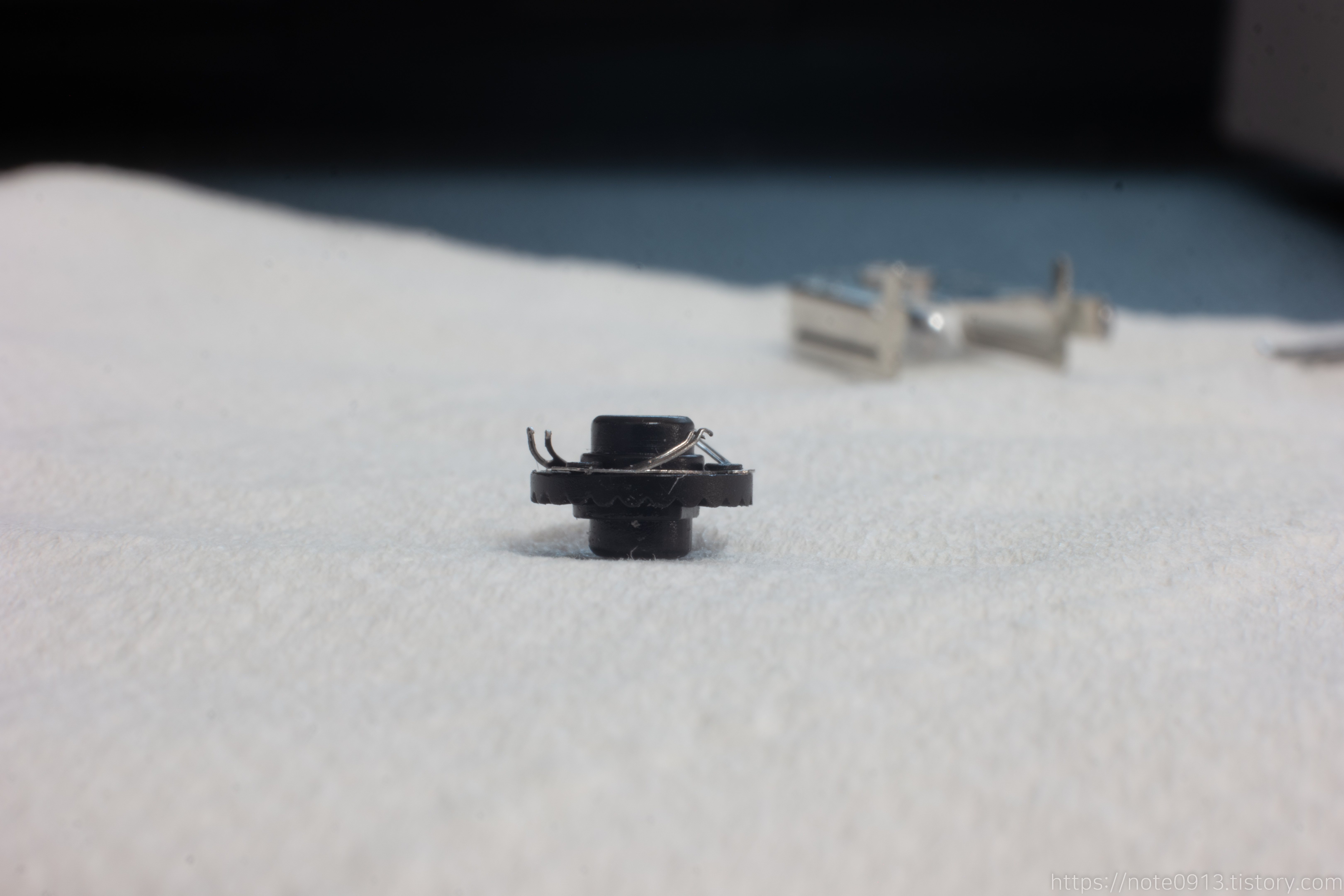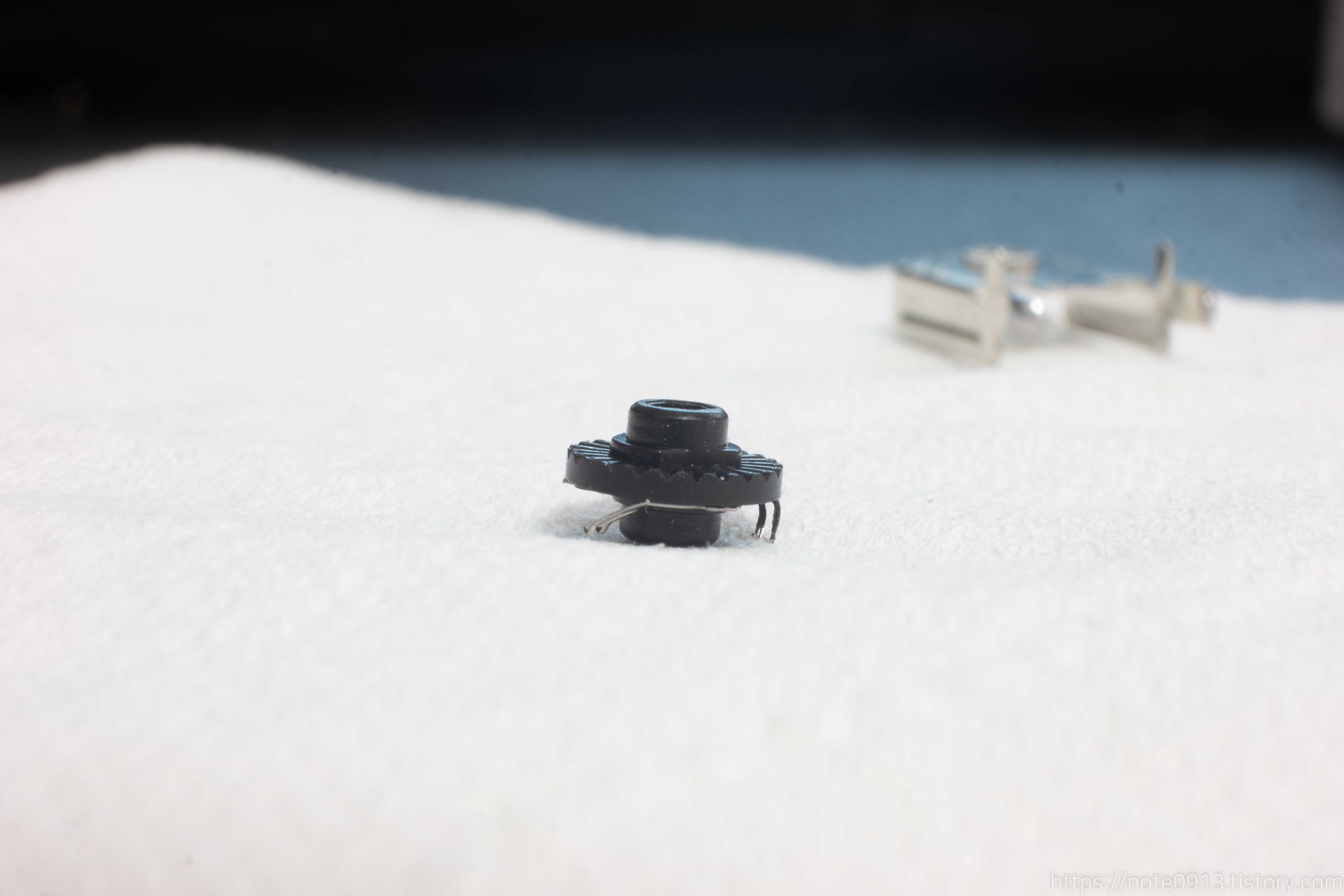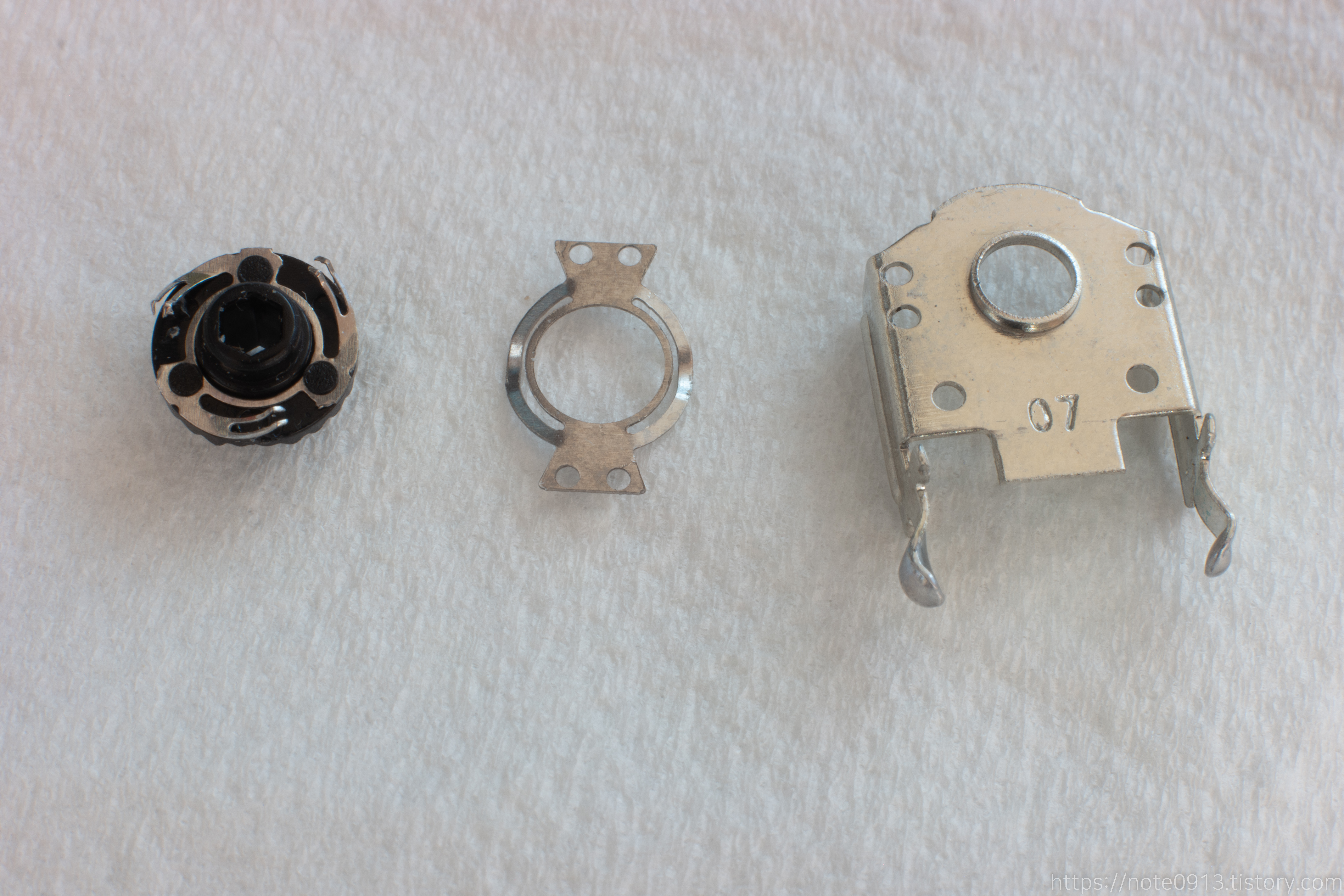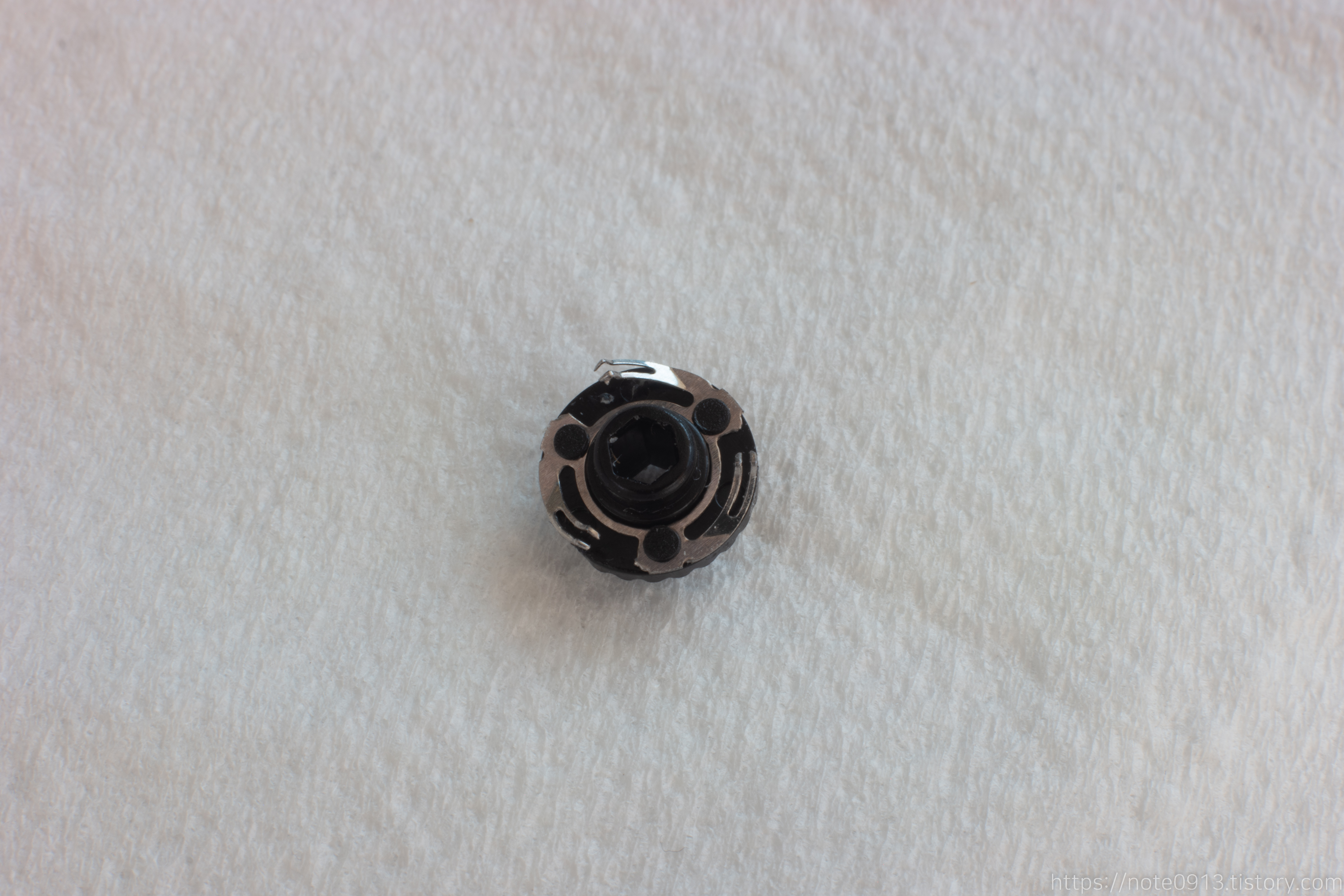 마우스 휠 엔코더의 가장 핵심적인 역할을 담담하는 부품입니다. 120도 각도 마다 접점이 있고 이 접점을 통해 마우스 휠이 작동합니다. 앞에는 접점이 있고 뒤에는 홈이 파여 있어서 뒤는 구분감, 앞은 휠 기능을 제공합니다.