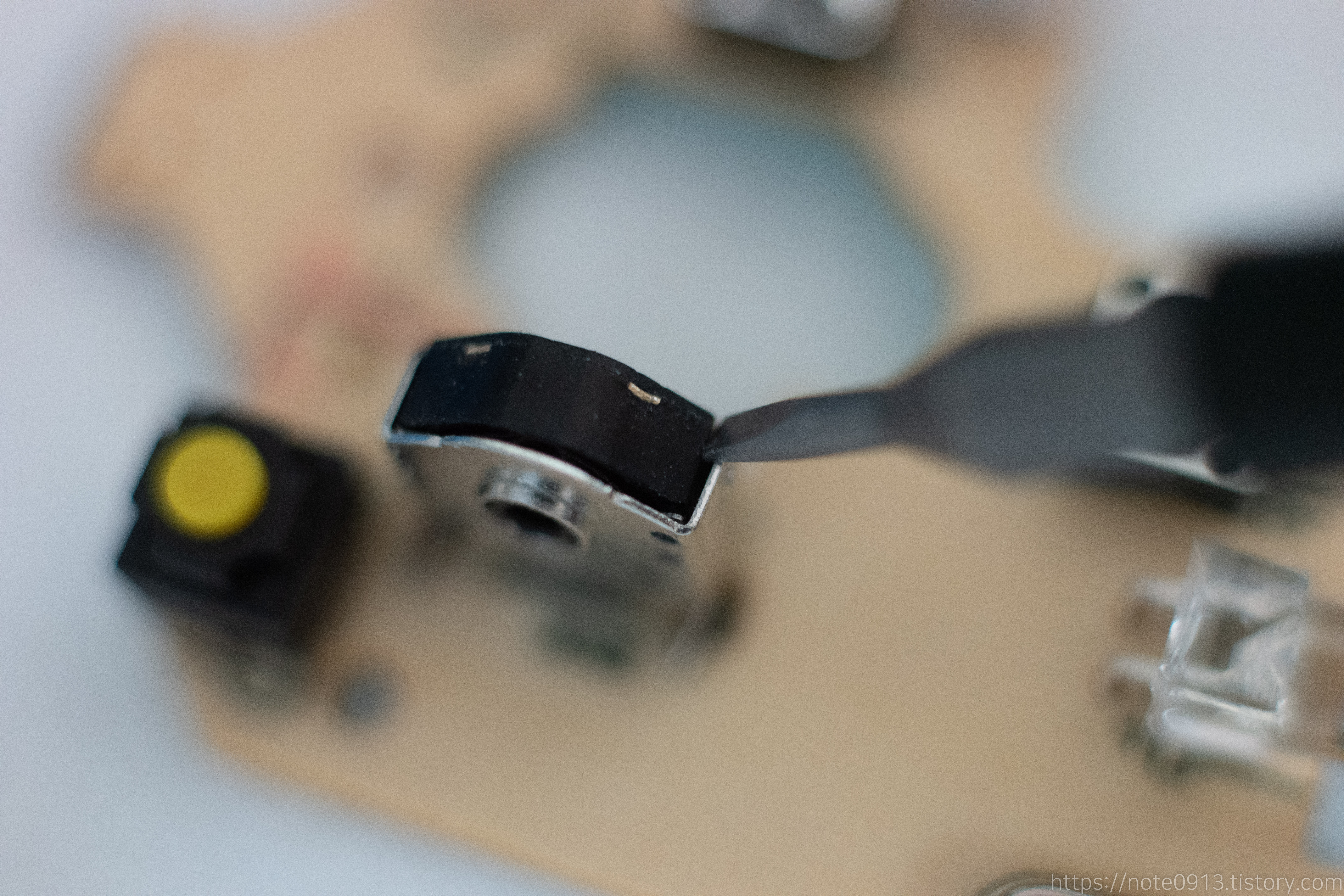 그래서 휠을 고쳐보고자 마우스 휠 부품인 엔코더를 분해했습니다. 분해해도 안되면 엔코더를 교체하면되지라는 생각으로 분해를 해보았습니다.
