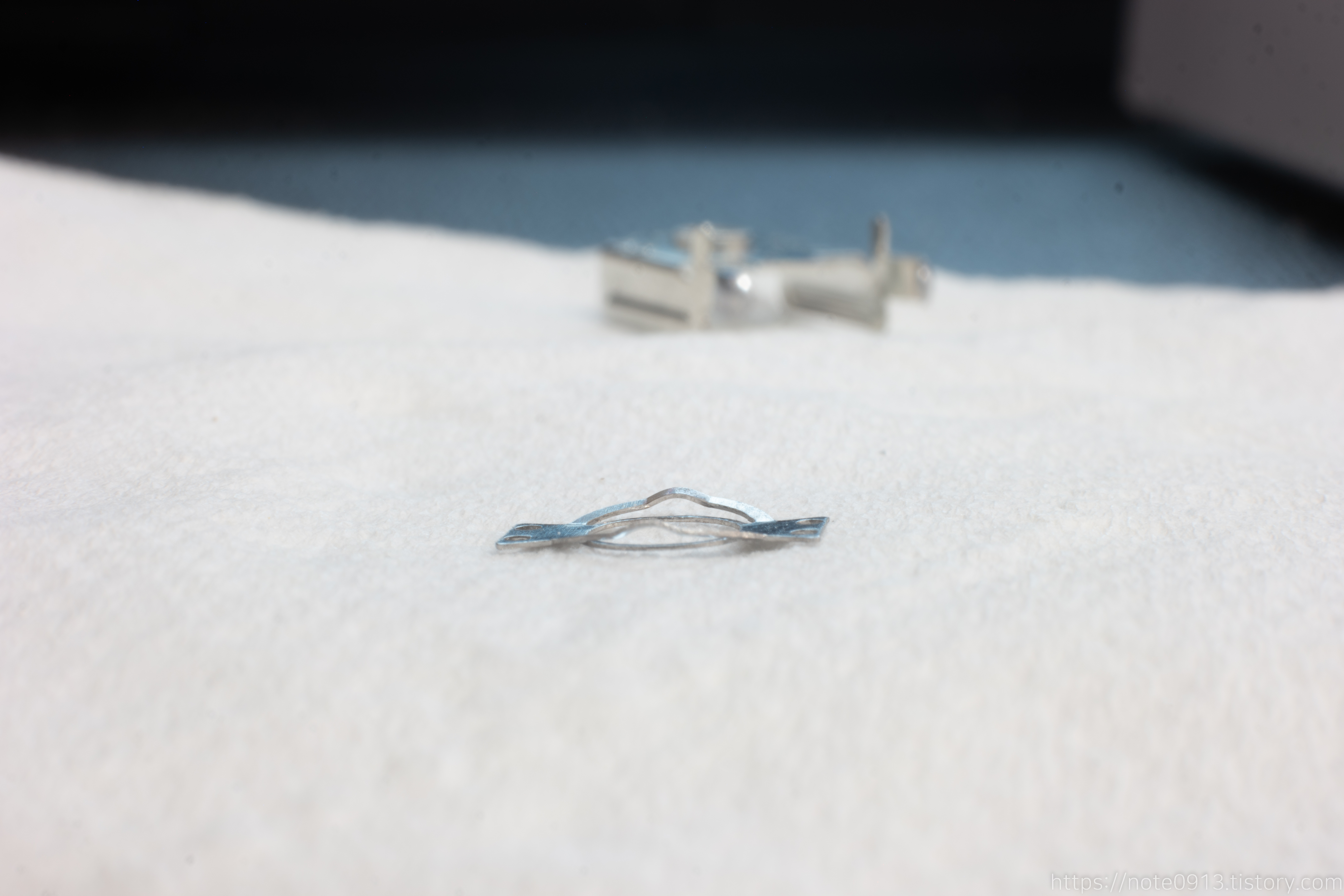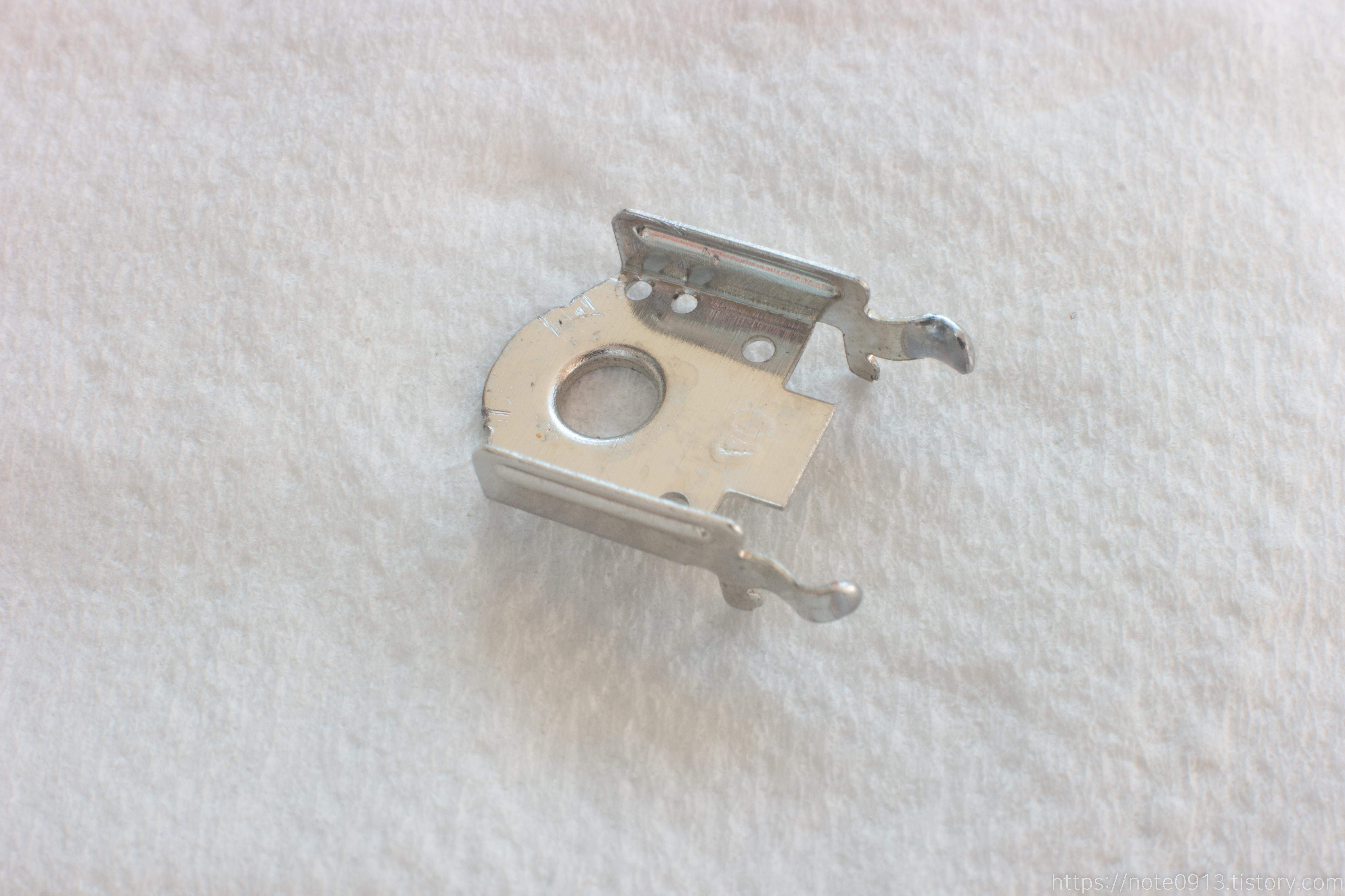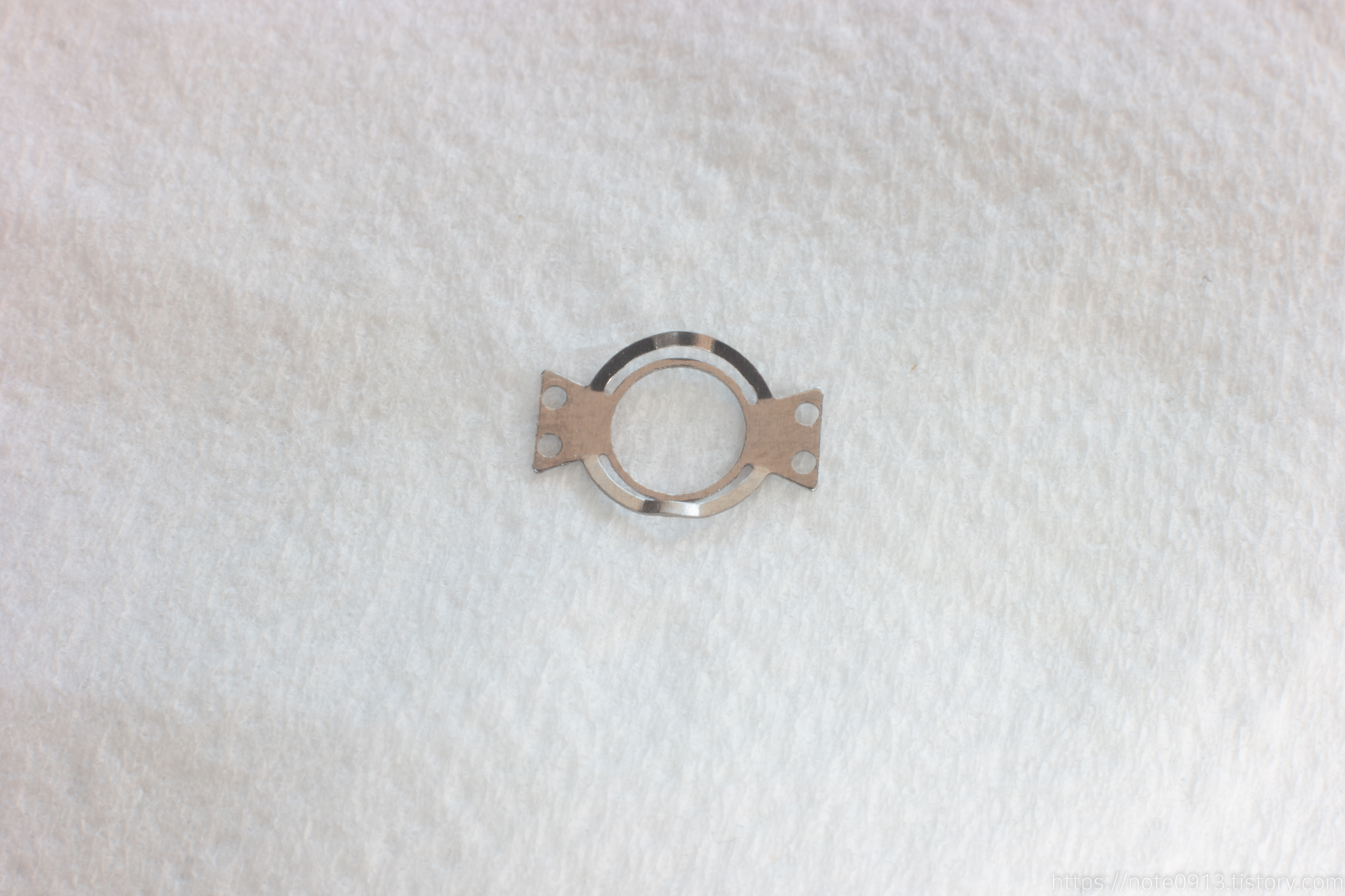 이 금속판은 회전부 부품과 닿아서 휠을 돌리거나 할 때 딱딱 끊기는 느낌을 주는 이른바 구분감을 제공하는 기능을 담당합니다. 마치 기어처럼 비슷하게 작동합니다.