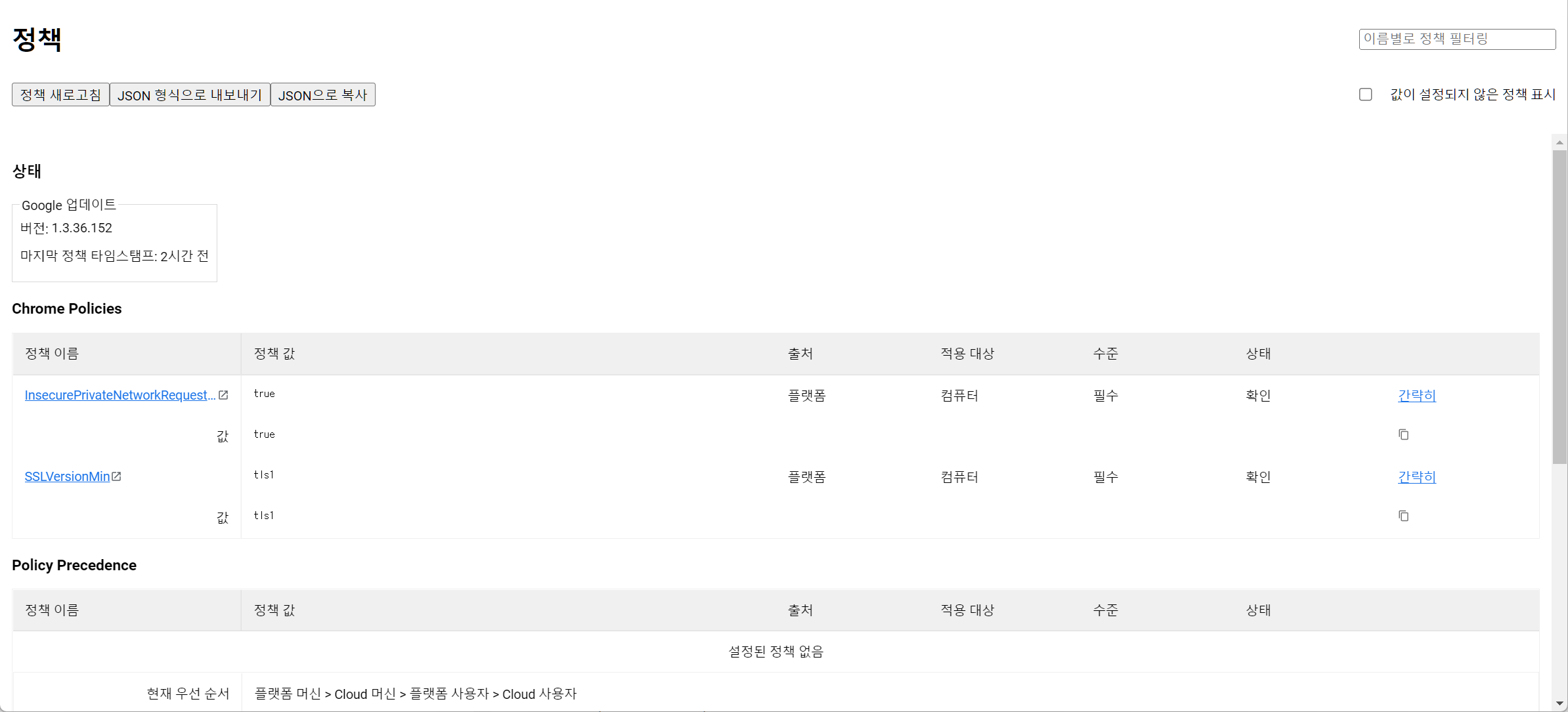 크롬의 정책화면에서는 활성화된 정책들을 확인할 수 있습니다.