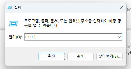 레지스트리 편집기를 실행해 줍니다. 시작 메뉴에서 검색하거나 Win + R 단축키를 이용해 실행에서 regedit을 입력하면 레지스트리 편집기가 실행됩니다.