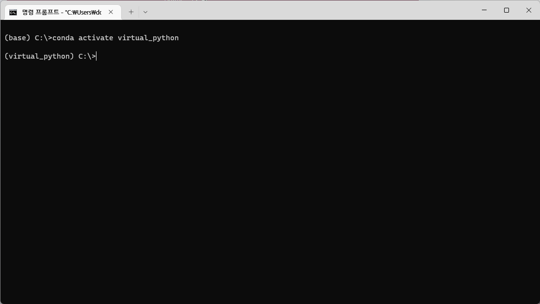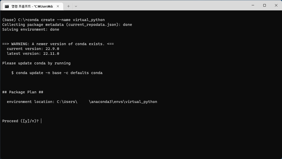 conda create -n virtual_python 또는 conda create --name virtual_python 명령어를 입력하면 됩니다.