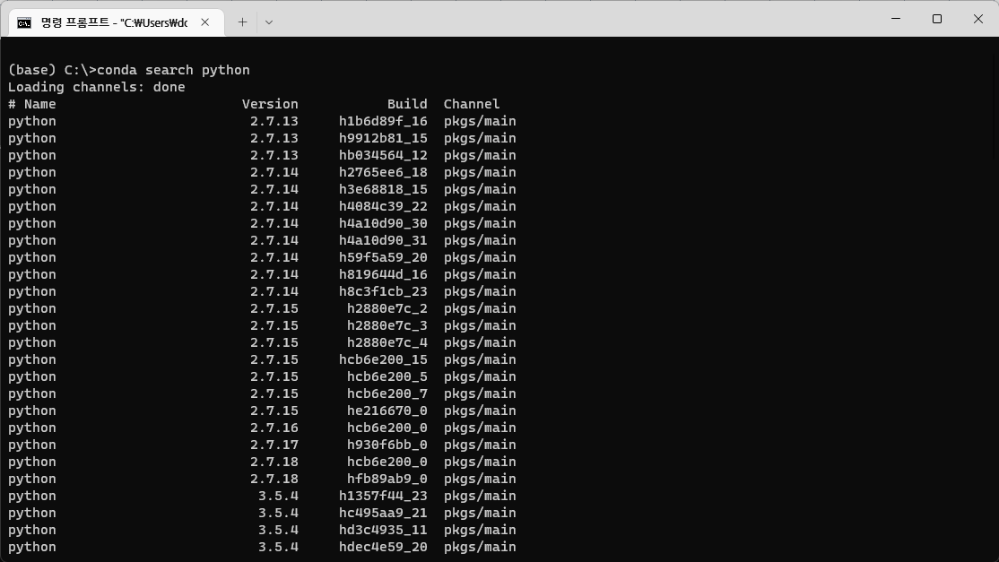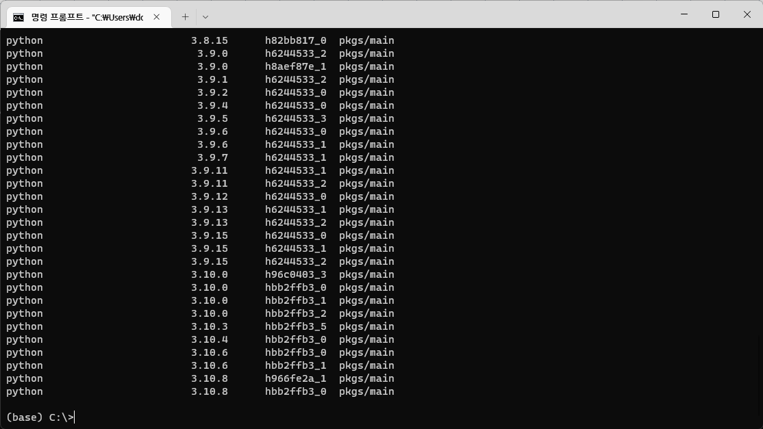conda search python 명령어로 설치가능한 파이썬 버전들을 확인할 수 있습니다.