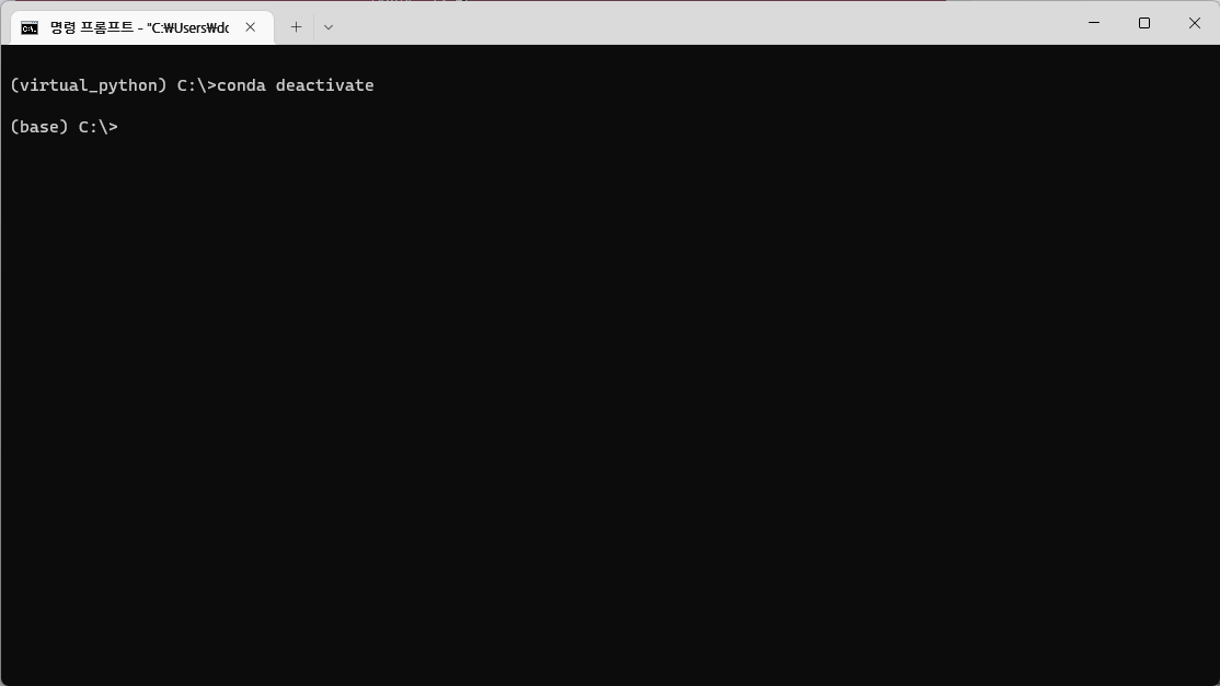 conda deacitvate 명령어를 입력하면 가상환경이 비활성화 됩니다. 위 사진을 보면 아나콘다 기본환경인 (base) 돌아오는 것을 확인할 수 있습니다.