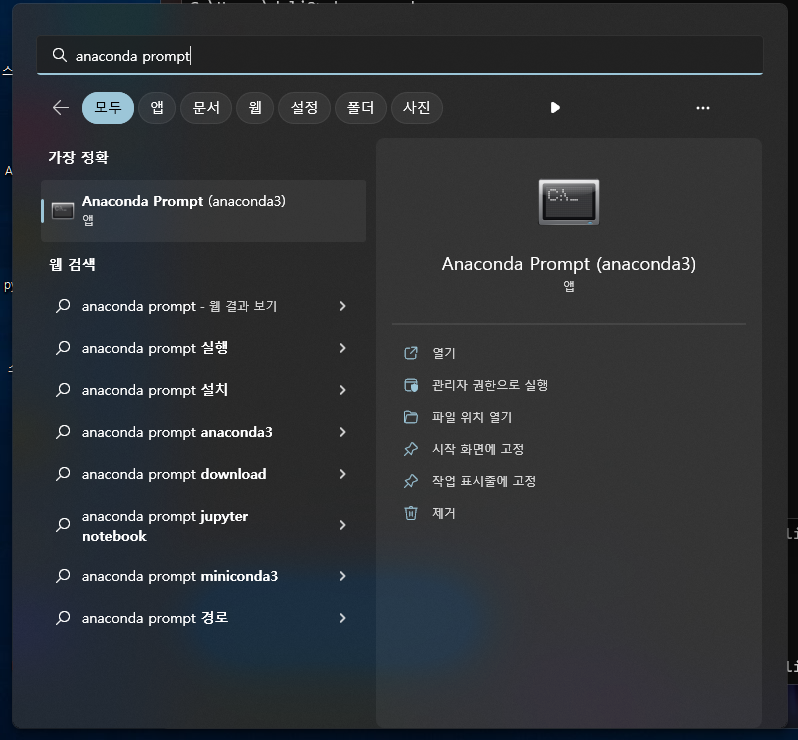 아나콘다 가상환경을 실행하기위해 아나콘다 프롬프트(Anaconda Prompt) 또는 아나콘다 파워셀 프롬프트(Anaconda Powershell Prompt)를 실행해 줍니다.