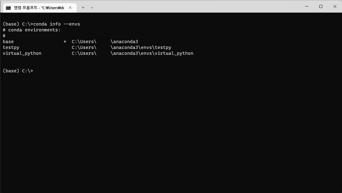 아나콘다에서 생성된 가상환경 목록을 확인할 수 있습니다.
