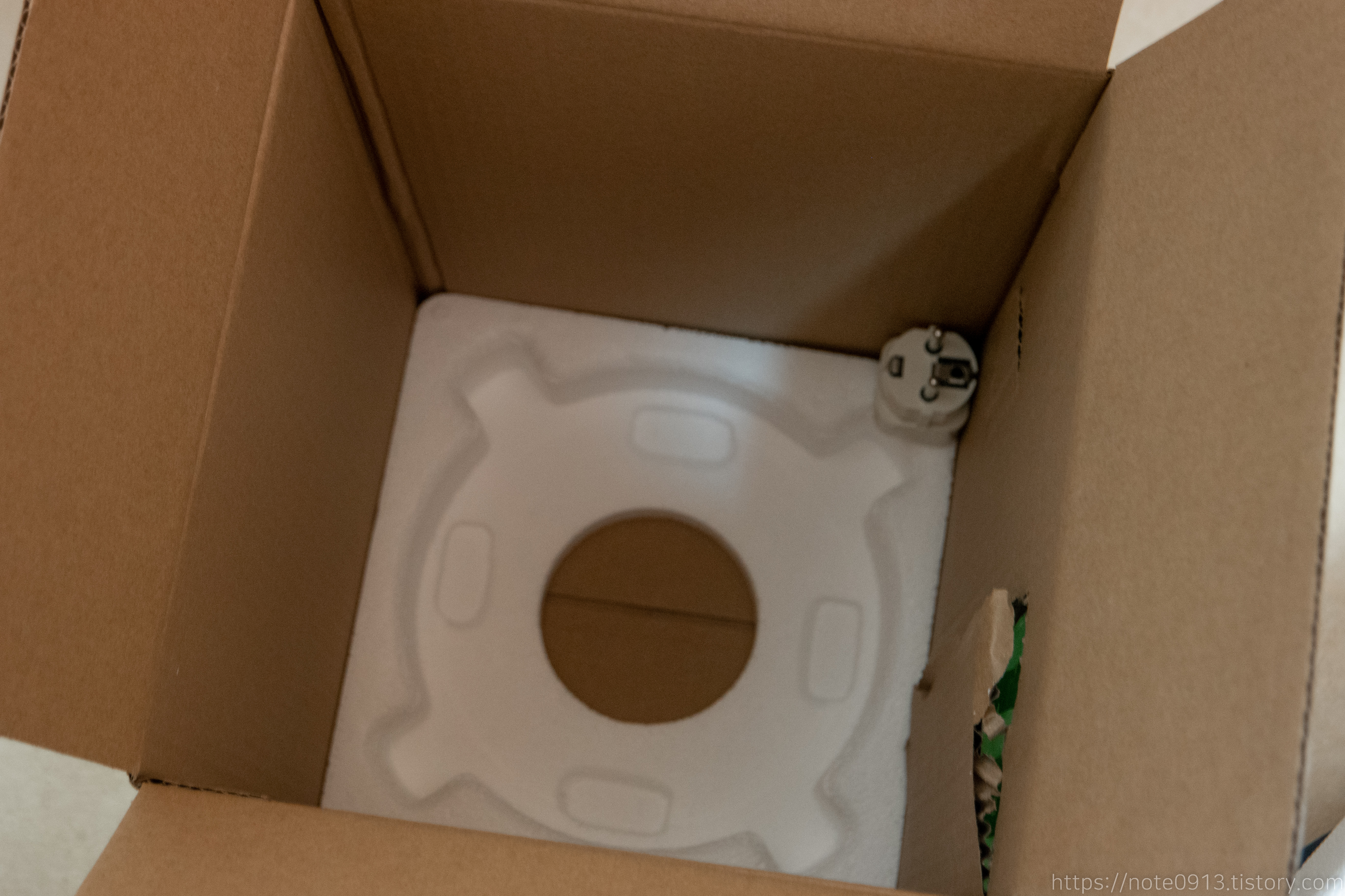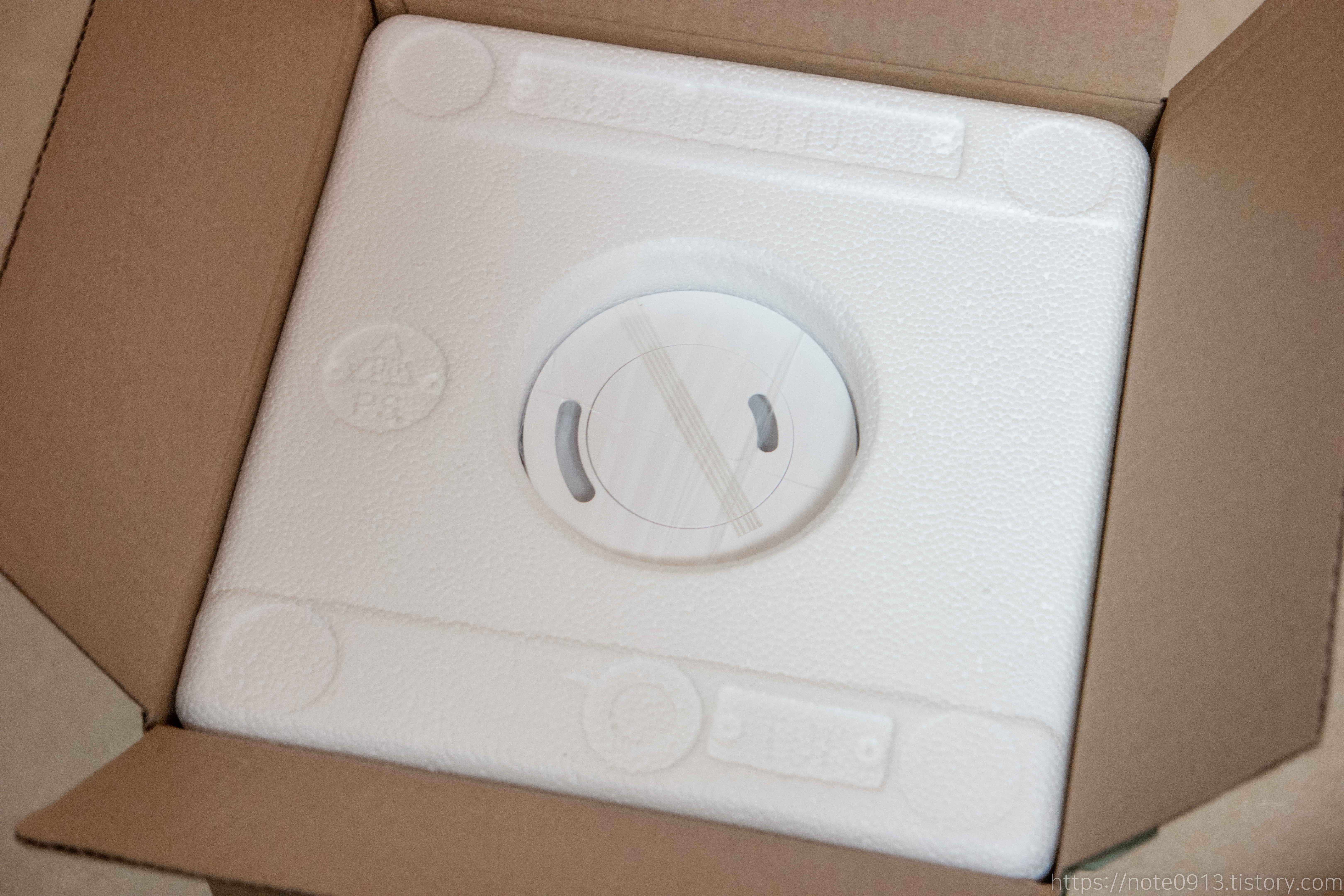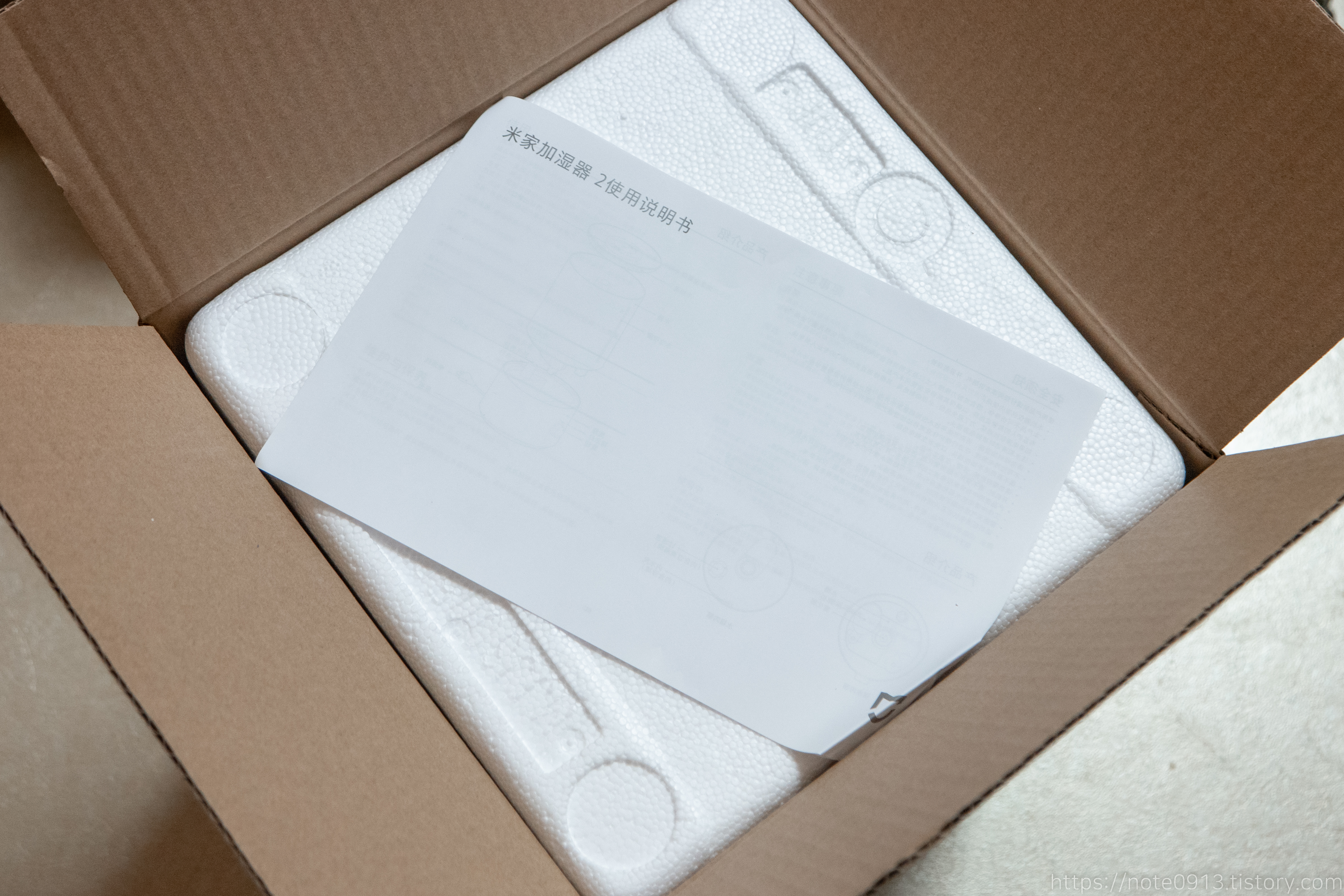 박스를 열면 제일 먼저 보이는 것은 설명서입니다. 설명서 밑에는 스티로폼으로 가습기가 안전하게 포장되 있네요.