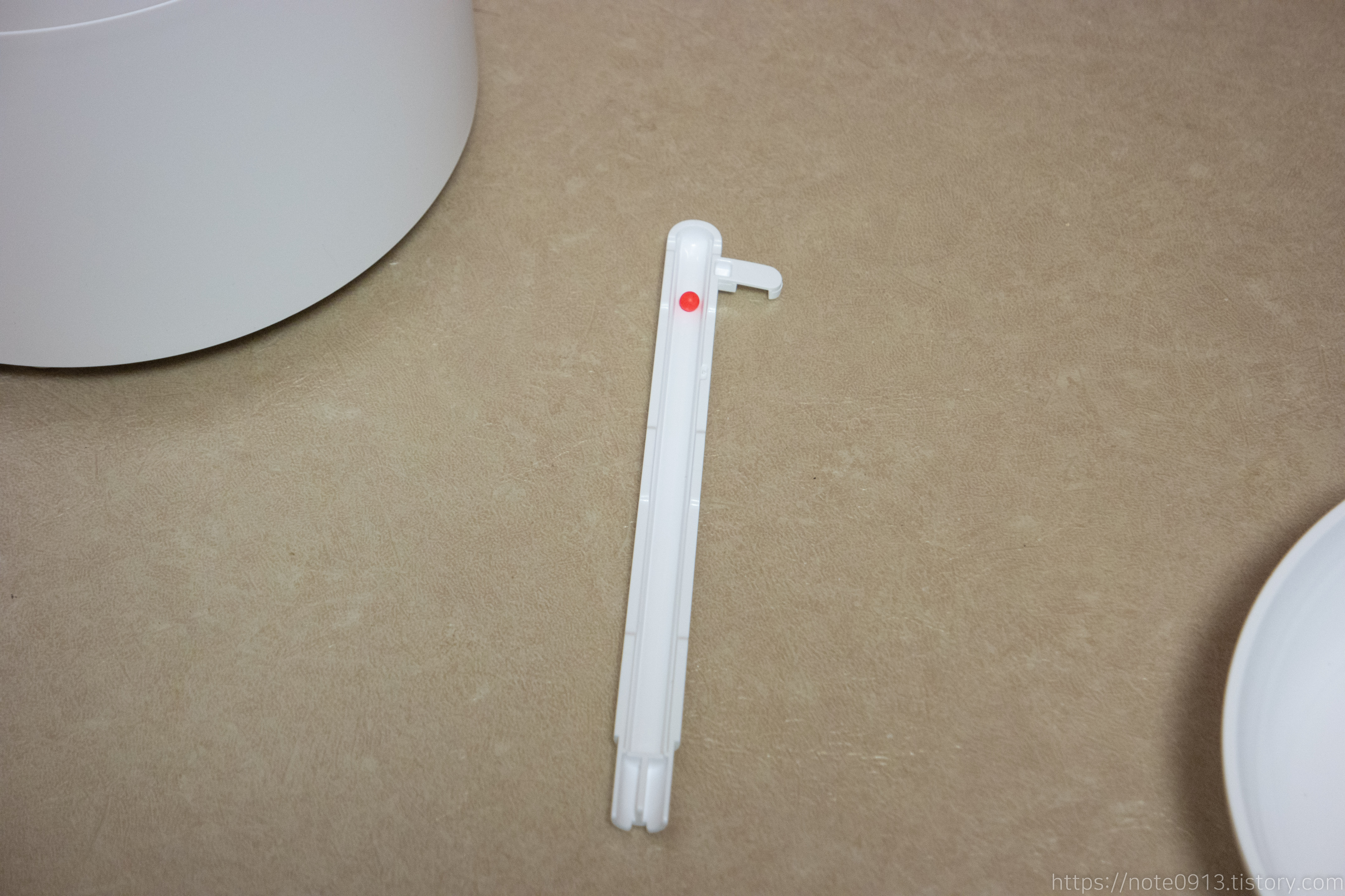 수조 벽면에 보면 남은 물의 잔량을 알 수 있는 게이지가 있는데 분리가 가능합니다. 분리하면 빨간색 플라스틱 공이 있습니다. 플라스틱 공이 물에 띄어져서 물의 잔량을 알려주는 방식입니다. 플라스틱 공이 작아서 분리할 때 잊어버리지 않게 조심해야 할 것 같습니다.