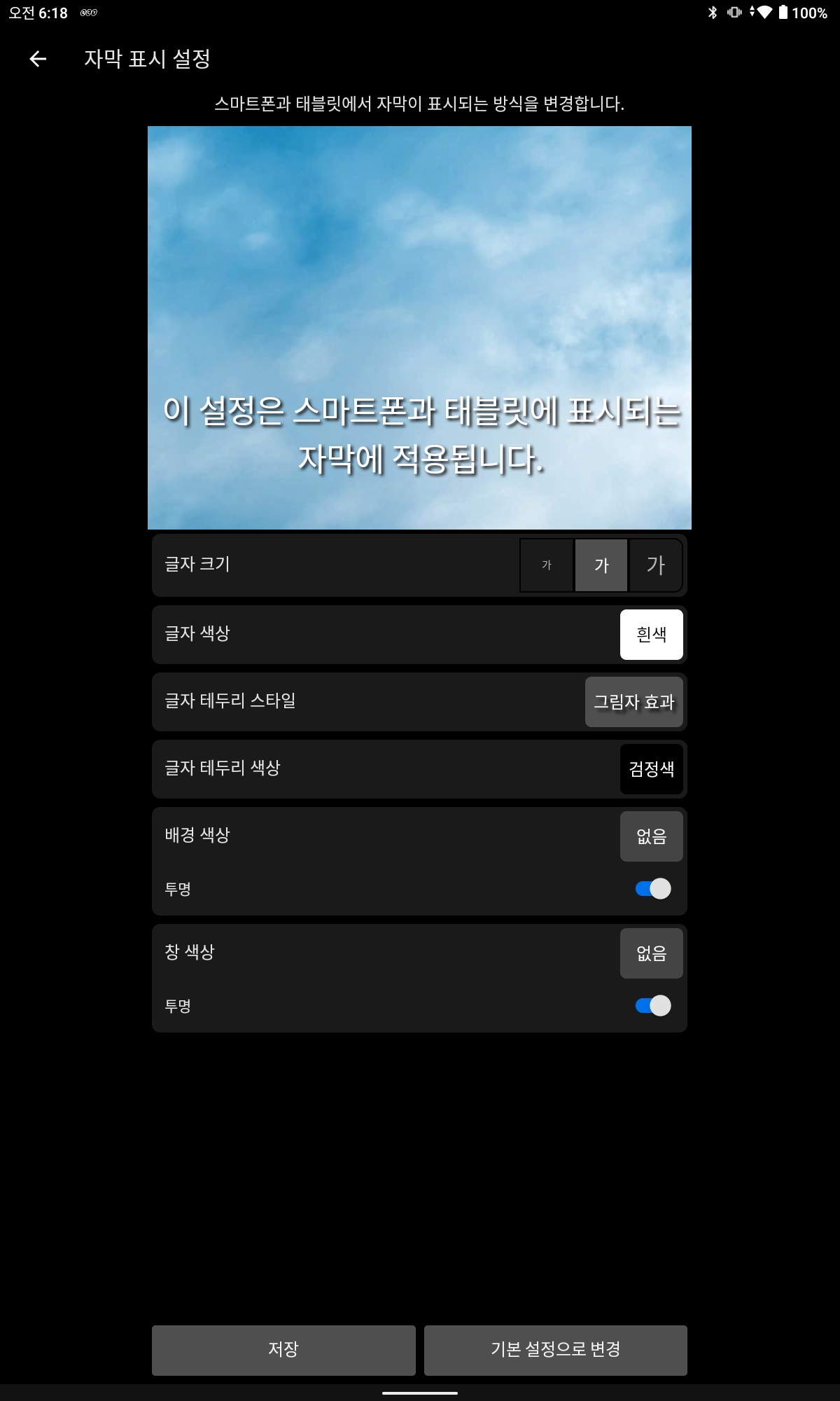 자막 표시 설정으로 들어가면 자막을 원하는 스타일로 변경할 수 있습니다. 글자 크기, 글자 색상, 글자 테두리, 배경 등등 다양하게 변경할 수 있습니다. 자막 설정 후 저장을 눌러주면 됩니다.