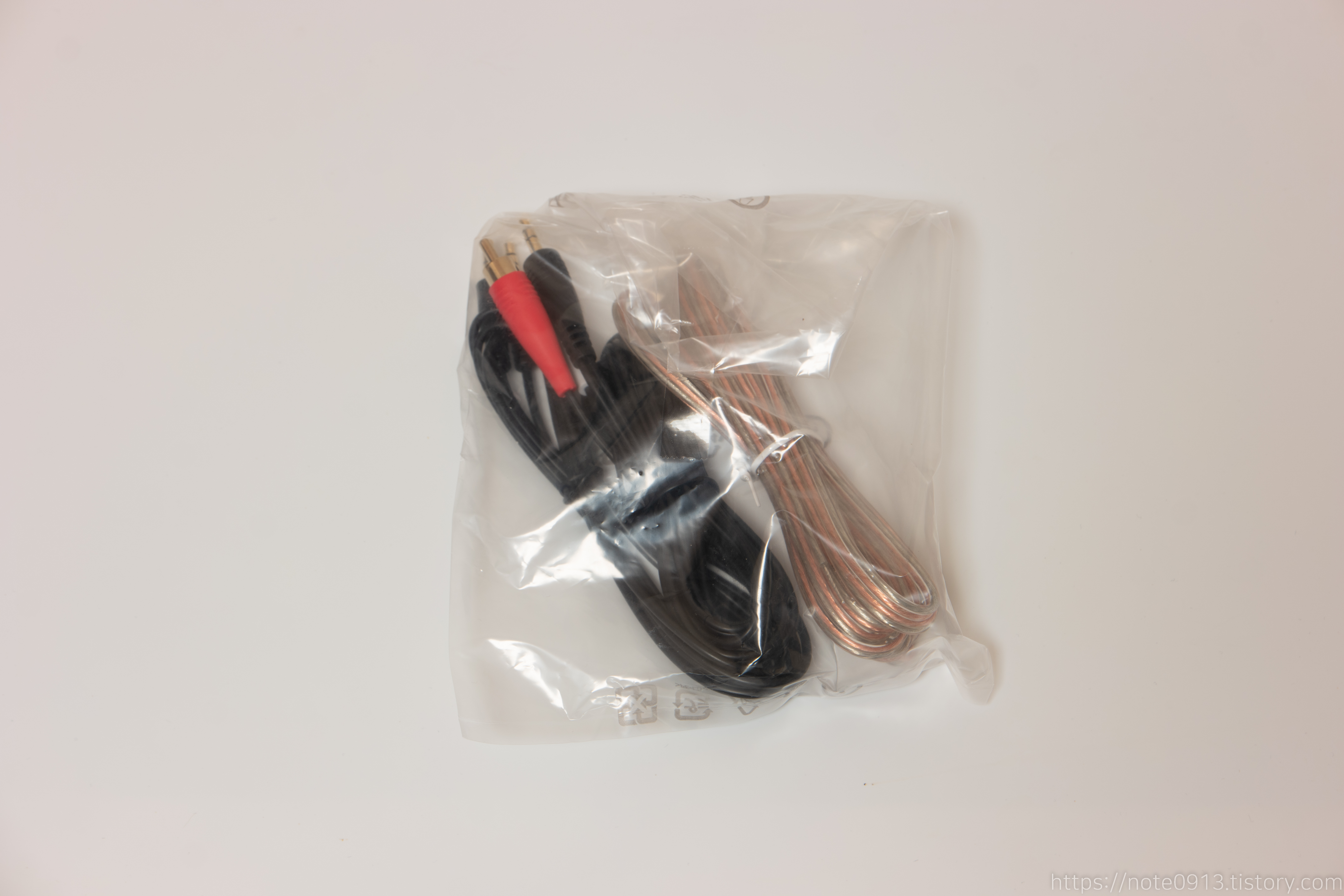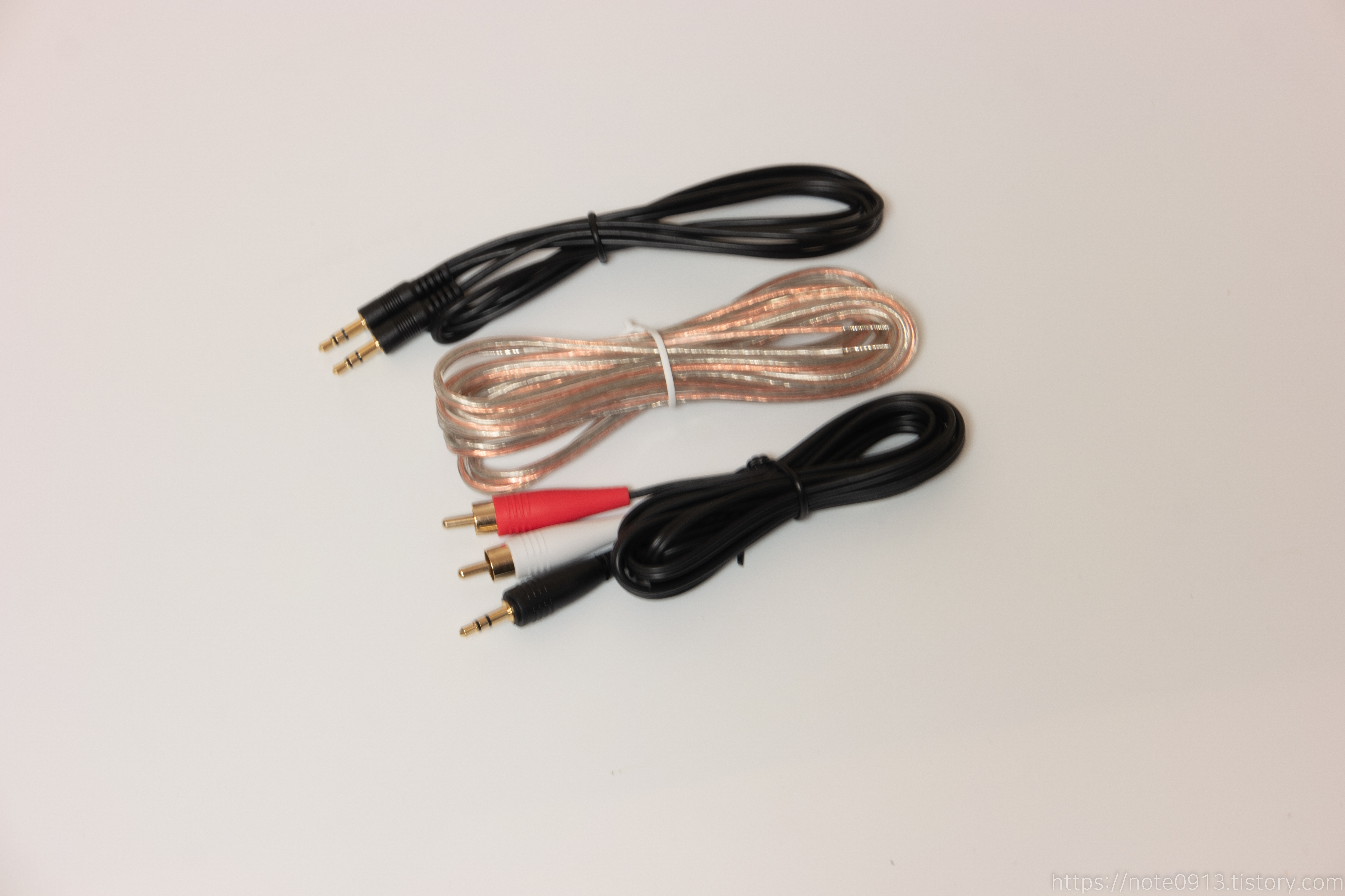 케이블은 스피커 케이블, 3.5mm AUX 케이블, 3.5mm to RCA 케이블로 구성되어 있습니다.