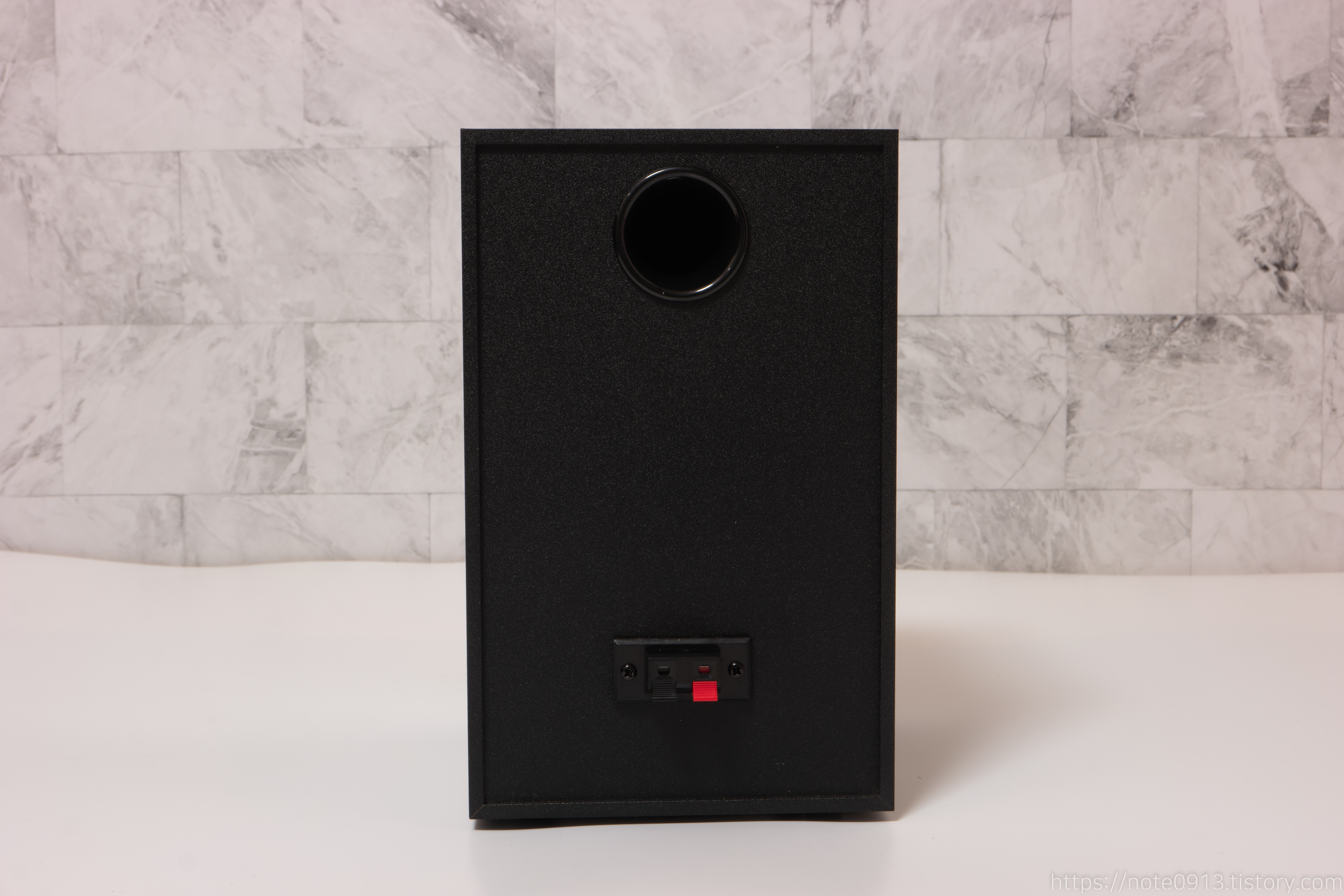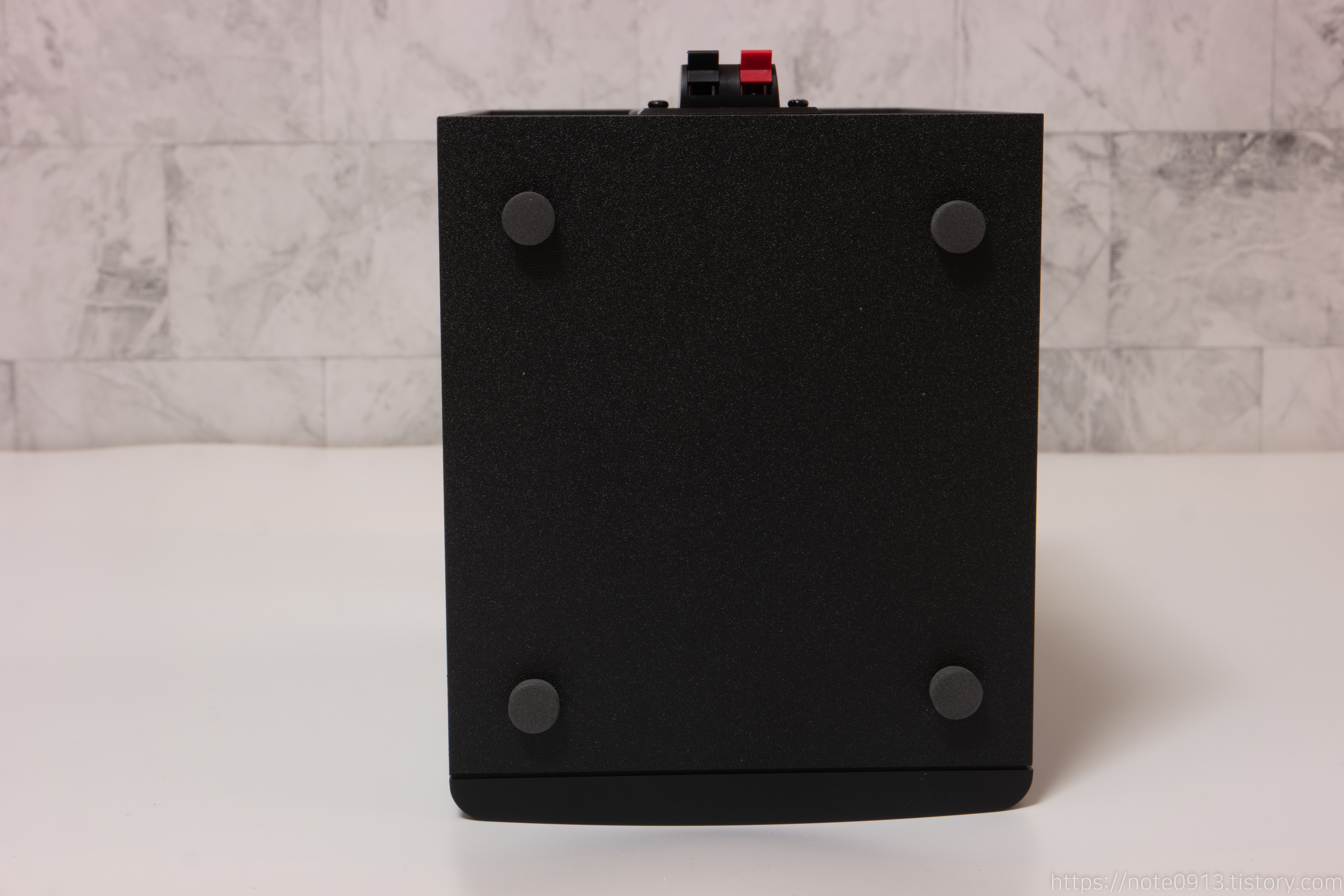 왼쪽 스피커 뒤쪽에는 덕트 구멍과 스피커 케이블을 연결할 수 있는 단자가 존재합니다. 밑면 바닥에는 스펀지 형태의 발판이 있습니다.