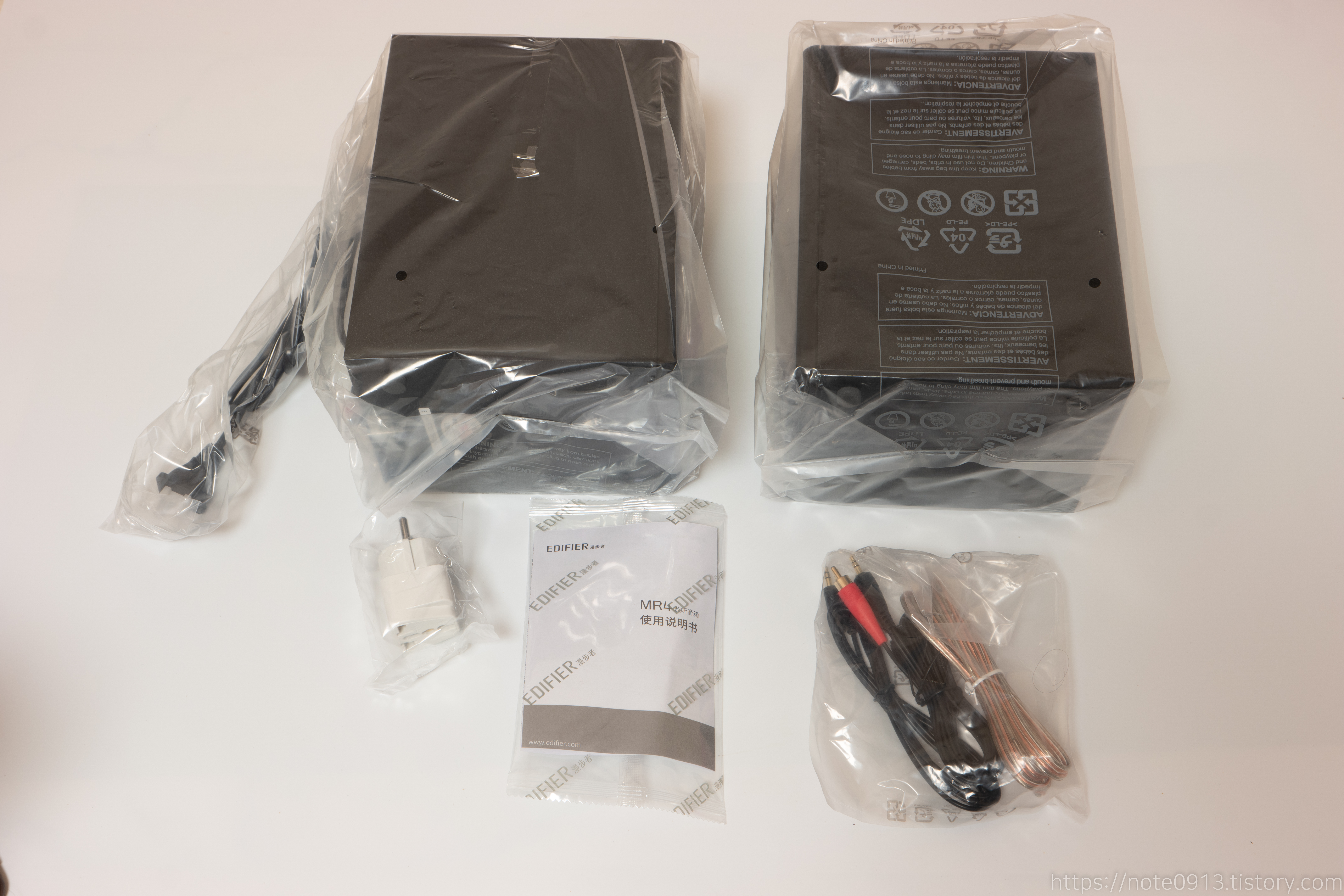 구성품입니다. MR4 스피커, 설명서, 각종 케이블, 그리고 전원 플러그 어댑터가 들어있습니다.