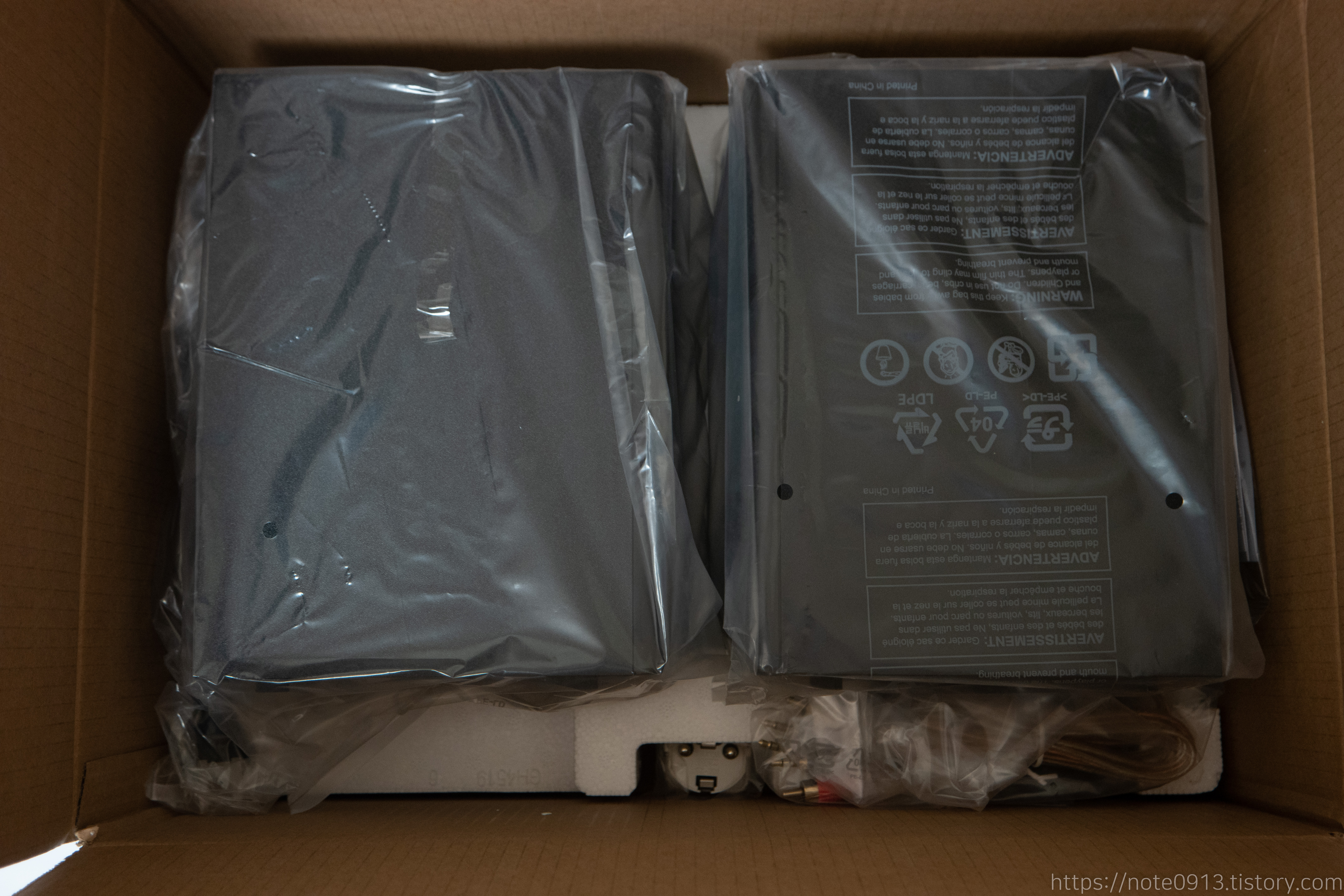 박스를 여니 스티로폼으로 잘 포장되어 있습니다. 스티로폼을 제거하면 비닐로 잘 포장된 스피커 2개가 나오네요.