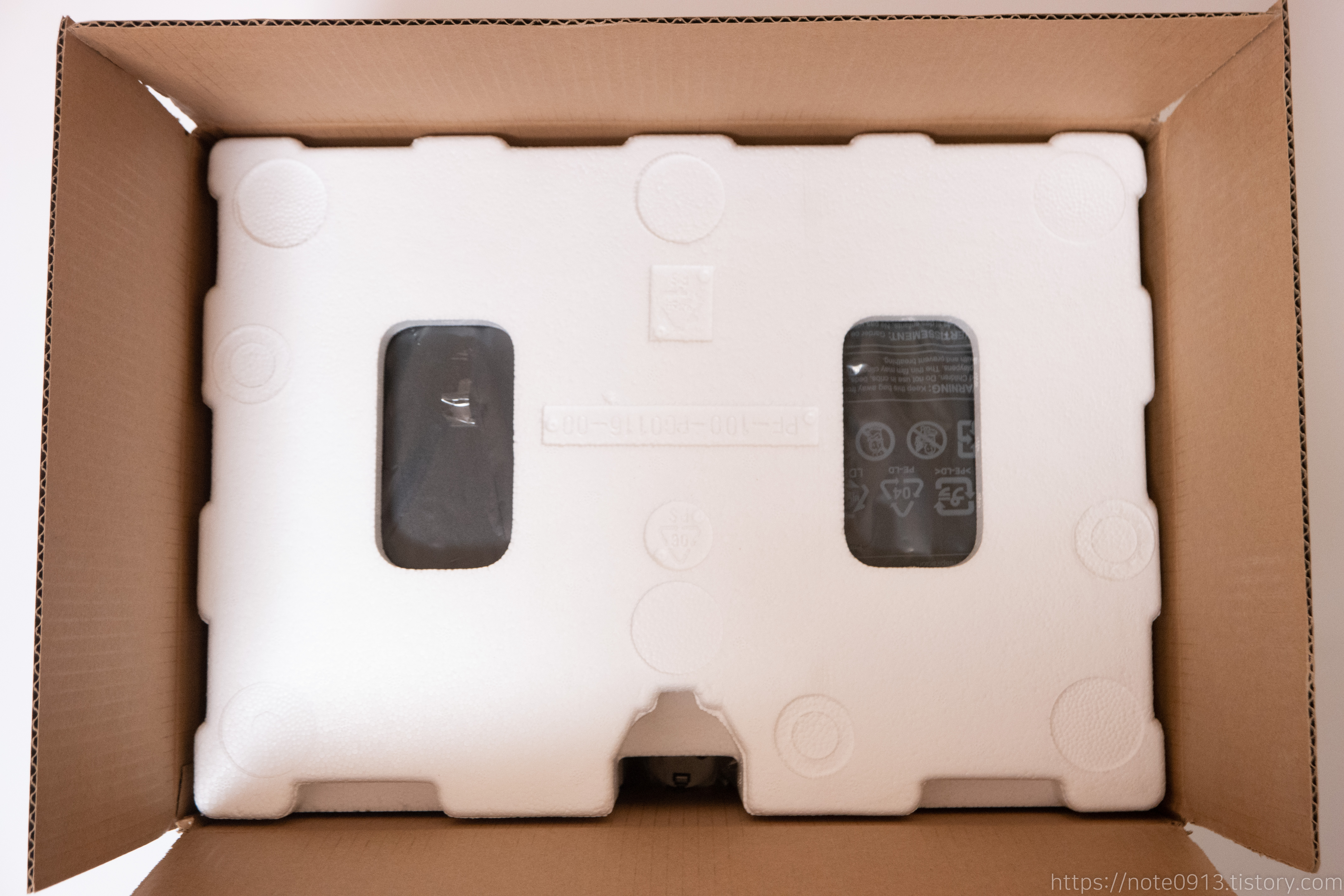 박스를 여니 스티로폼으로 잘 포장되어 있습니다. 스티로폼을 제거하면 비닐로 잘 포장된 스피커 2개가 나오네요.