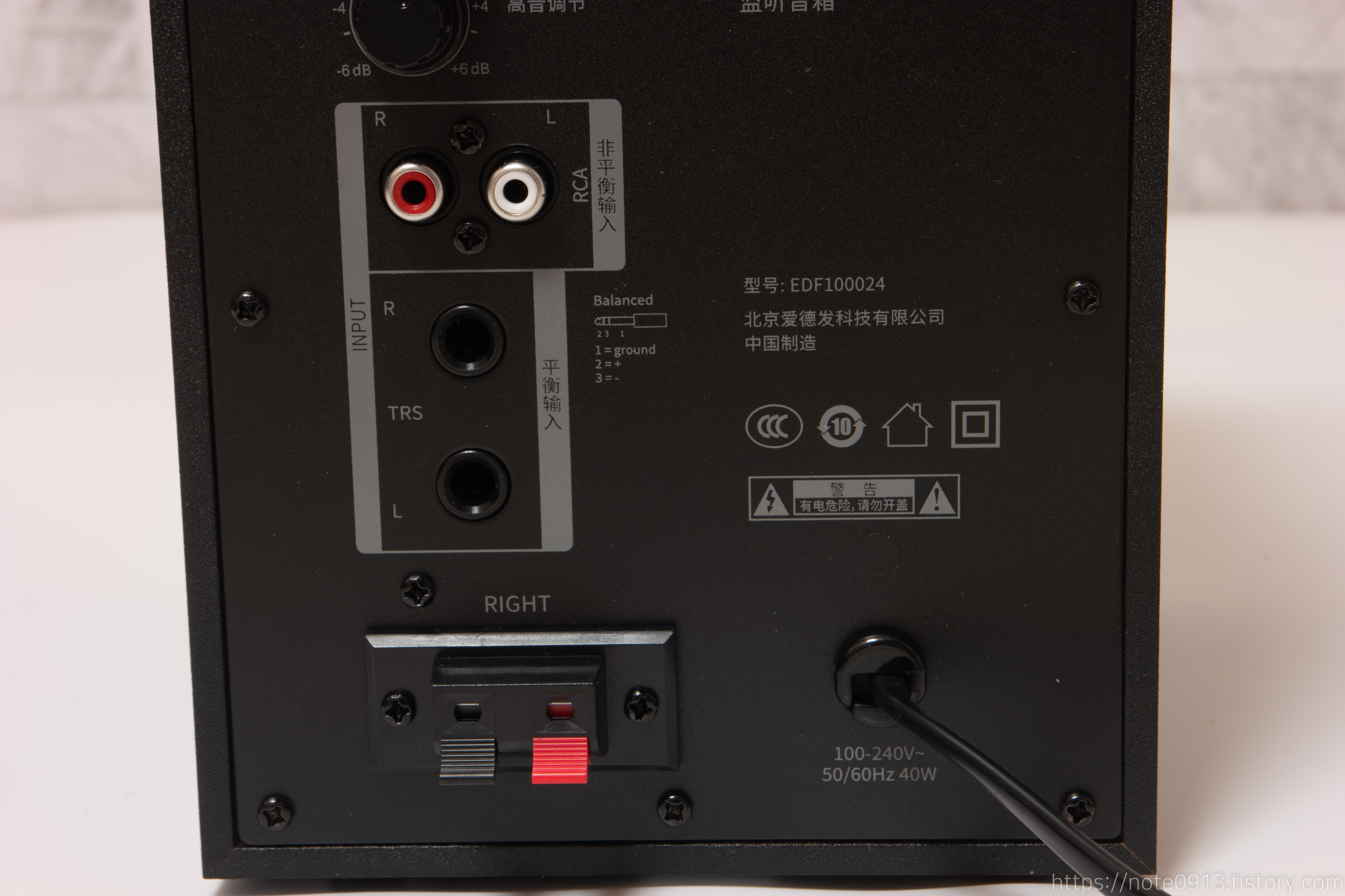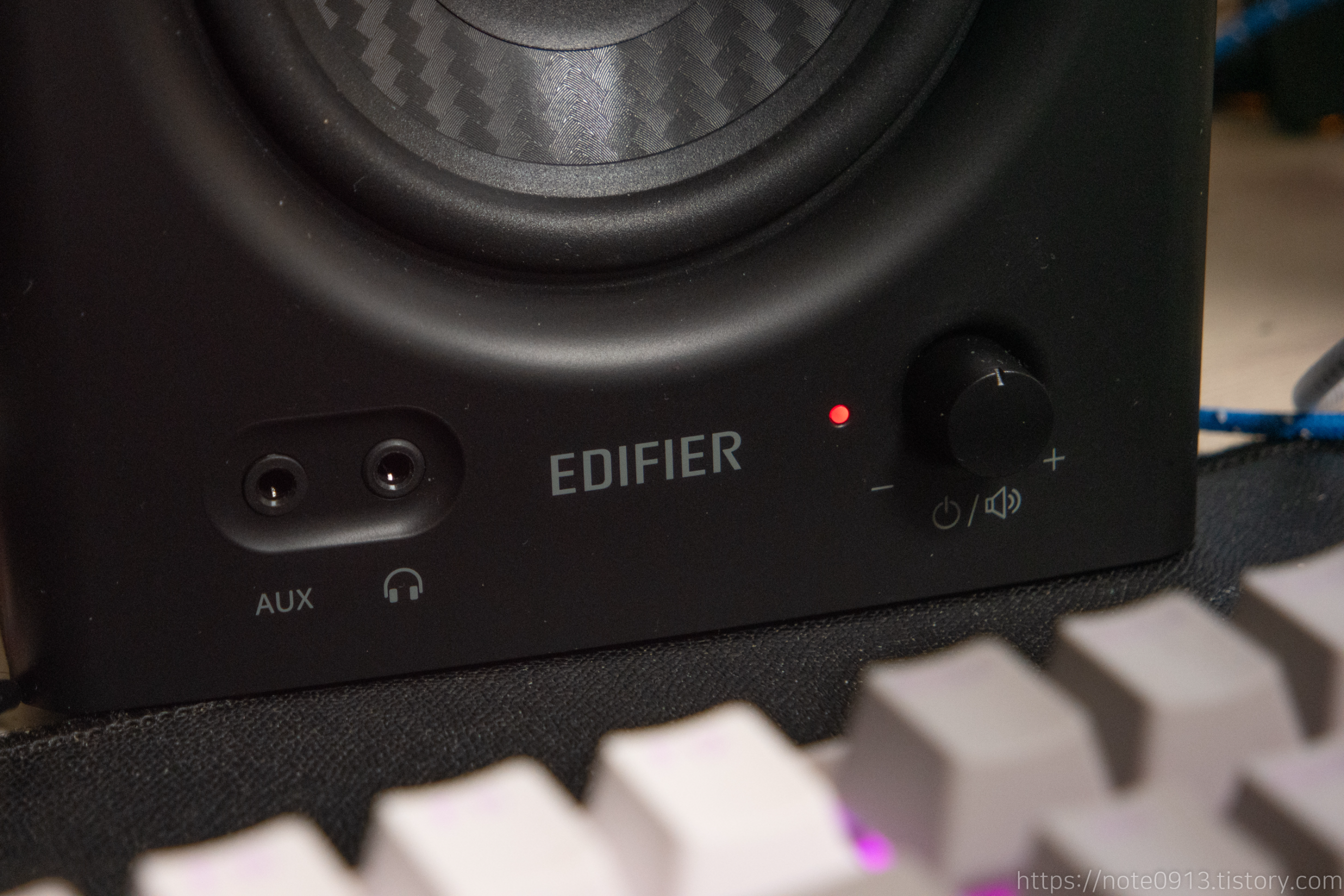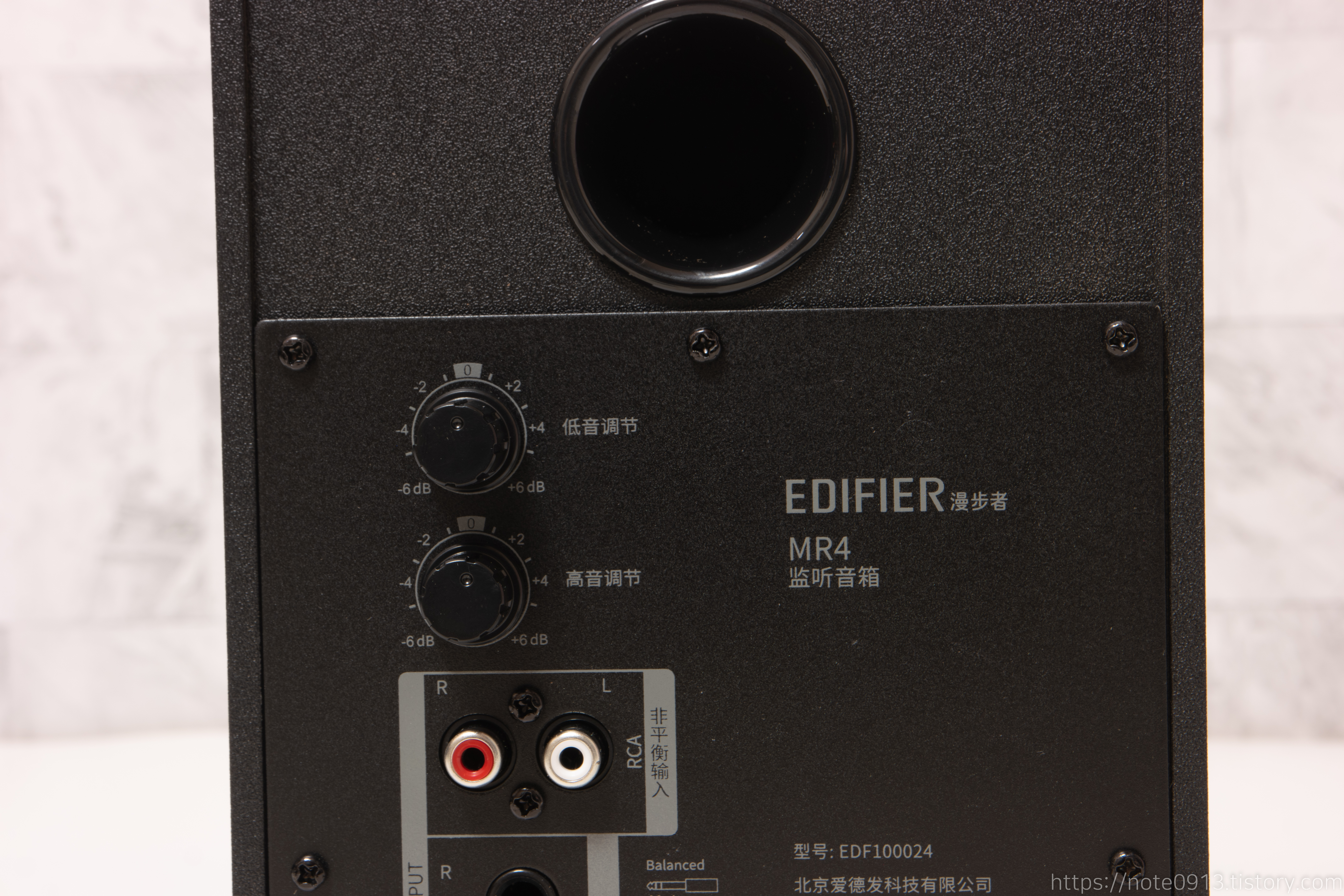 인터넷에 찾아보면 에디파이어 MR4 스피커 자체 화이트 노이즈가 심하다는 말이 있었는데 제가 받은 스피커는 아무 선도 연결하지 않은 채 화이트 노이즈를 들어보면 작게 들리네요. 노브를 최대로 키워도 노이즈가 조금만 커져서 거슬리지 않습니다.
