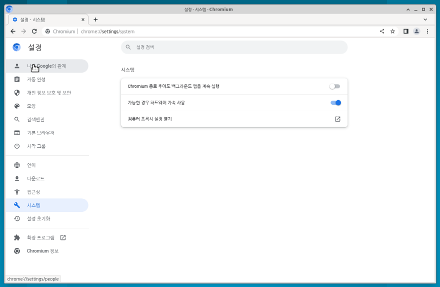 그래서 바로 크로미움 설정에 들어가서 "Chromium 종료 후에도 백그라운드 앱을 계속 실행" 옵션을 꺼주었습니다.