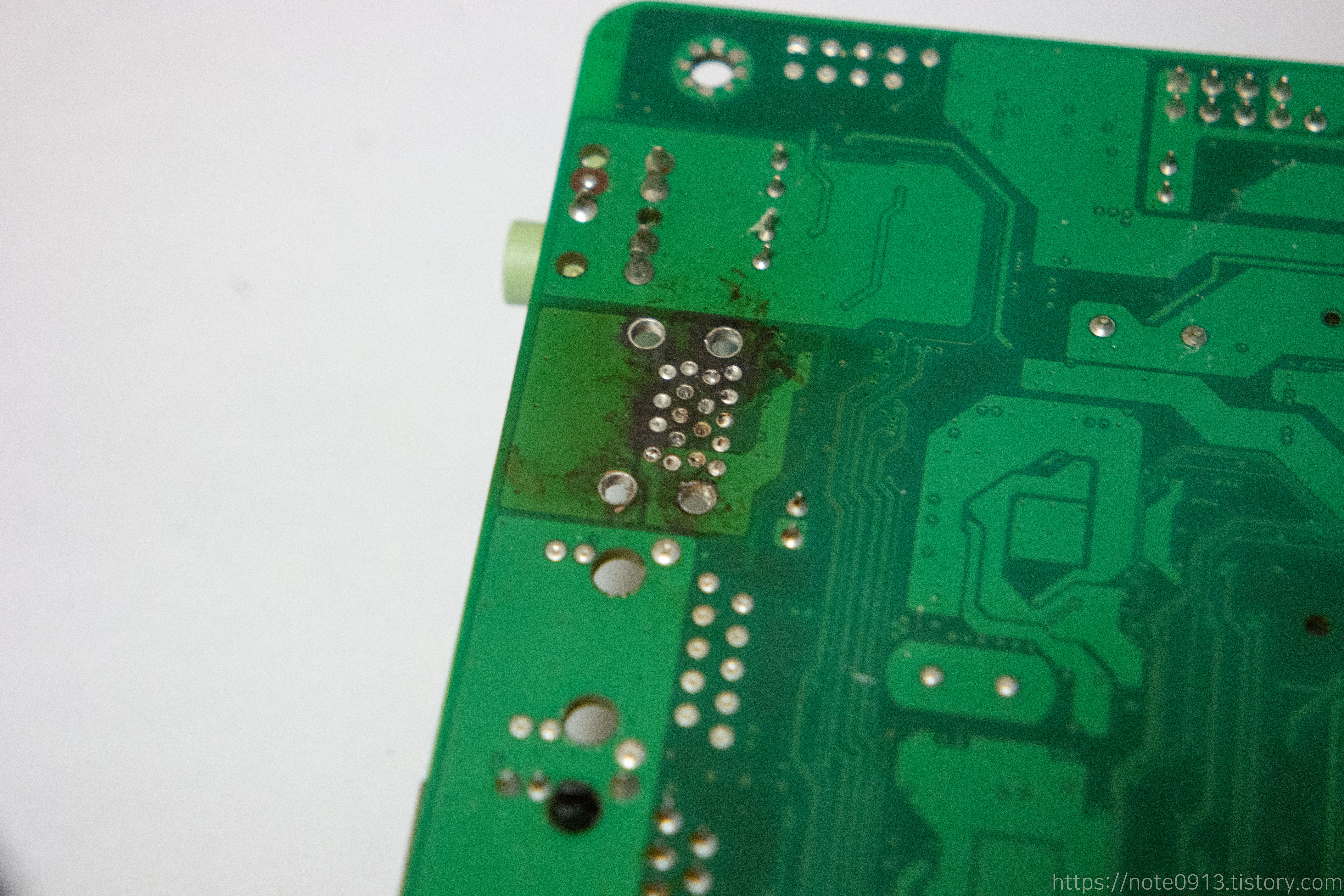 히팅건 온도를 380~390℃ 정도로 맞추고 납 흡입기로 제거해가면서 USB 단자를 제거했습니다. 다만 탄 자국이 조금 남았습니다. 히팅건의 온도가 높아서 기판이 탄건지 아니면 묻혀놓은 플럭스를 제거하지 않고 히팅건을 사용해서 플럭스가 탄건지 모르겠네요.