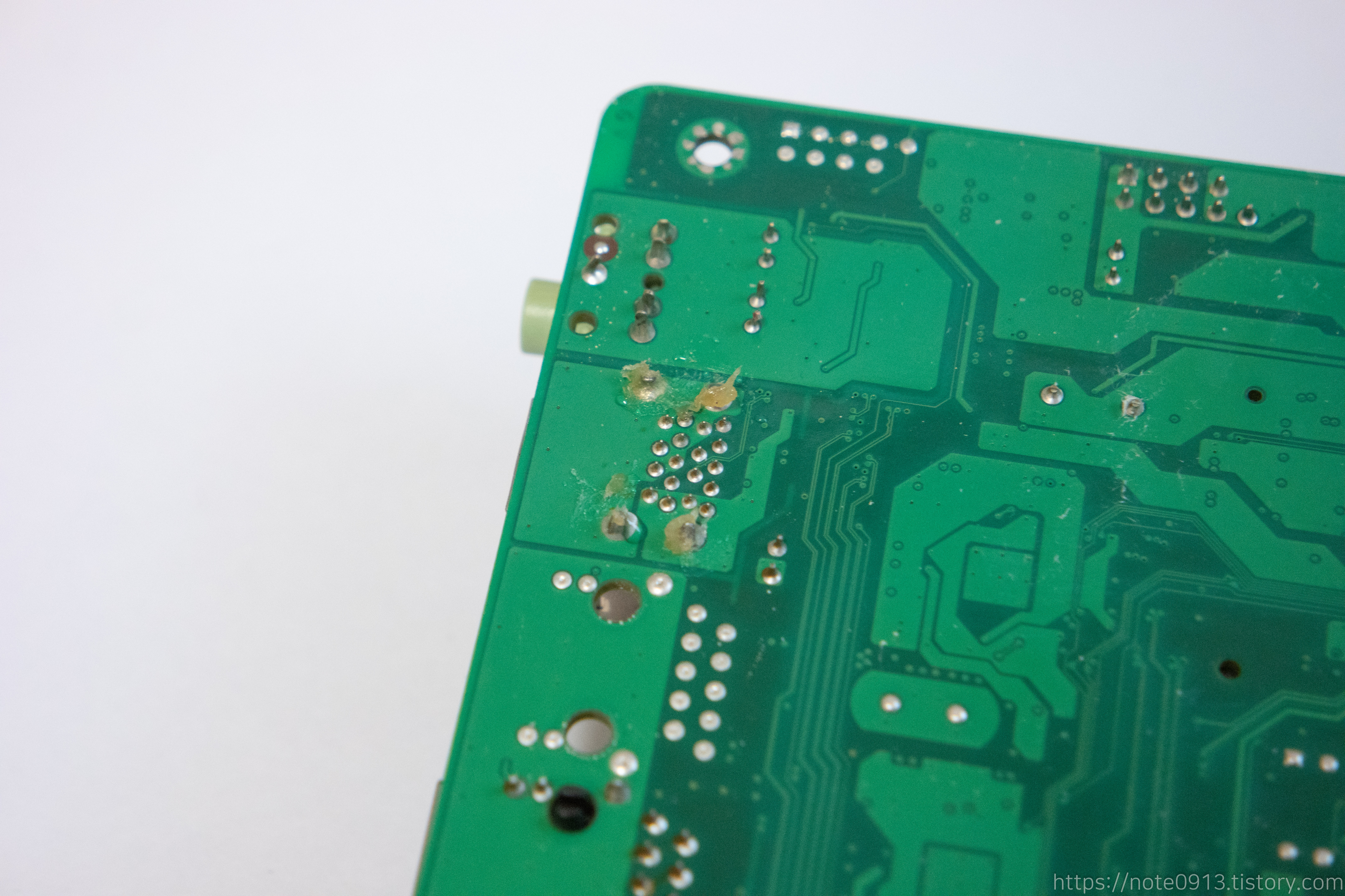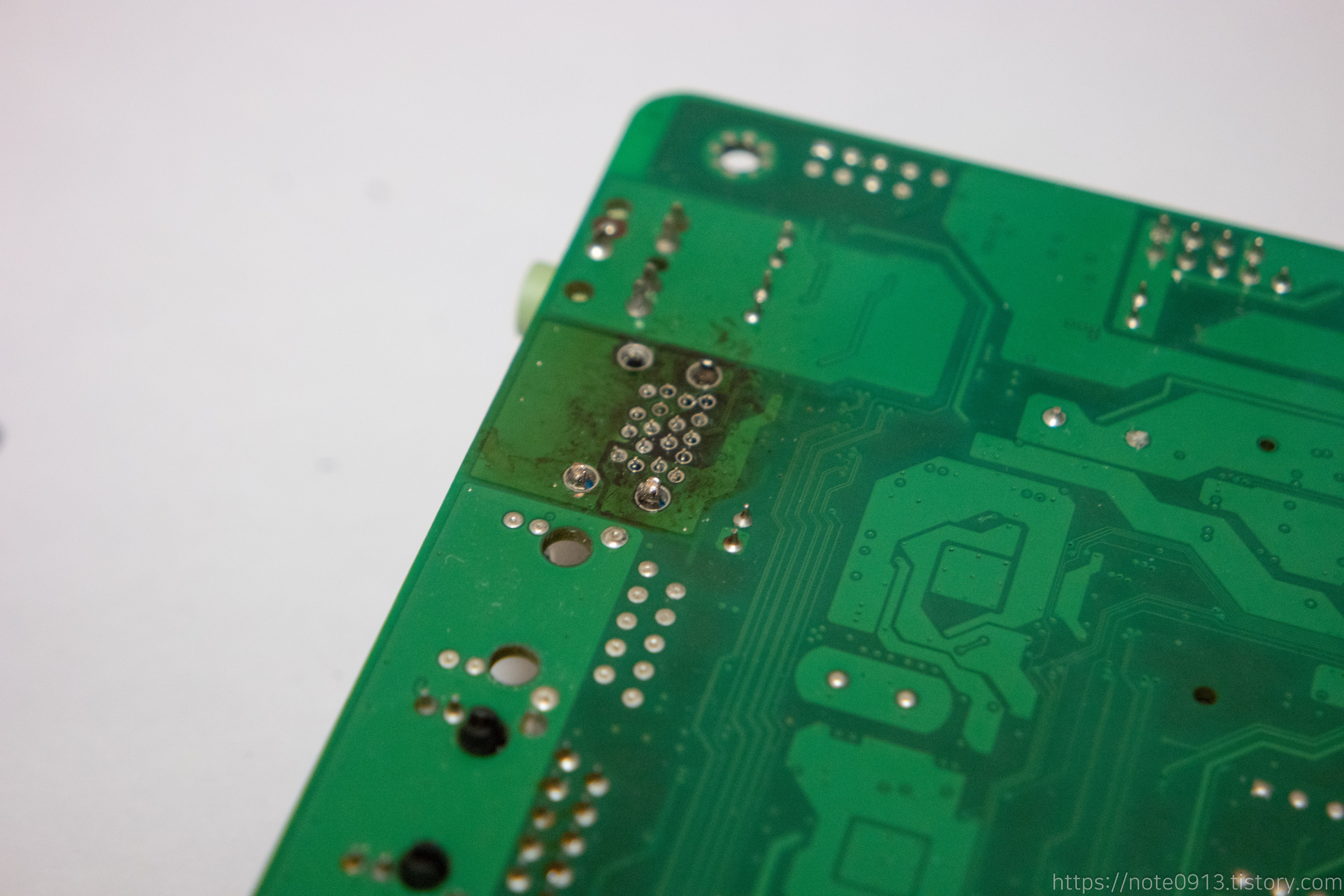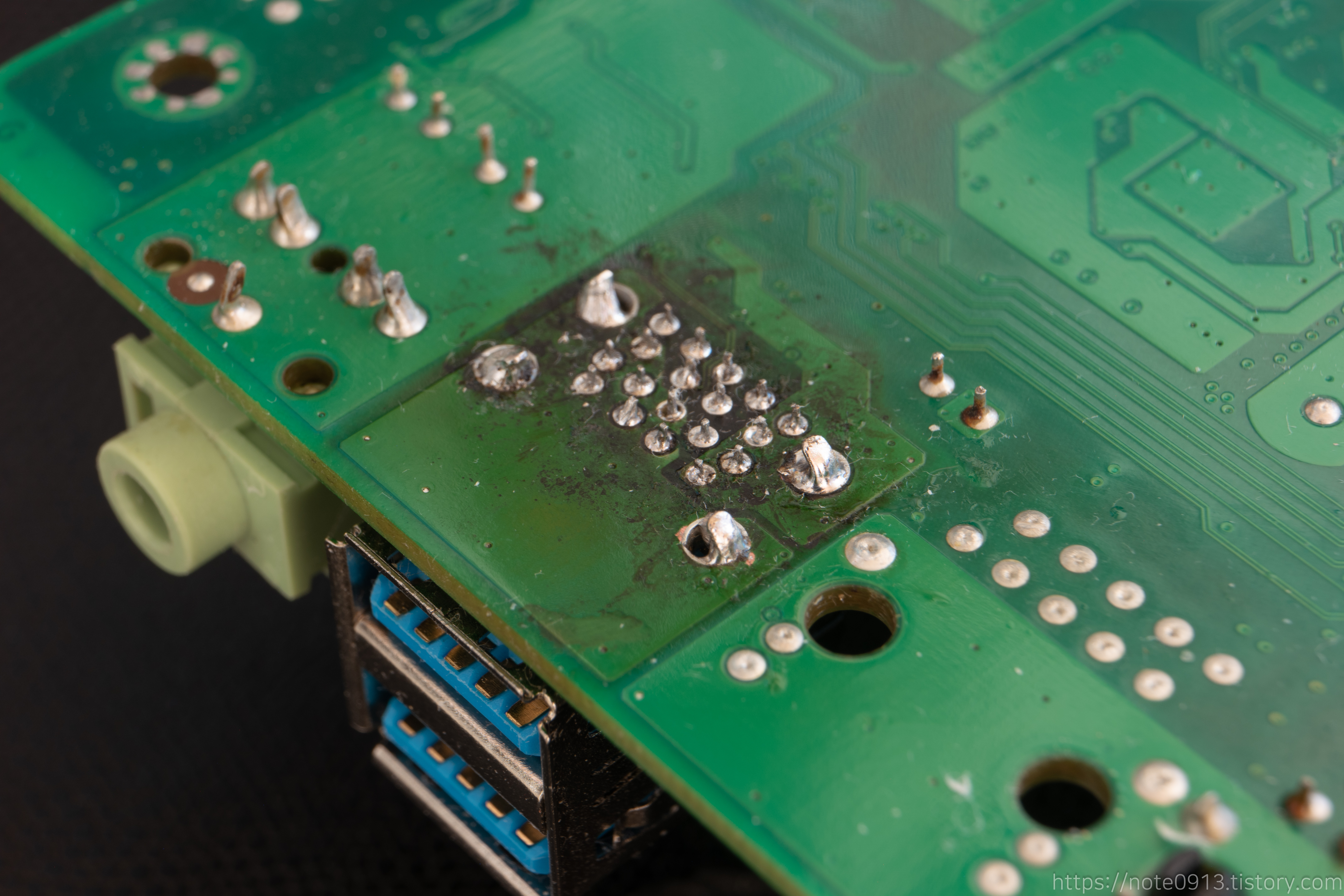 히팅건 온도를 380~390℃ 정도로 맞추고 납 흡입기로 제거해가면서 USB 단자를 제거했습니다. 다만 탄 자국이 조금 남았습니다. 히팅건의 온도가 높아서 기판이 탄건지 아니면 묻혀놓은 플럭스를 제거하지 않고 히팅건을 사용해서 플럭스가 탄건지 모르겠네요.