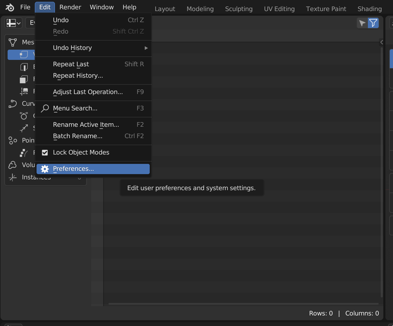 우선 환경설정으로 이동하기 위해서 블렌더 상단에 있는 메뉴에서 Edit(편집) 메뉴를 클릭합니다. 그 다음 환경설정인 Preferences 를 클릭해줍니다.