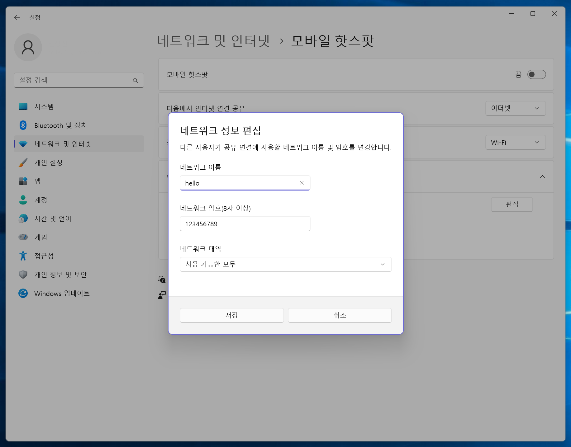 모바일 핫스팟에서 각종 설정을 할 수 있습니다.
