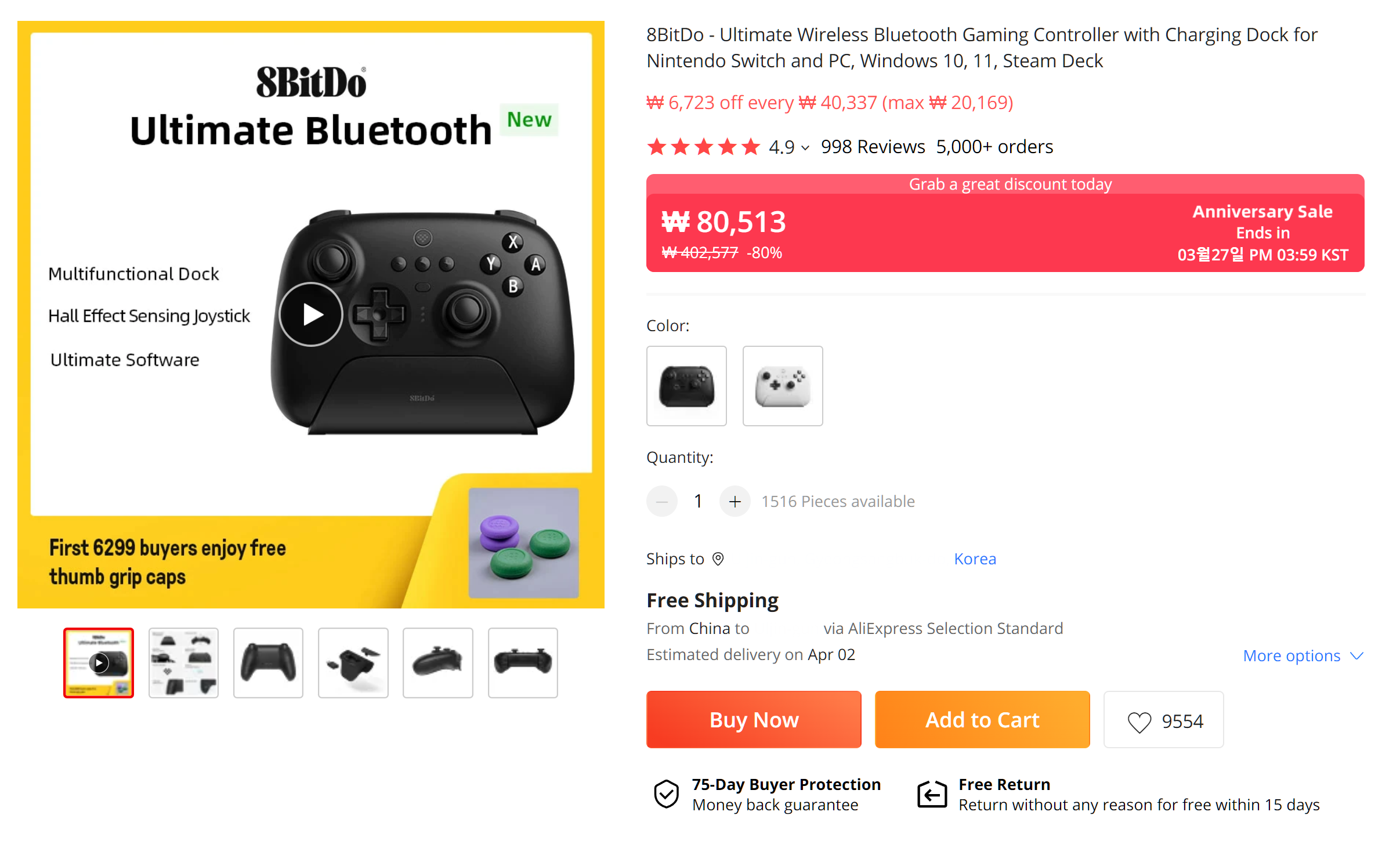 알리익스프레스 13주년 기념 세일을 시작했습니다. 세일 품목 중에 8bitdo의 Ultimate Bluetooth 컨트롤러가 있더라구요. 이 제품을 알게된건 3개월 정도되었는데 가격도 비싸고 구하기 어려워서 그냥 보고만 있었는데 마침 이렇게 판매를 하길래 고민 좀 하다가 구매했습니다.