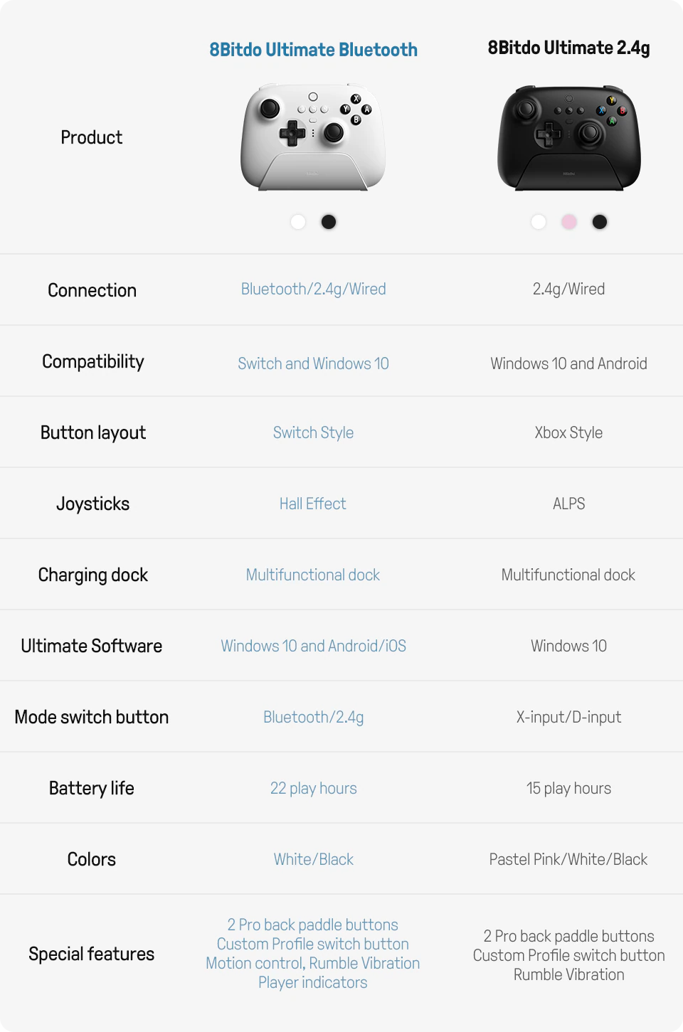8bitdo의 Ultimate 컨트롤러는 2가지 버진이 있는데 하나는 2.4GHz 무선 버전과 블루투스 + 2.4GHz 둘 다 지원하는 버전이 있습니다.